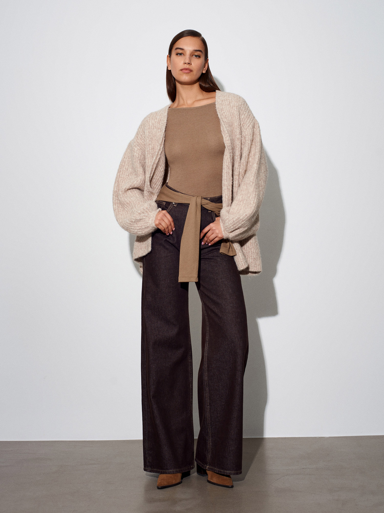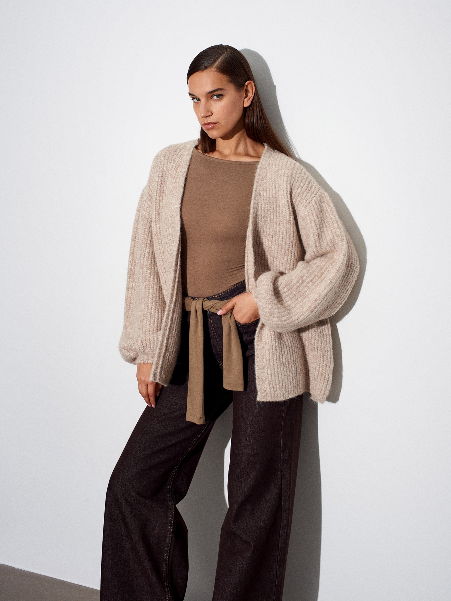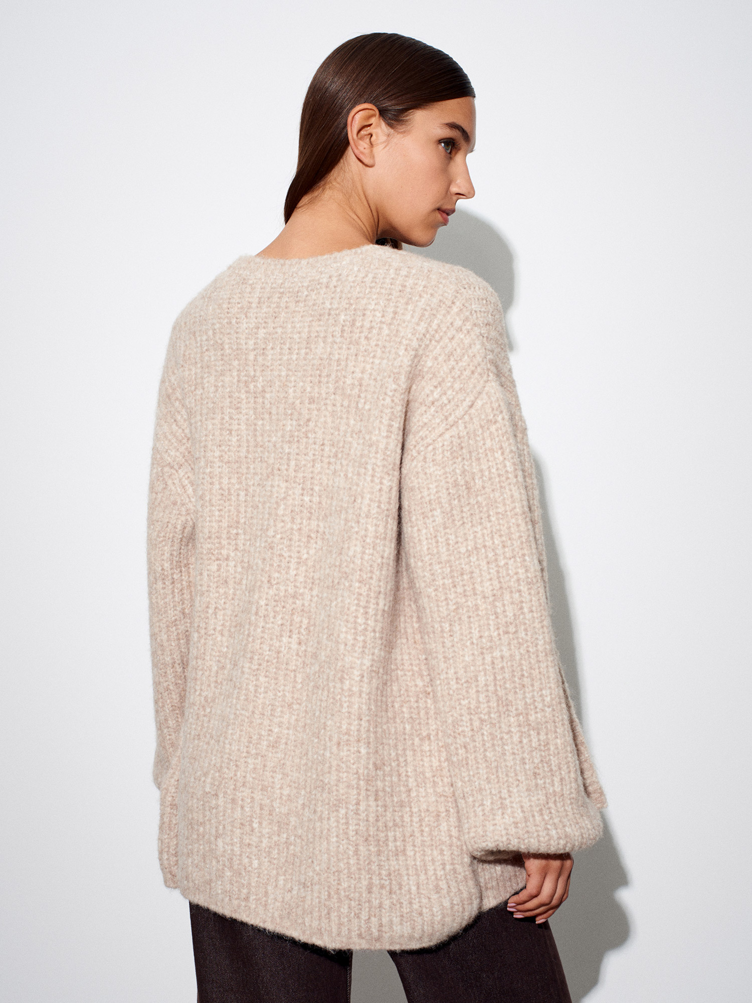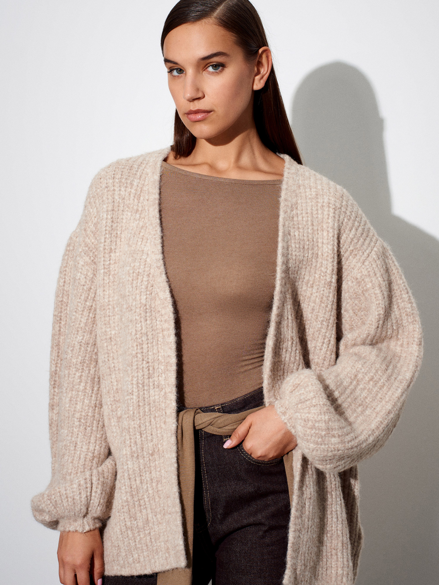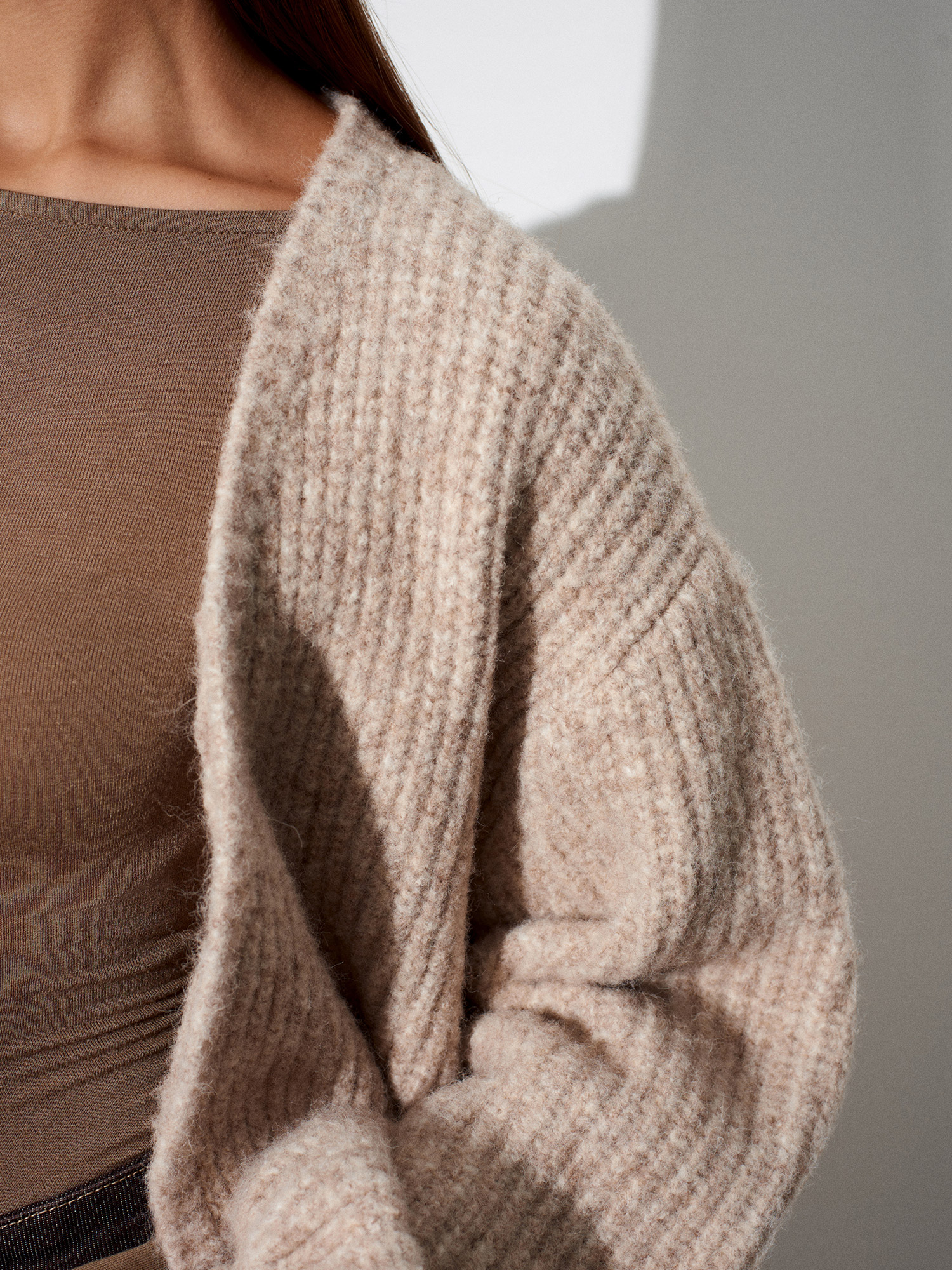60991 Yumuşak Dokulu Dökümlü Triko Hırka-Bej Melanj