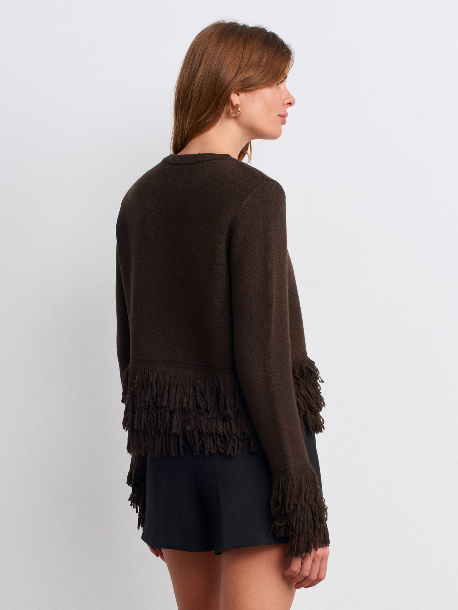 60993 Kolu Püsküllü Triko Hırka-Kahve