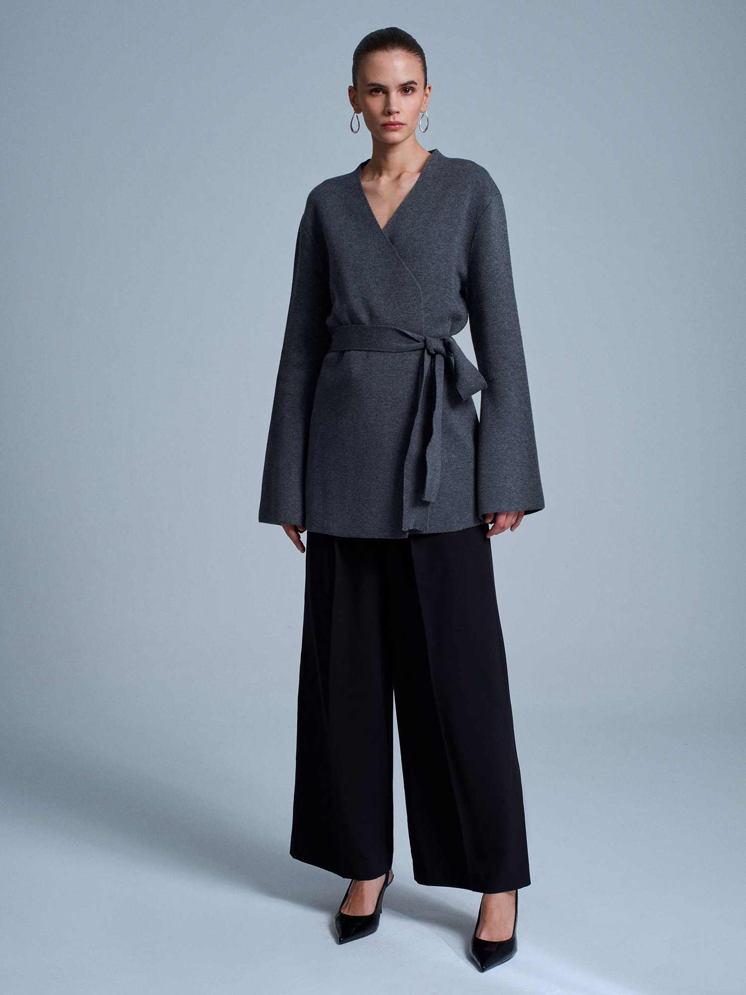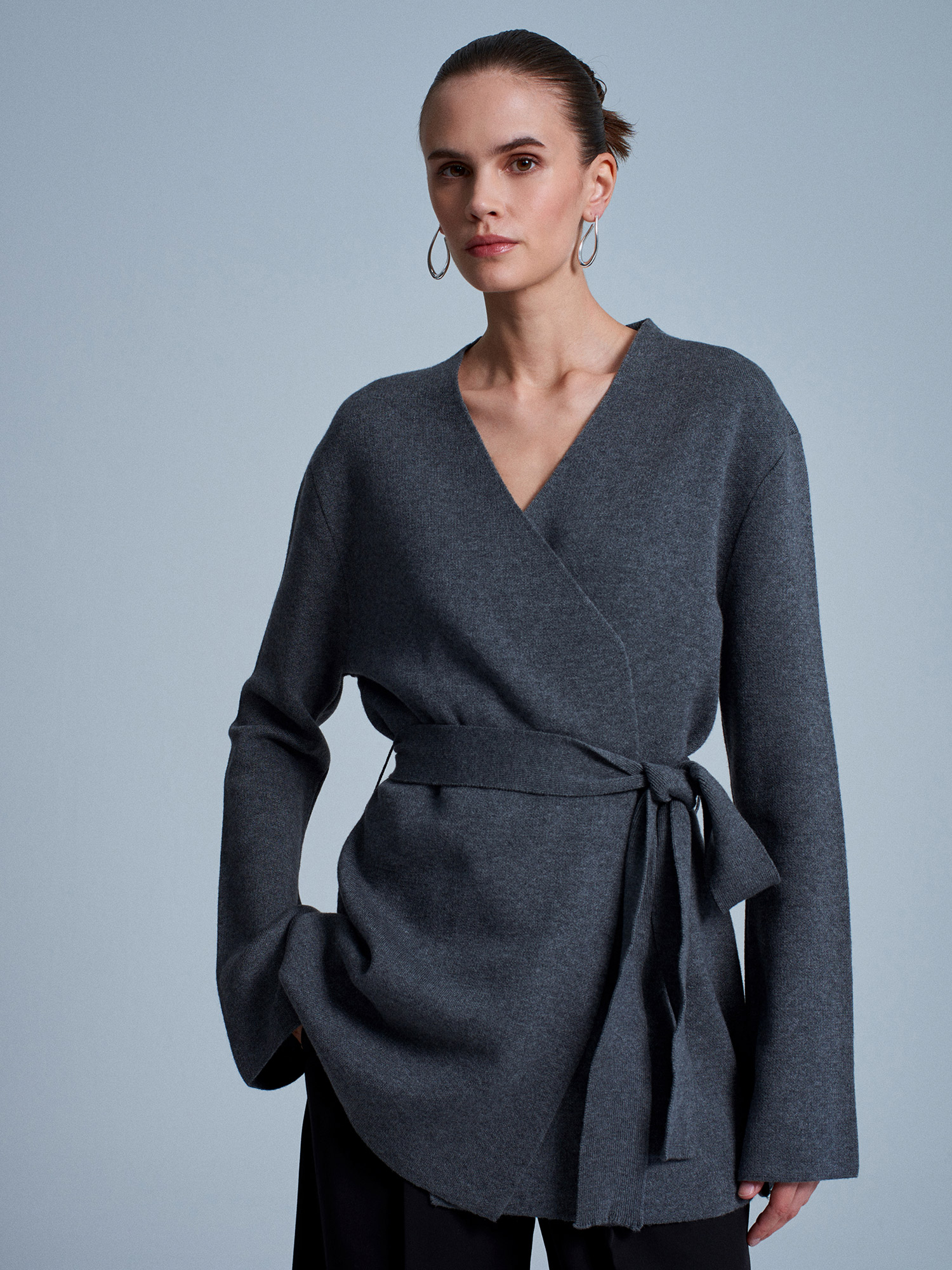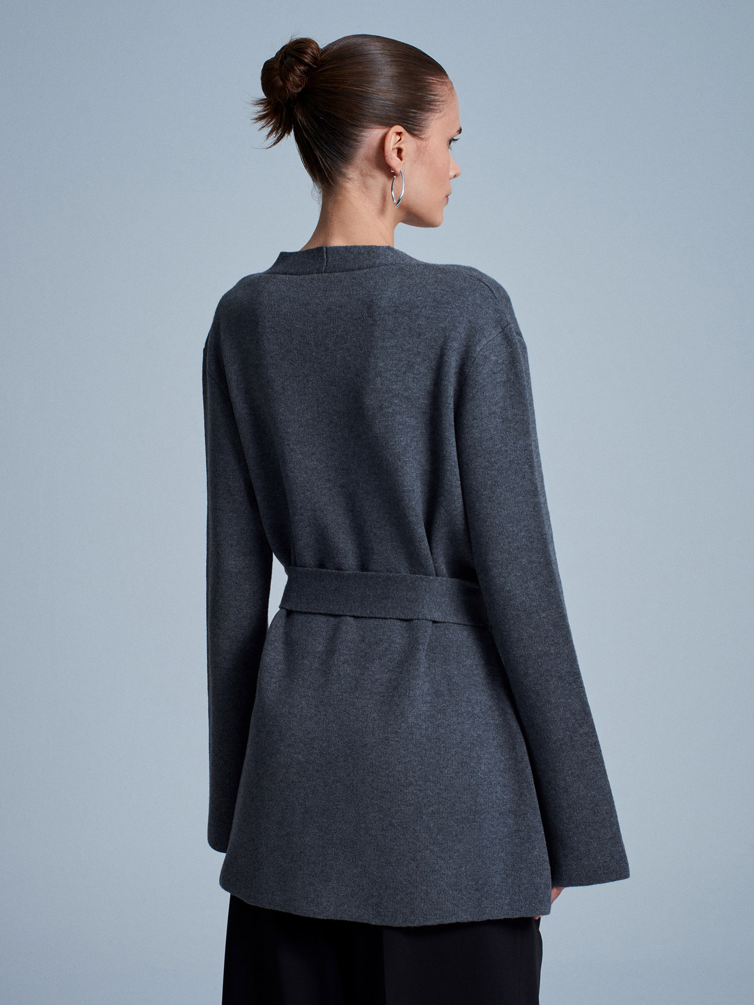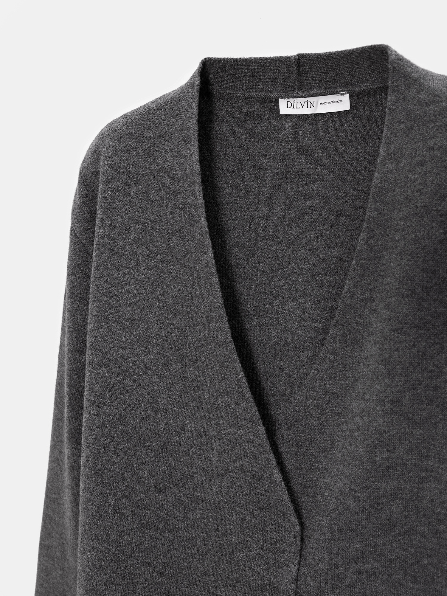 61002 Kruvaze Kemerli Yün Karışımlı Triko Hırka-Füme M.