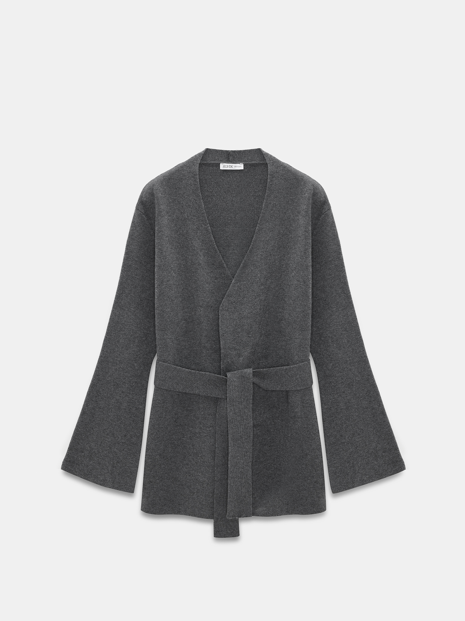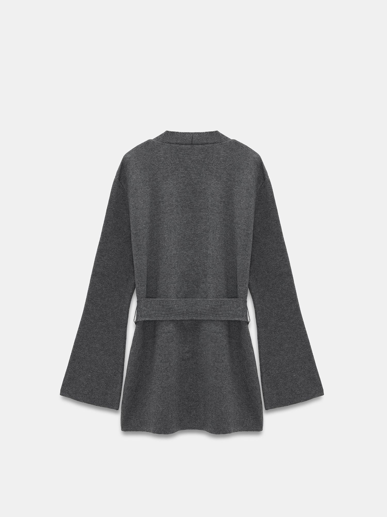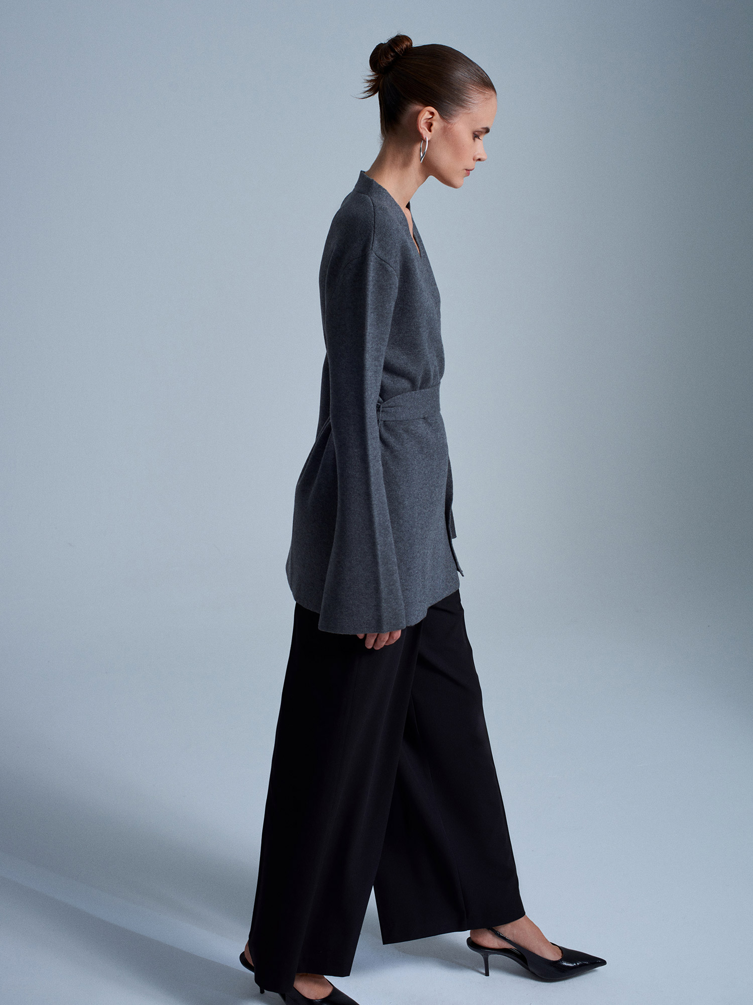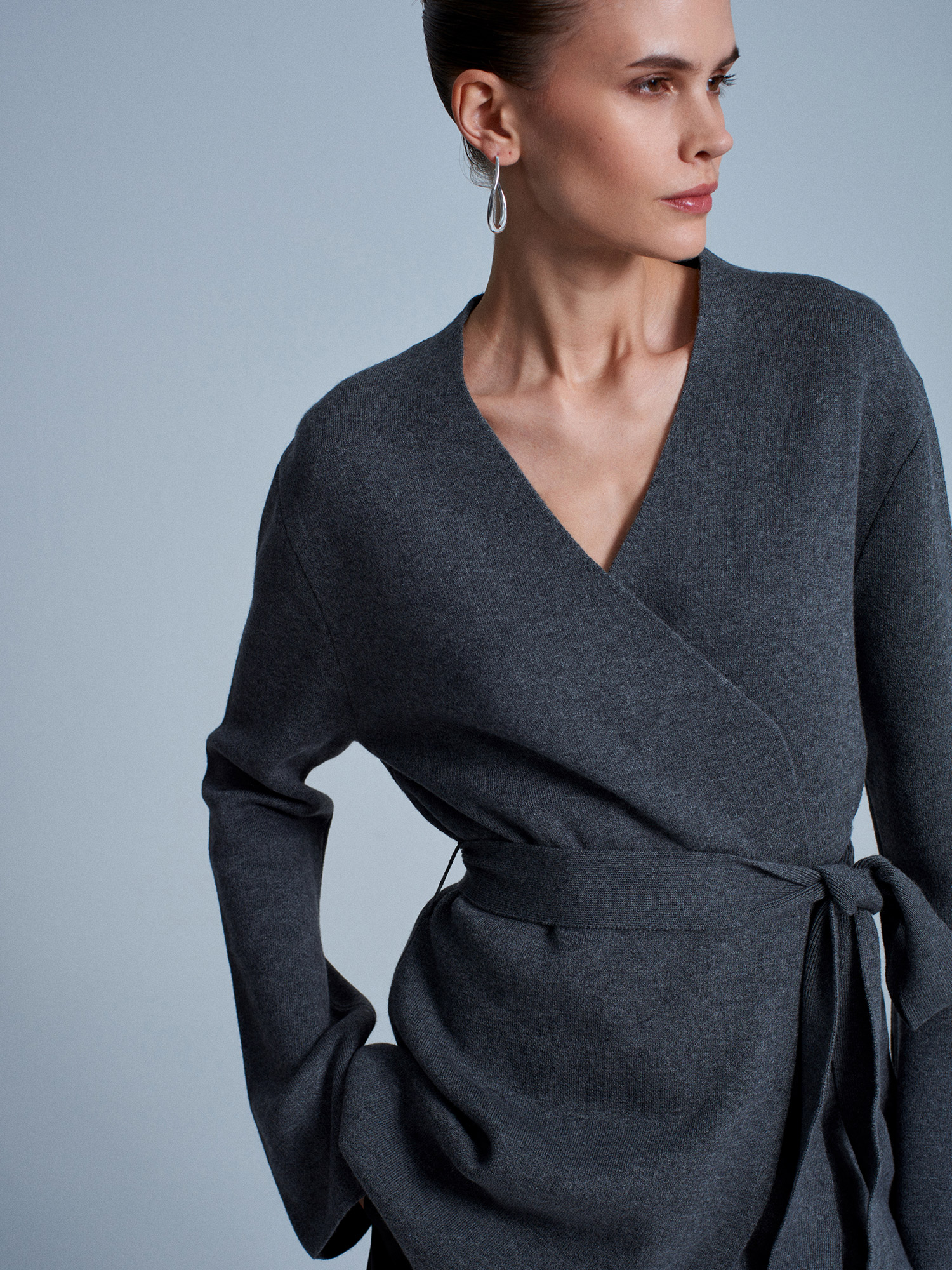 61002 Kruvaze Kemerli Yün Karışımlı Triko Hırka-Füme M.