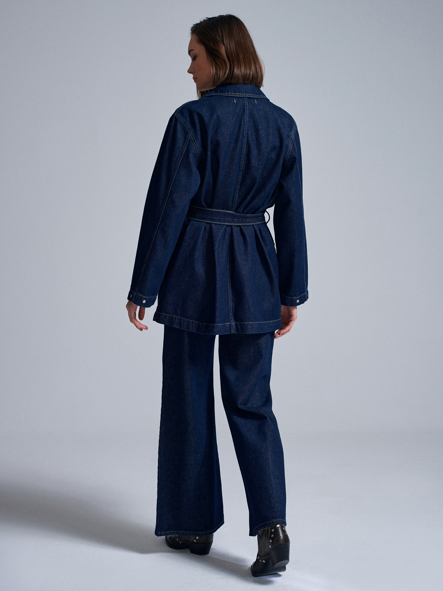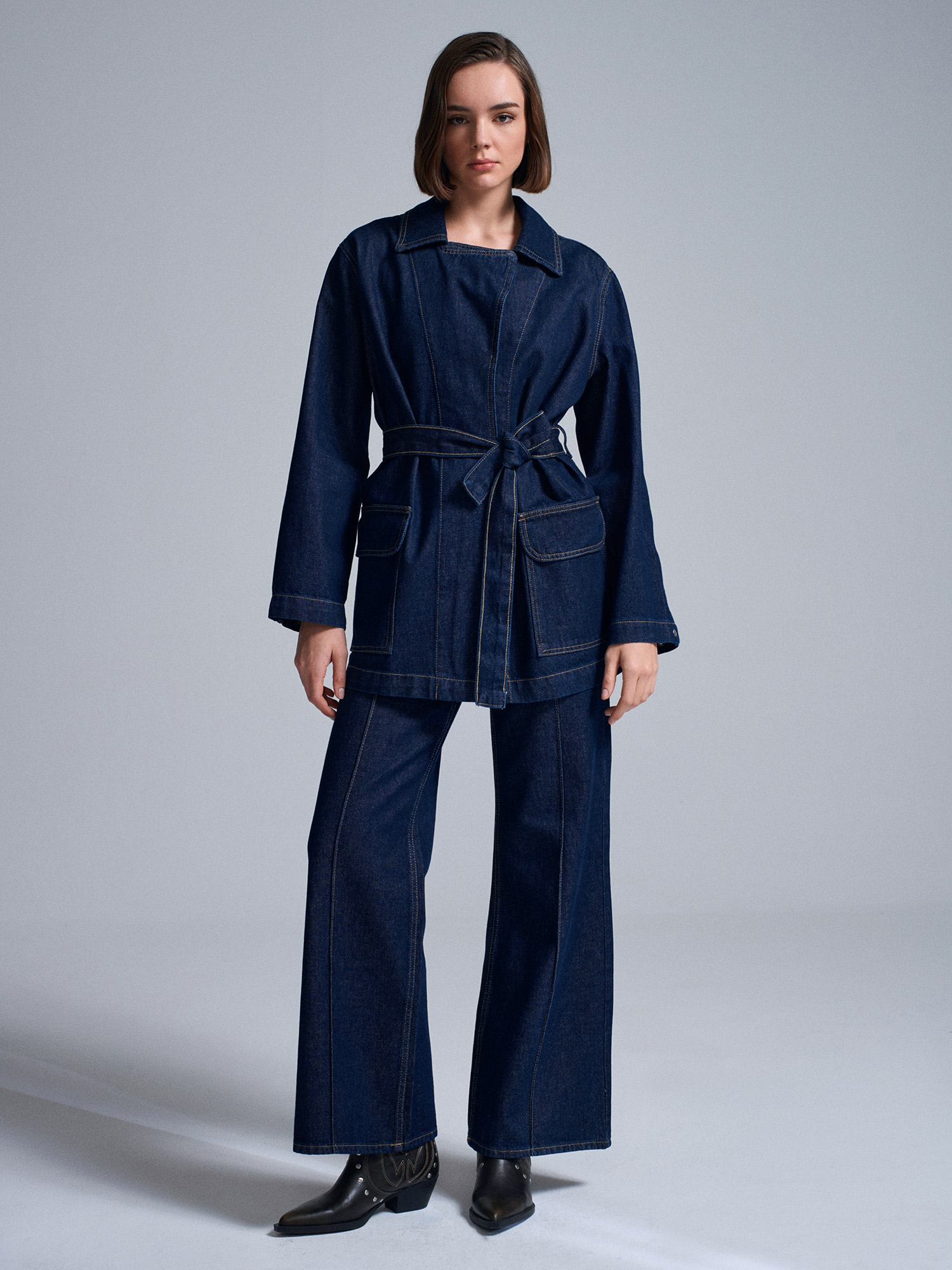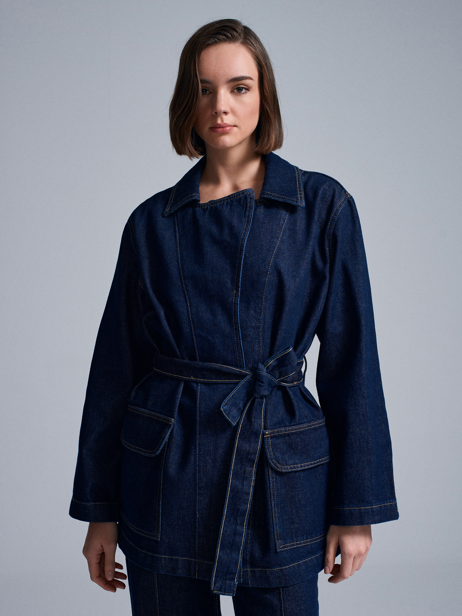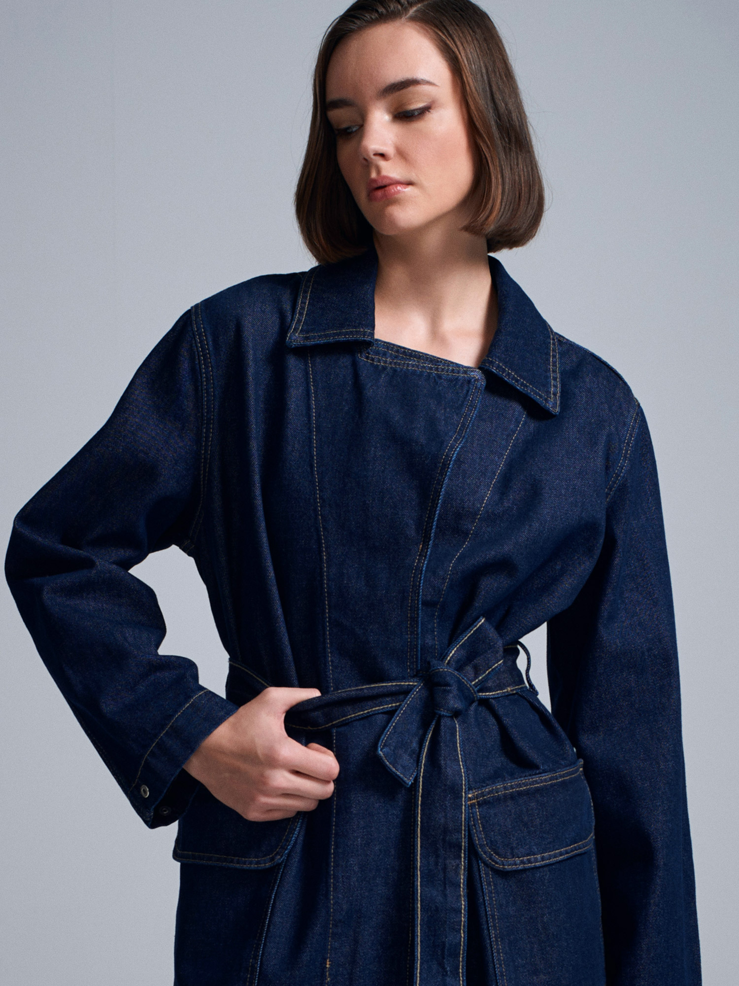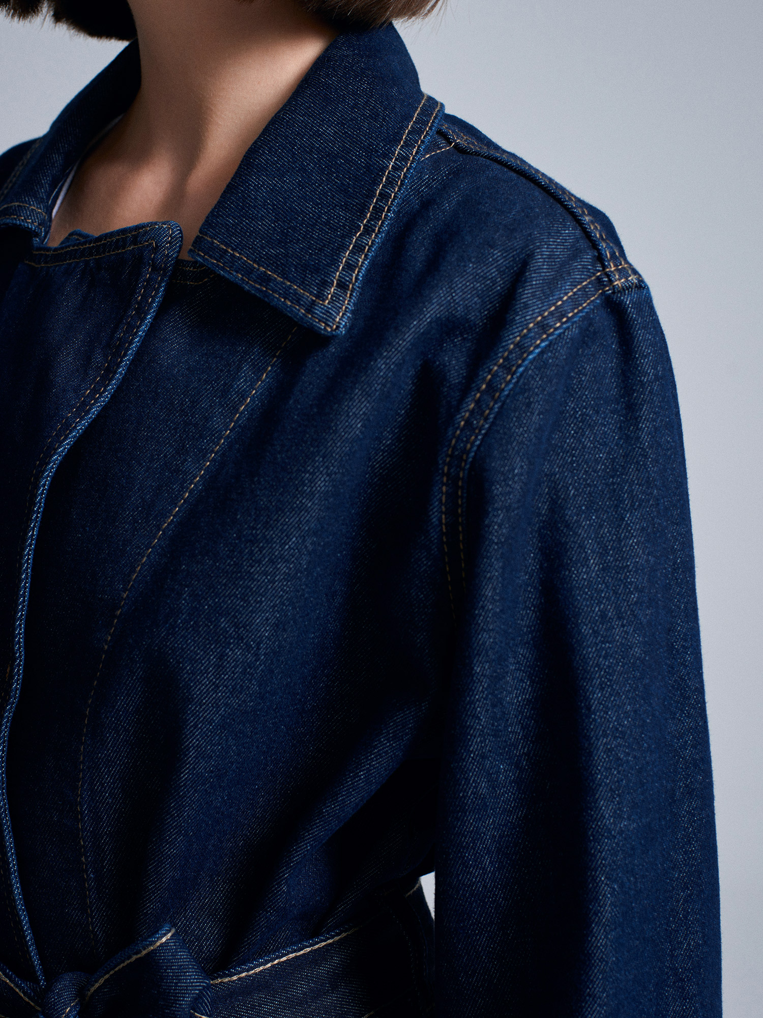 65382 %100 Pamuk Kuşaklı Kot Ceket-Lacivert