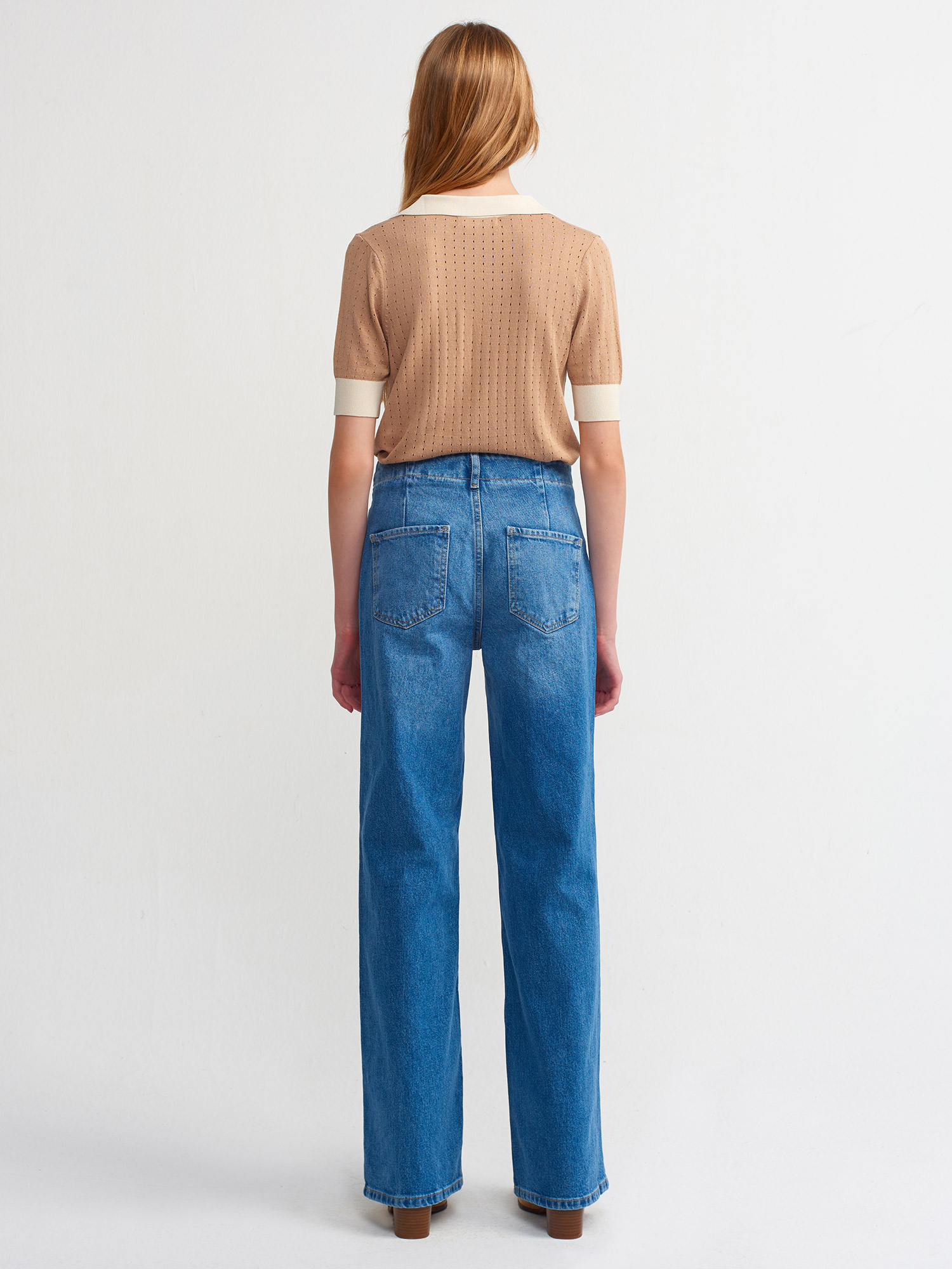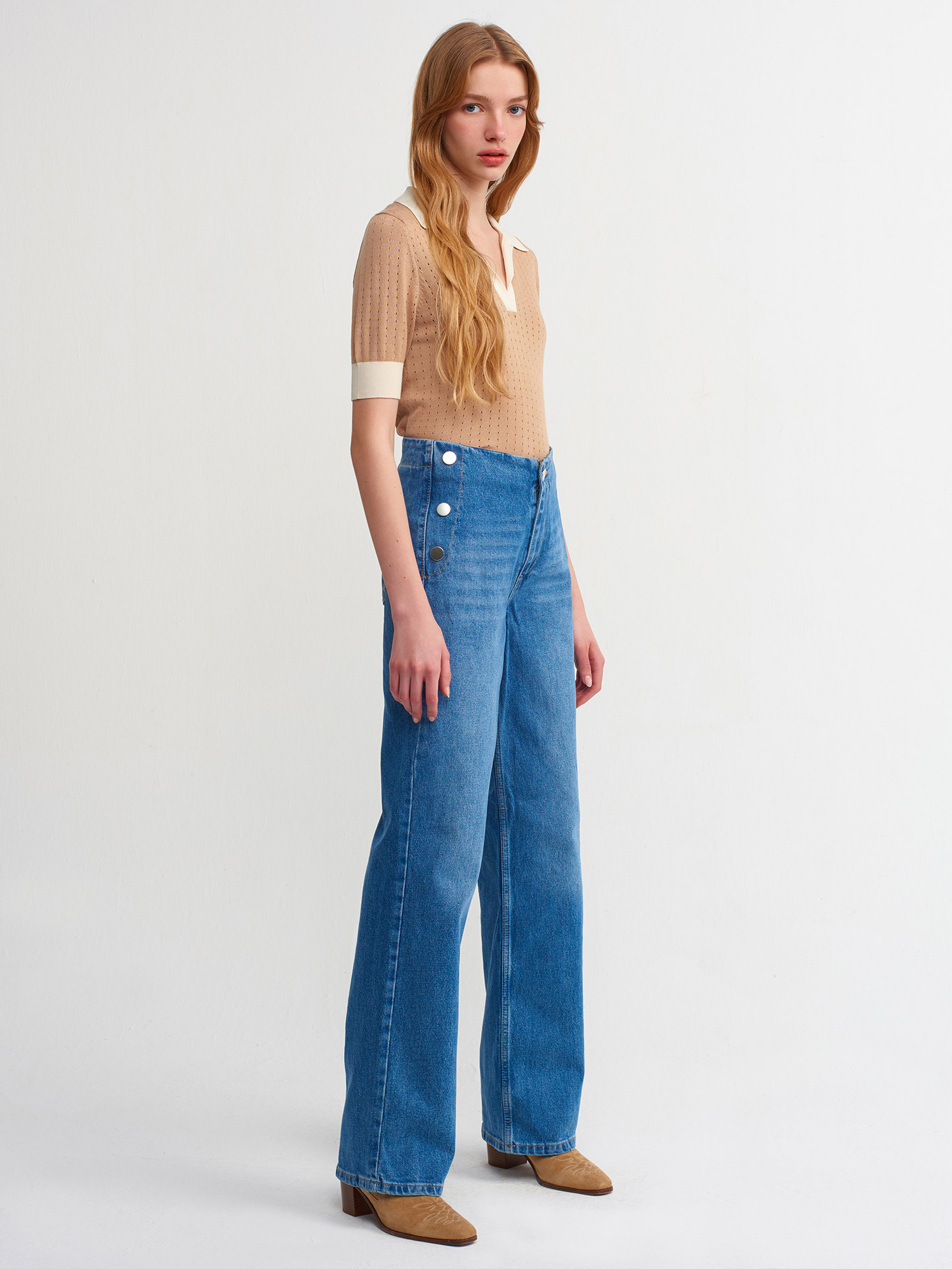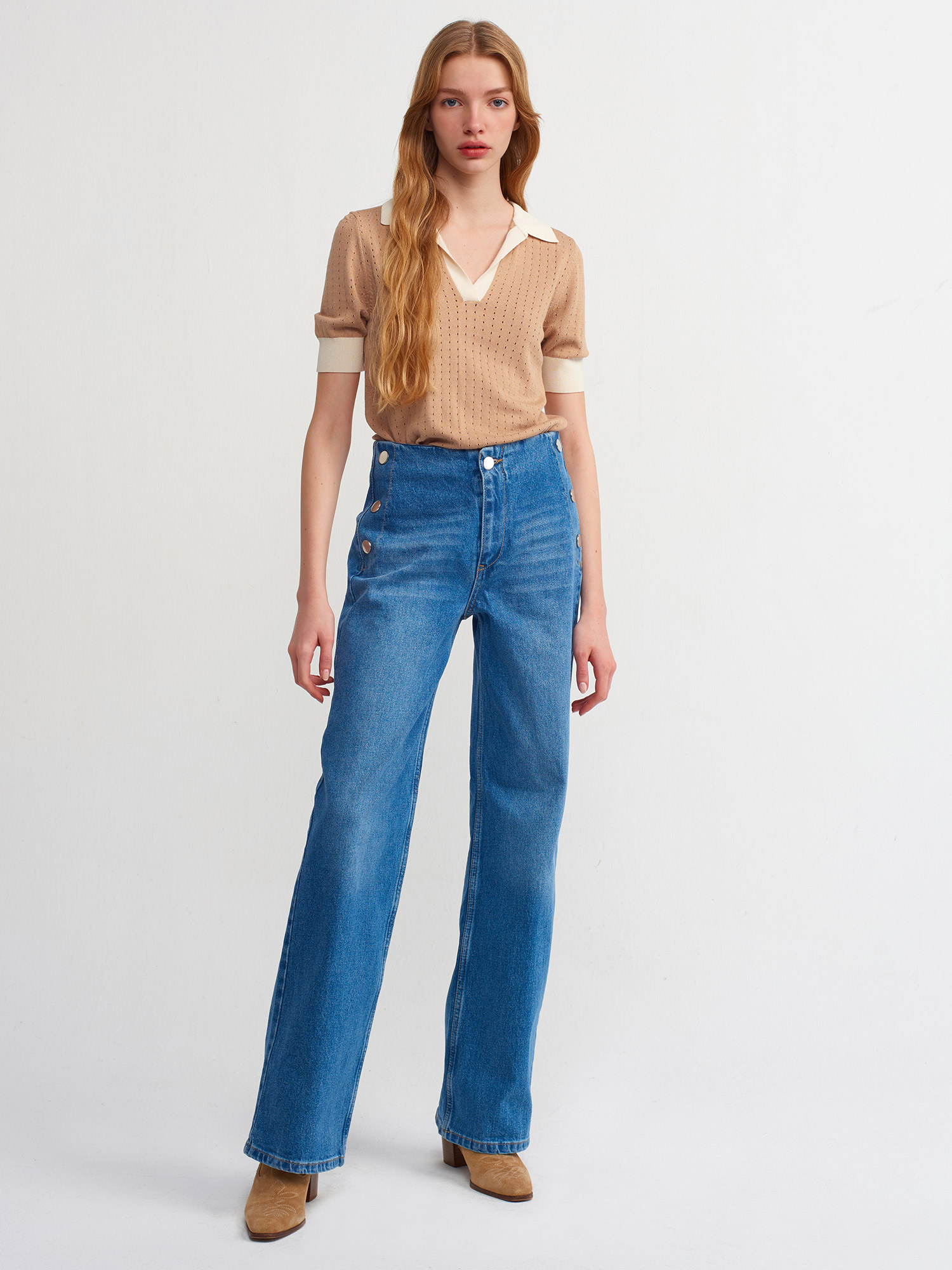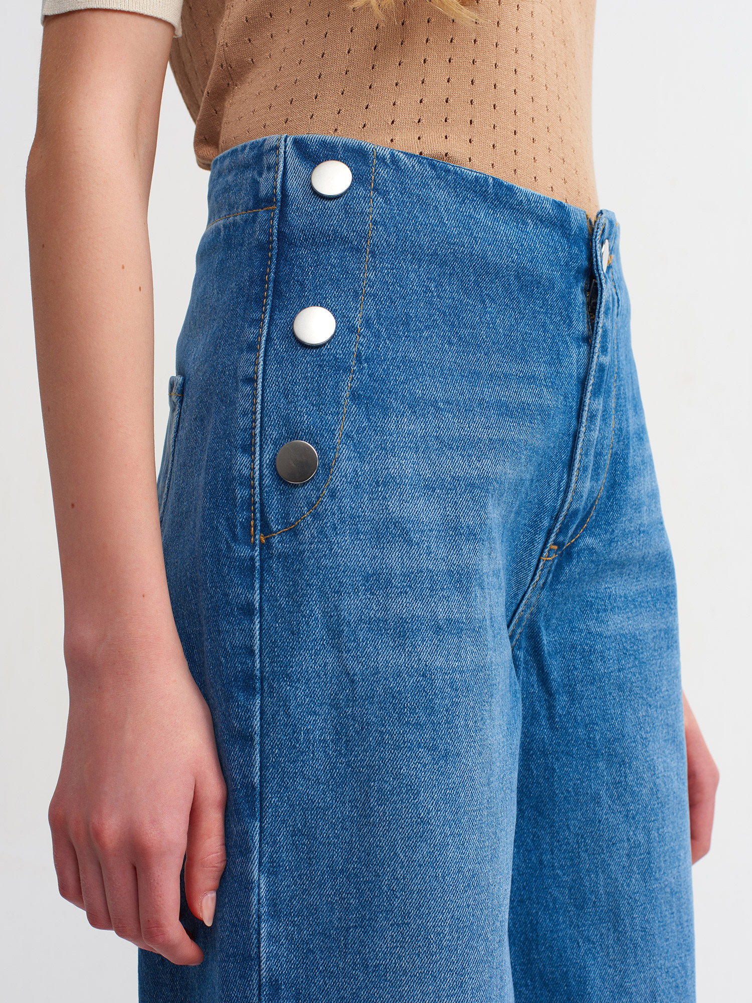 70138 Yan Bölümü Aksesuarlı Wideleg Pantolon-Mavi