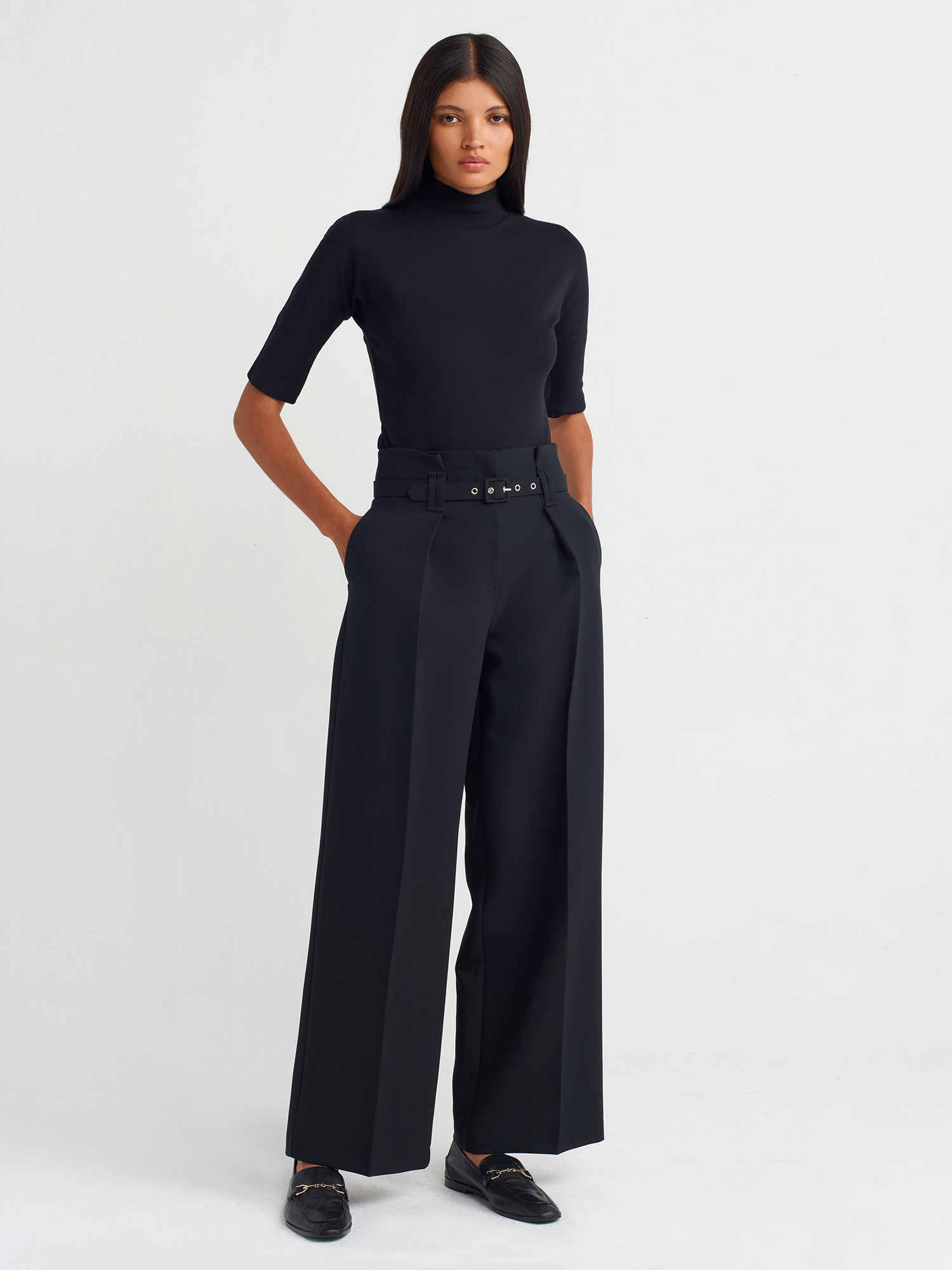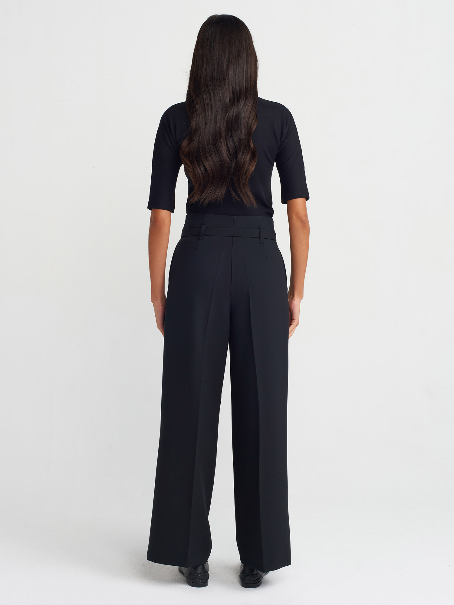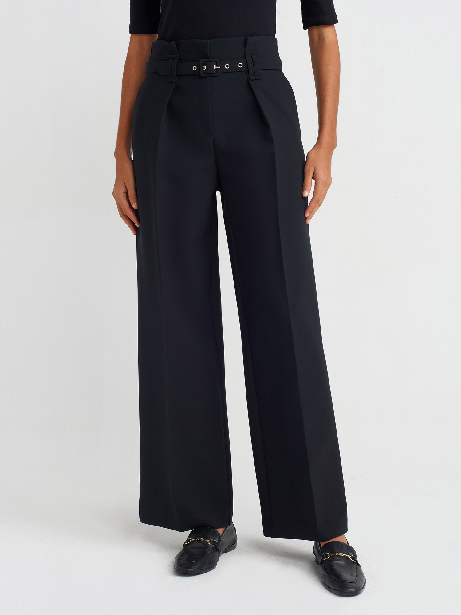 71548 Kemerli Geniş Paça Pantolon-Siyah