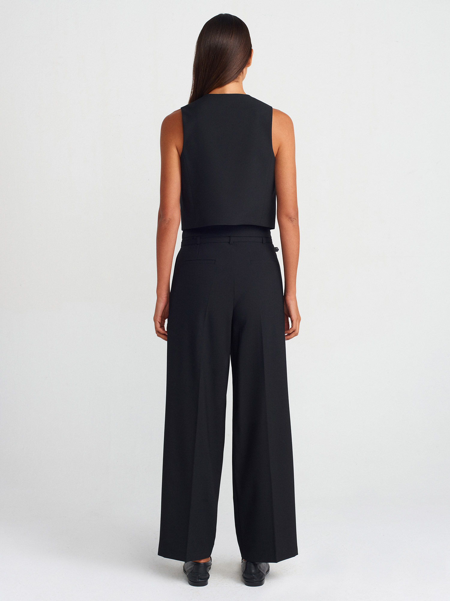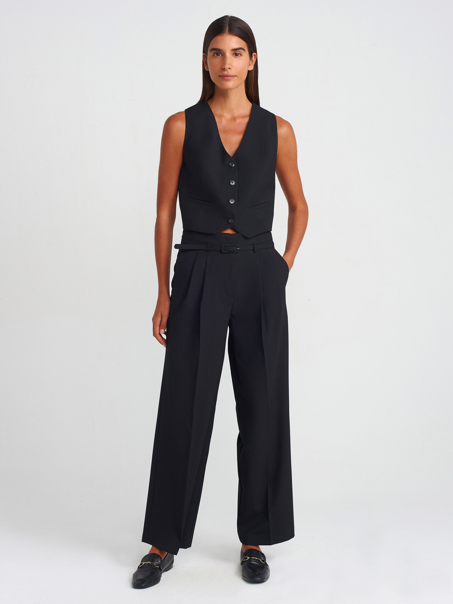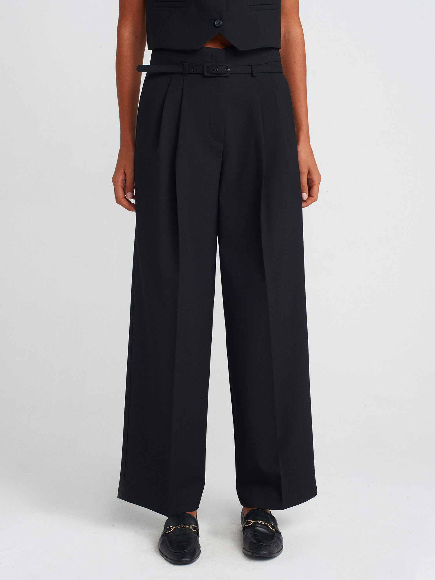 71560 Kemerli Pensli Kumaş Pantolon-Siyah