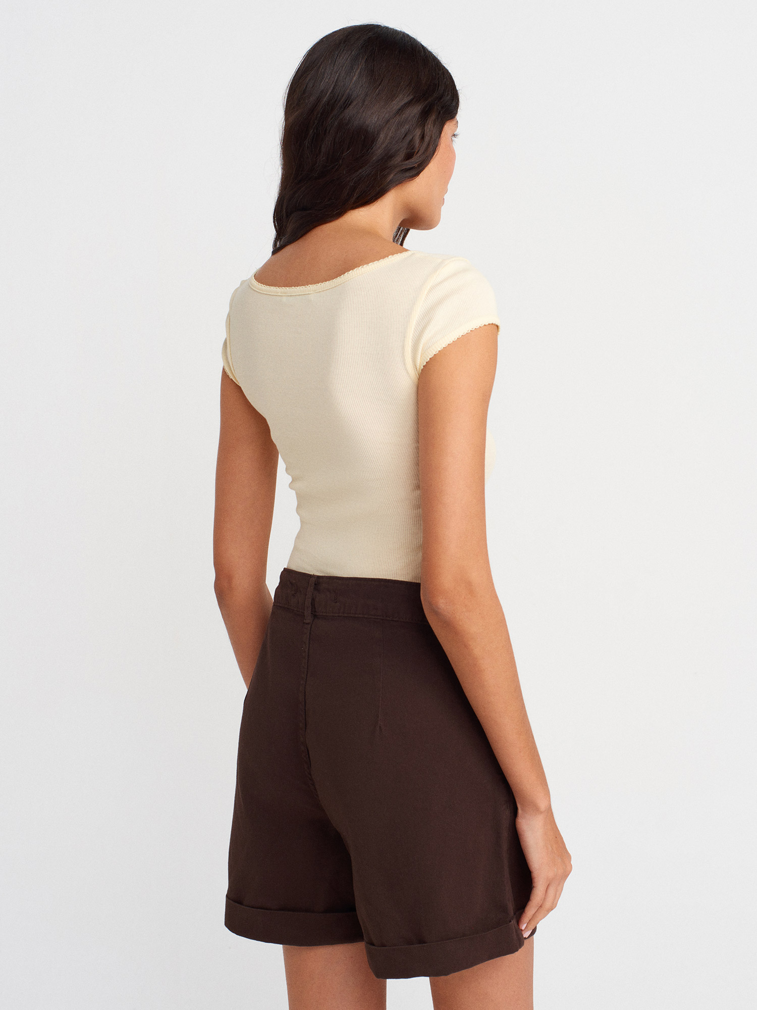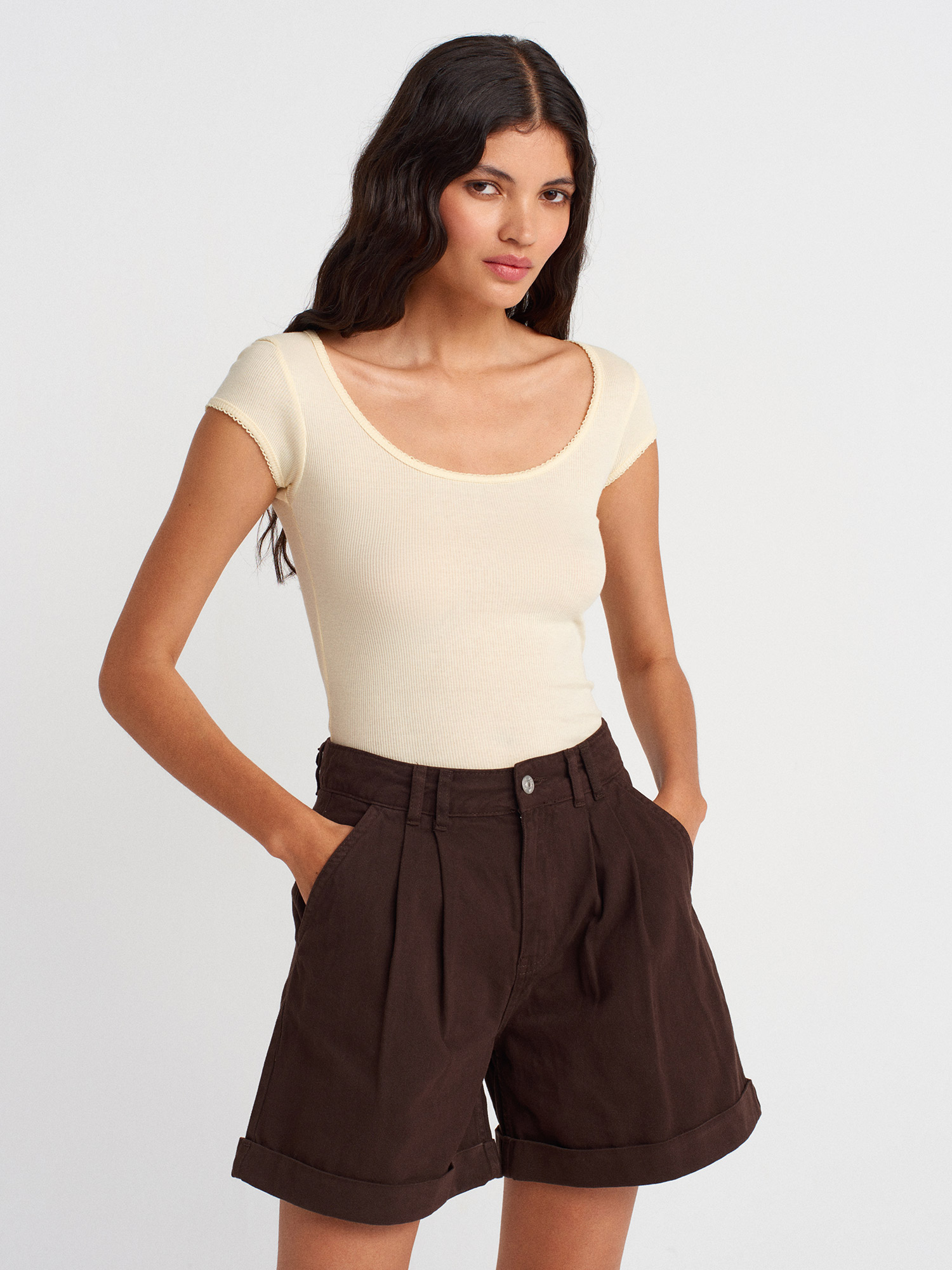71988 Çift Pileli Paçası Kıvrık Denim Şort-Kahve