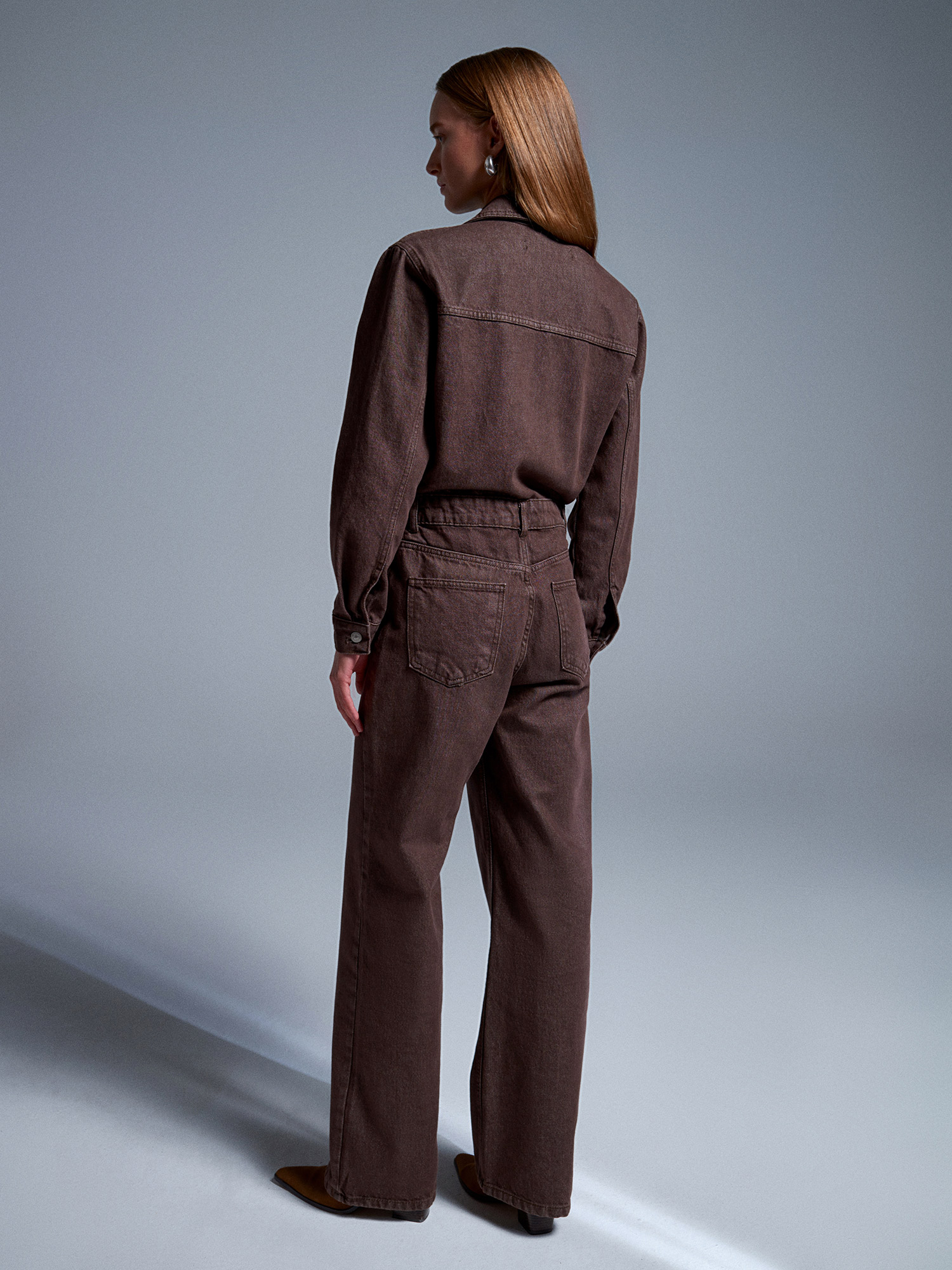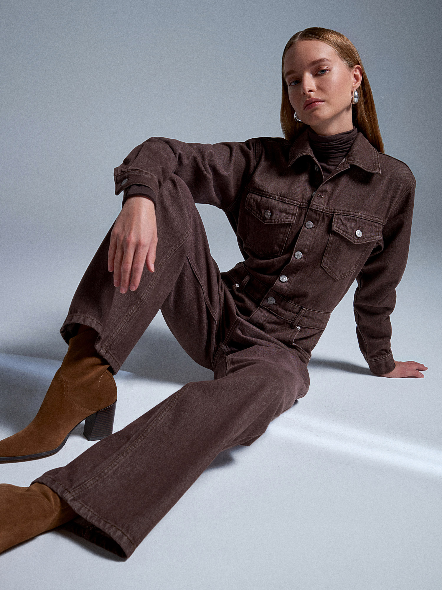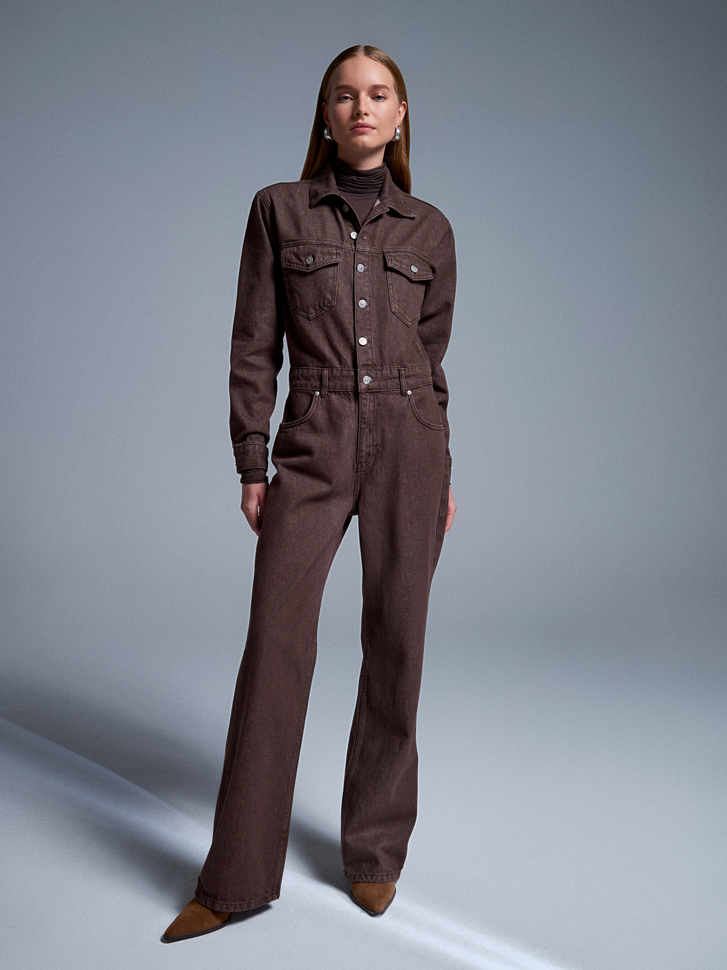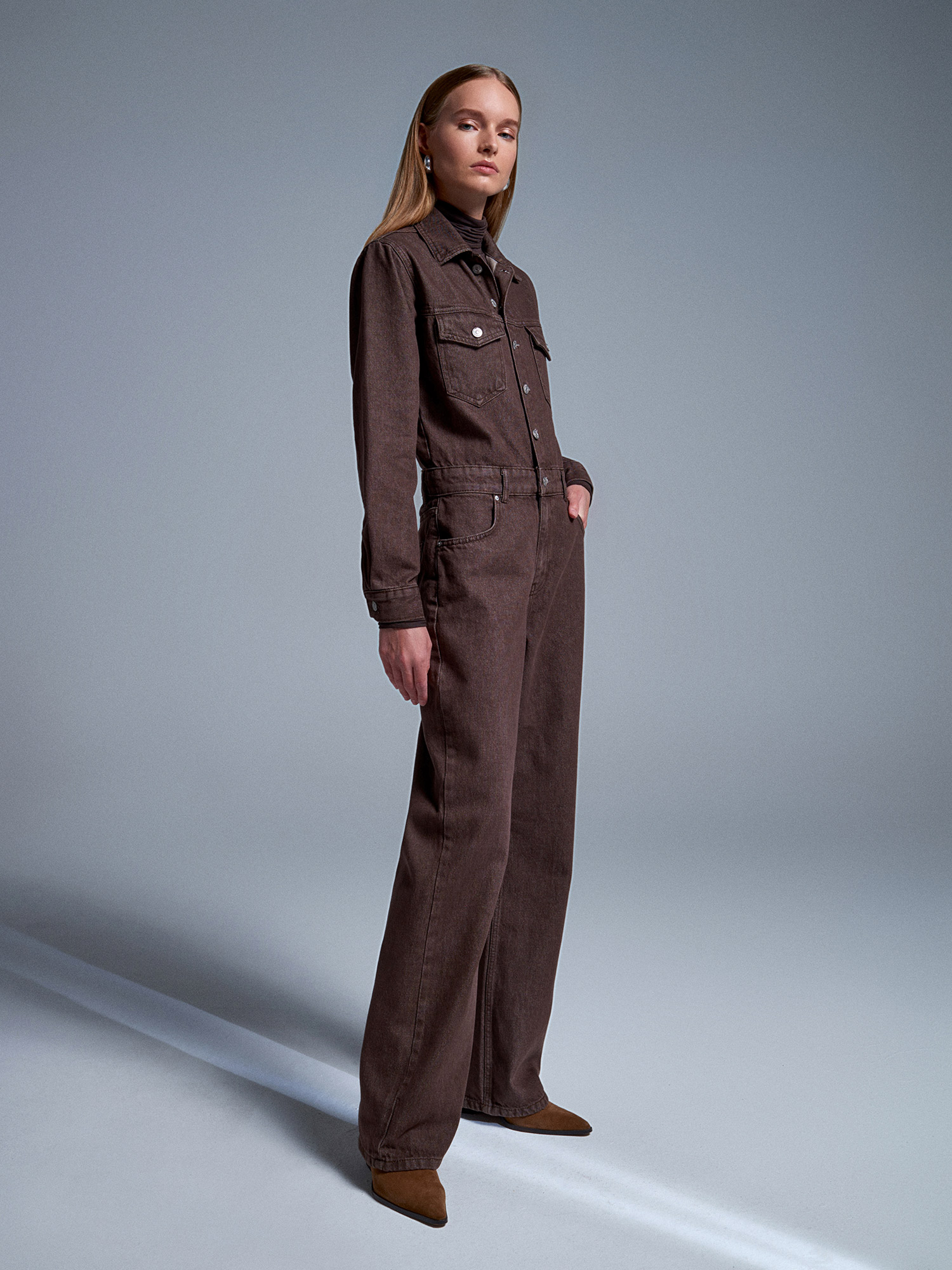 72069 %100 Pamuk Uzun Kollu Denim Tulum-Kahve