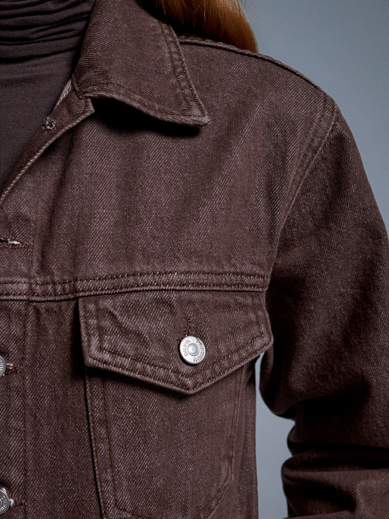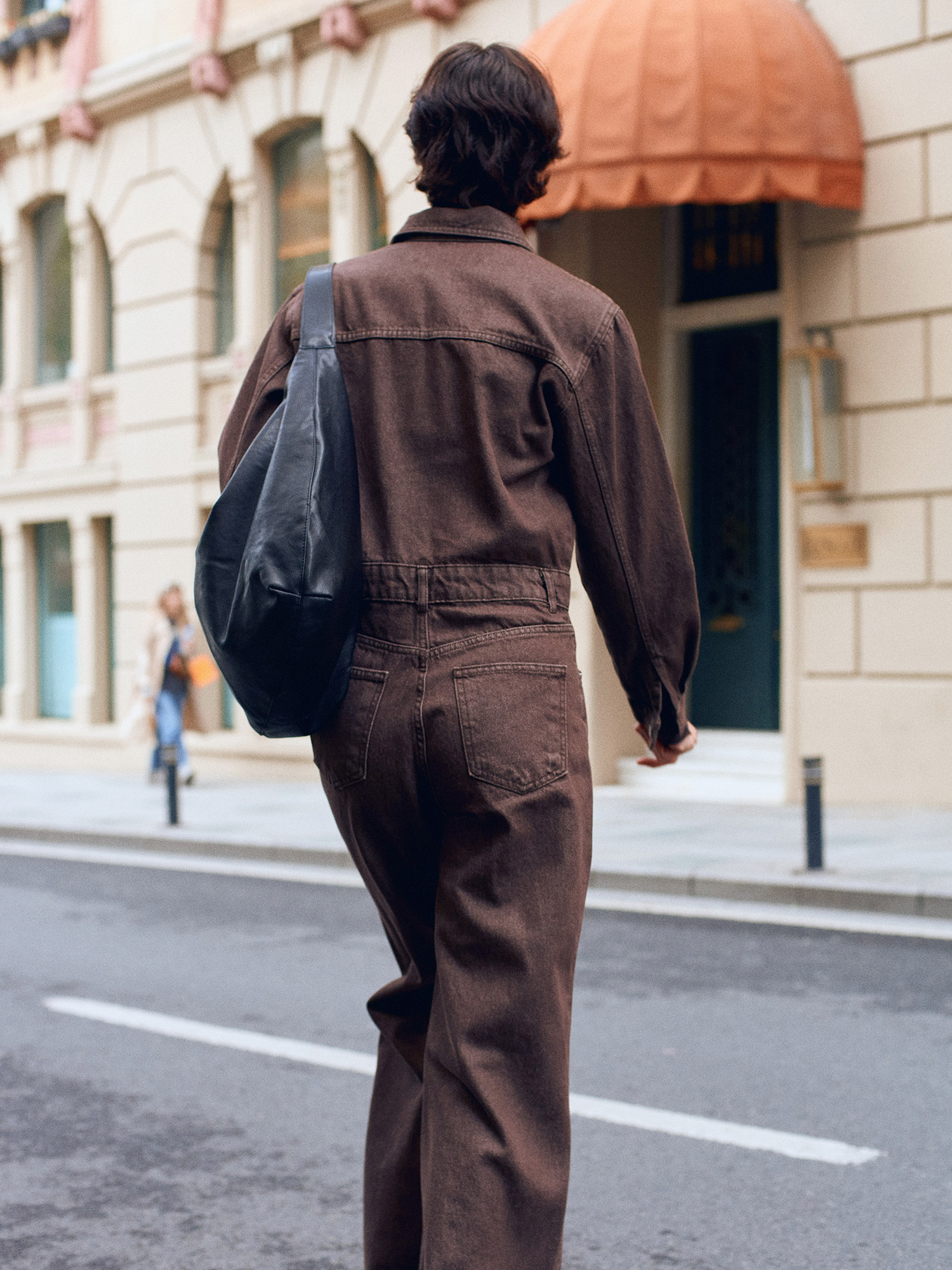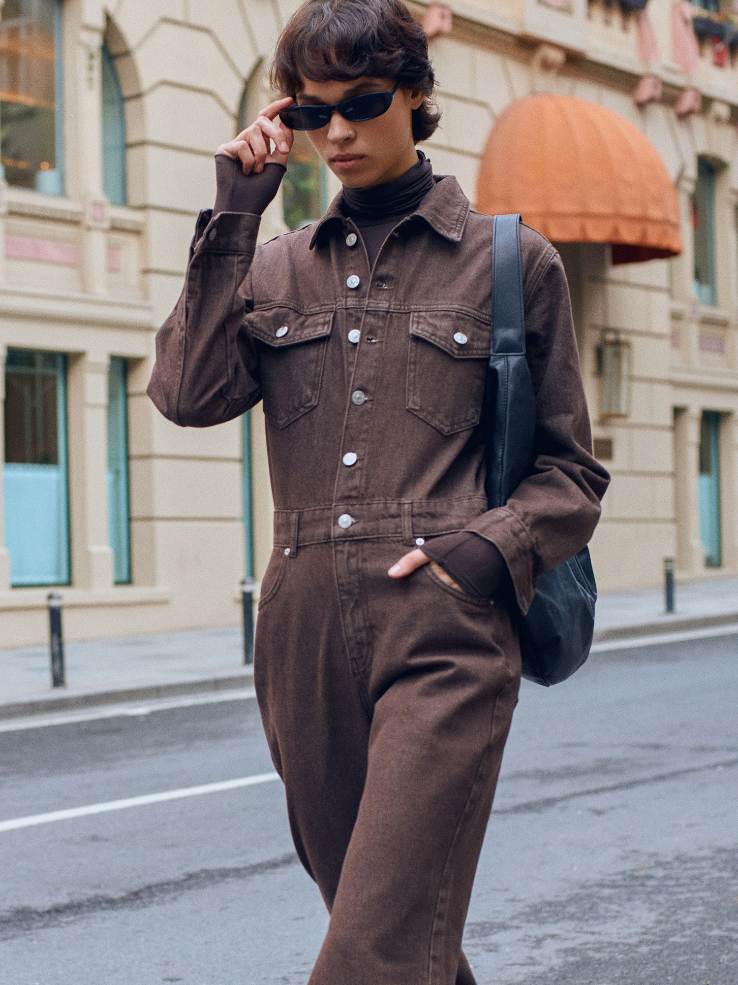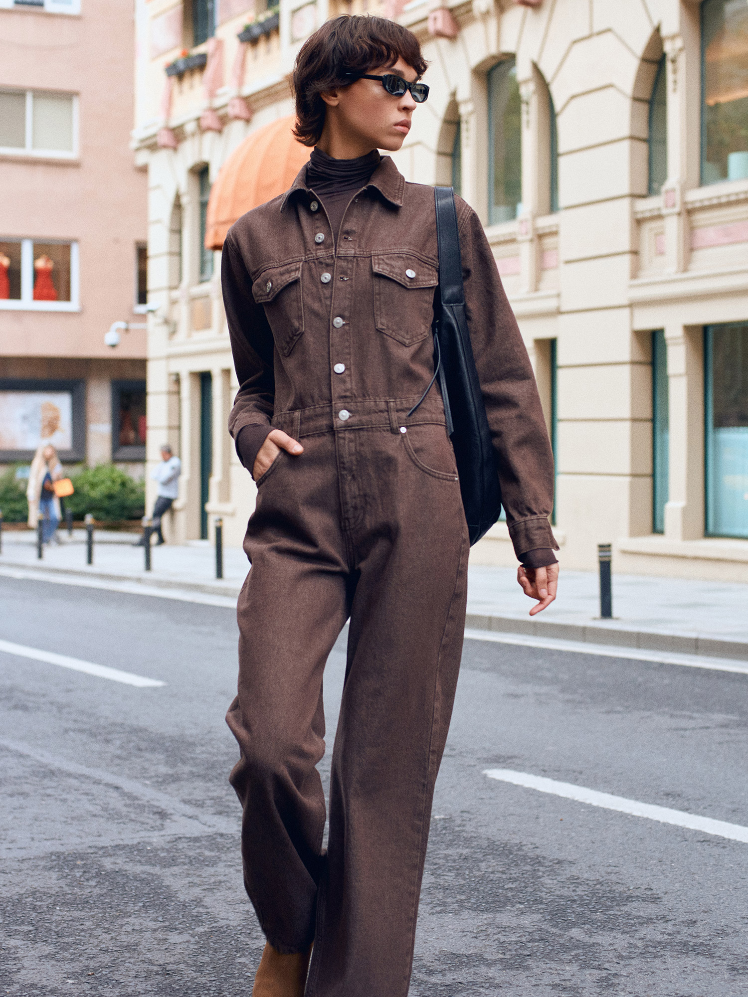 72069 %100 Pamuk Uzun Kollu Denim Tulum-Kahve