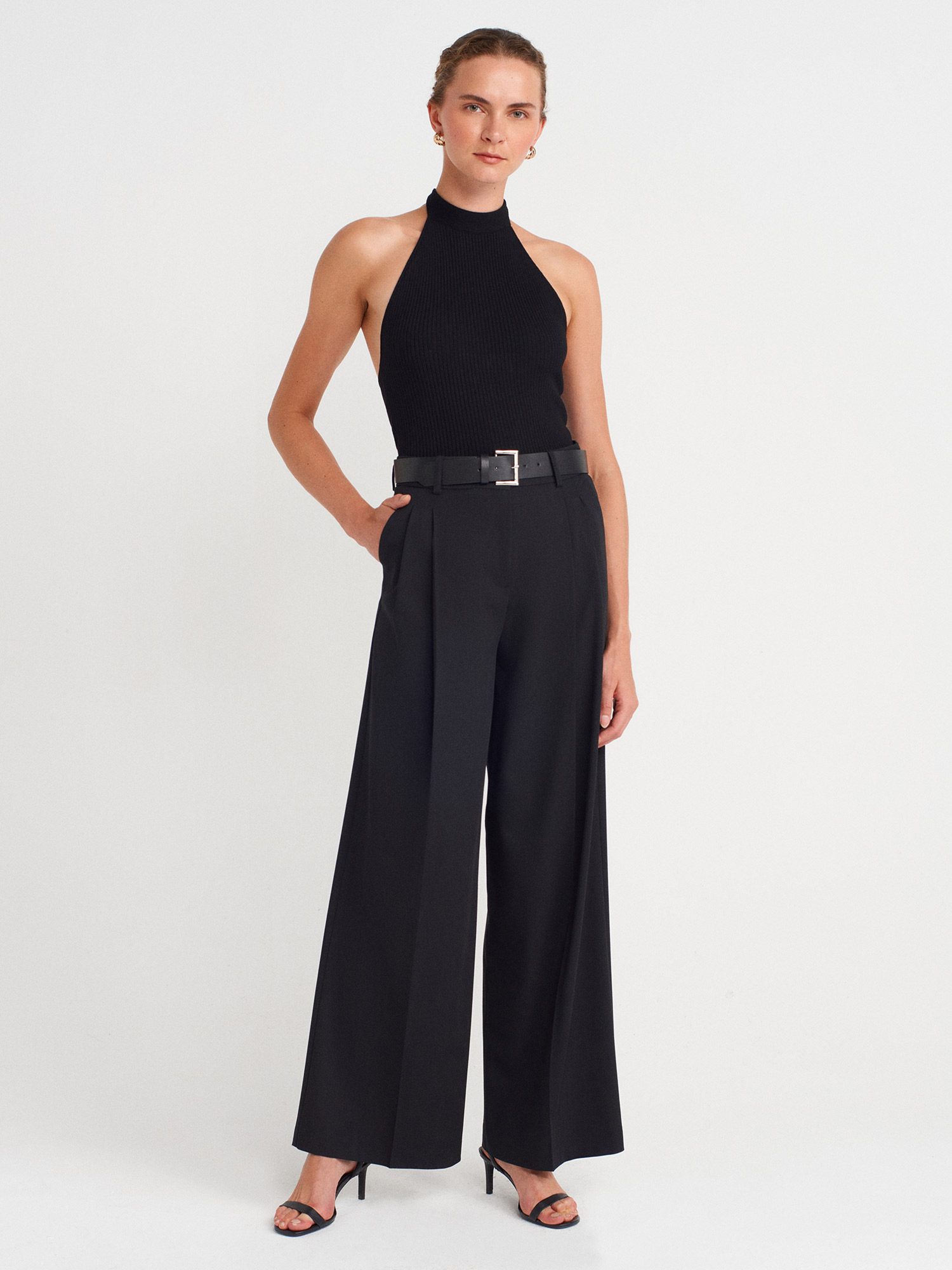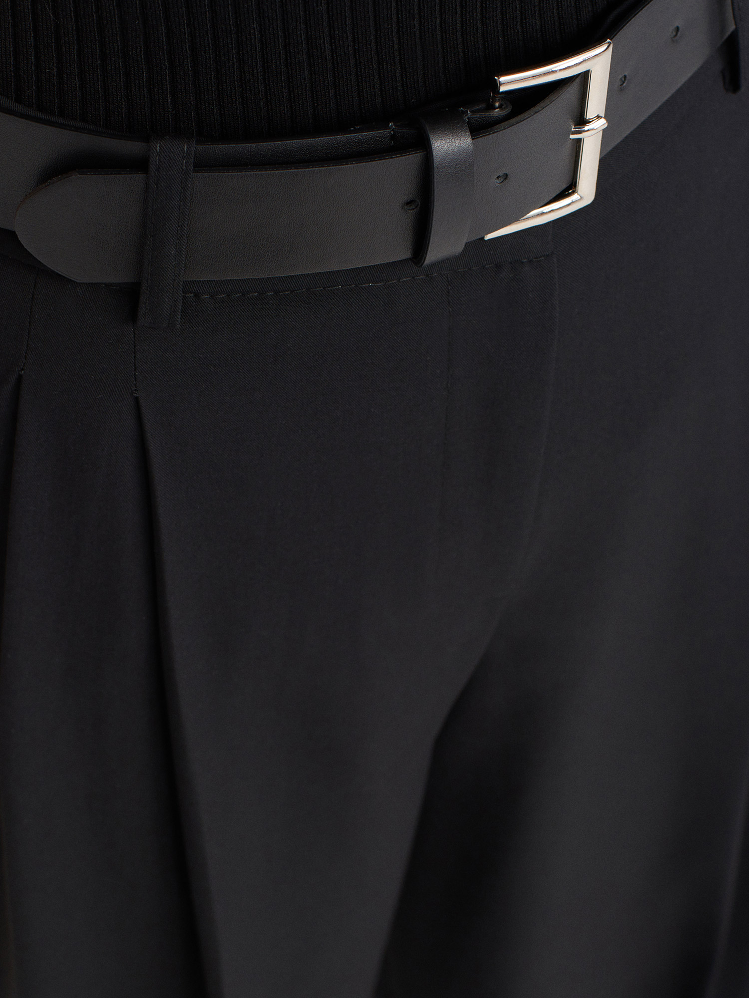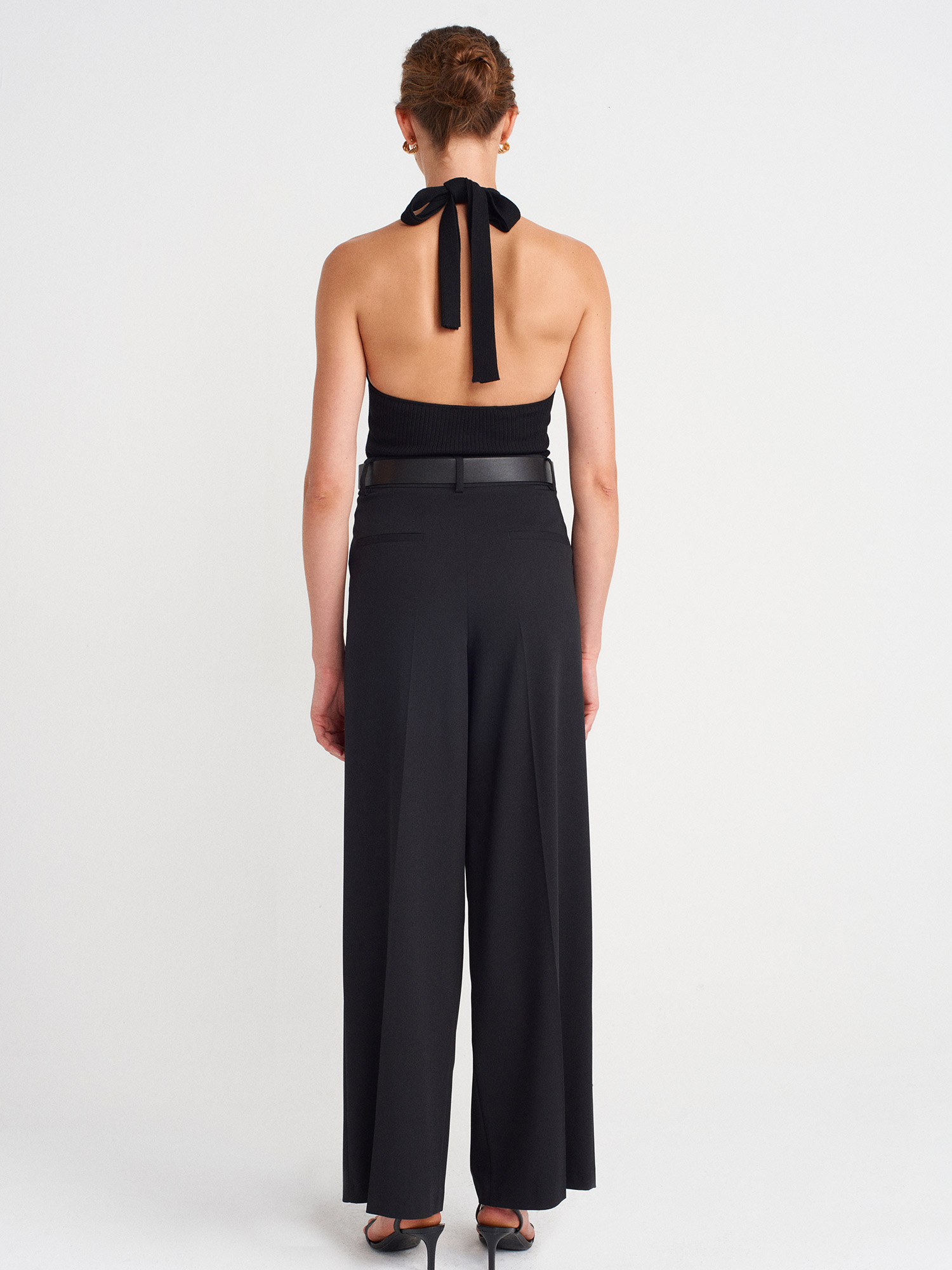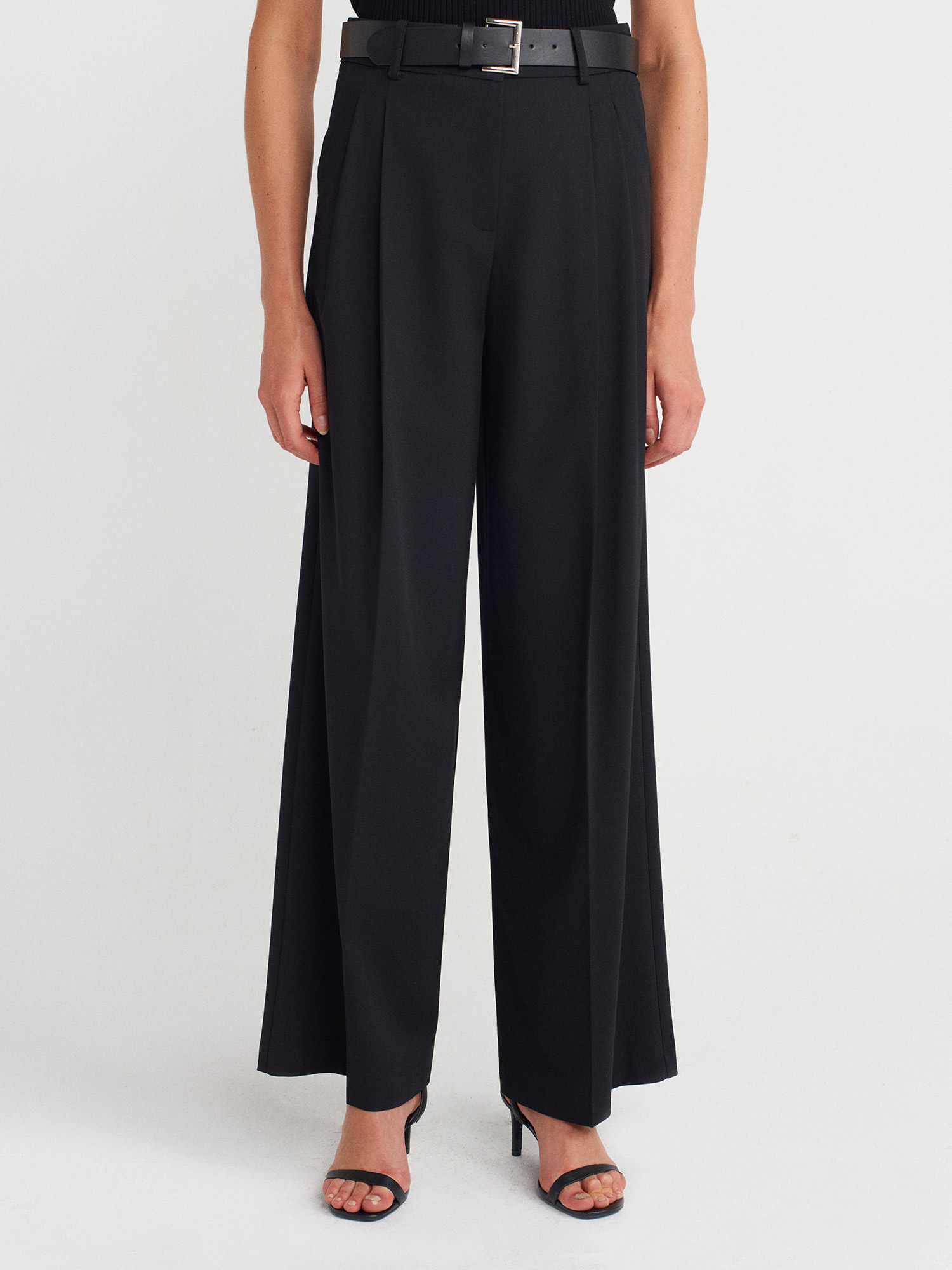 72149 Kemerli Çift Pilili Pantolon-Siyah