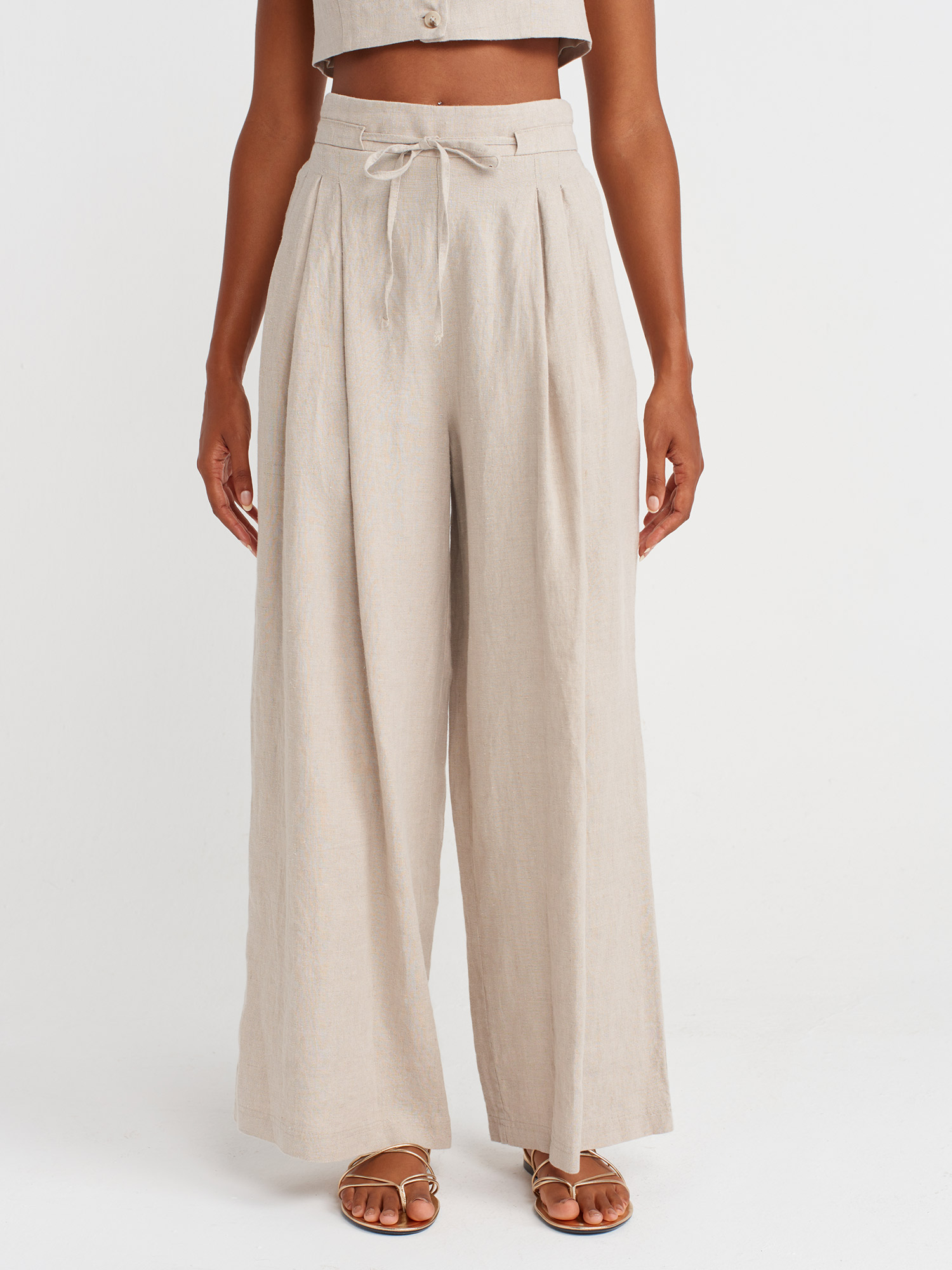 72150 Pilili Ve Dökümlü Geniş Paça Pantolon-Taş