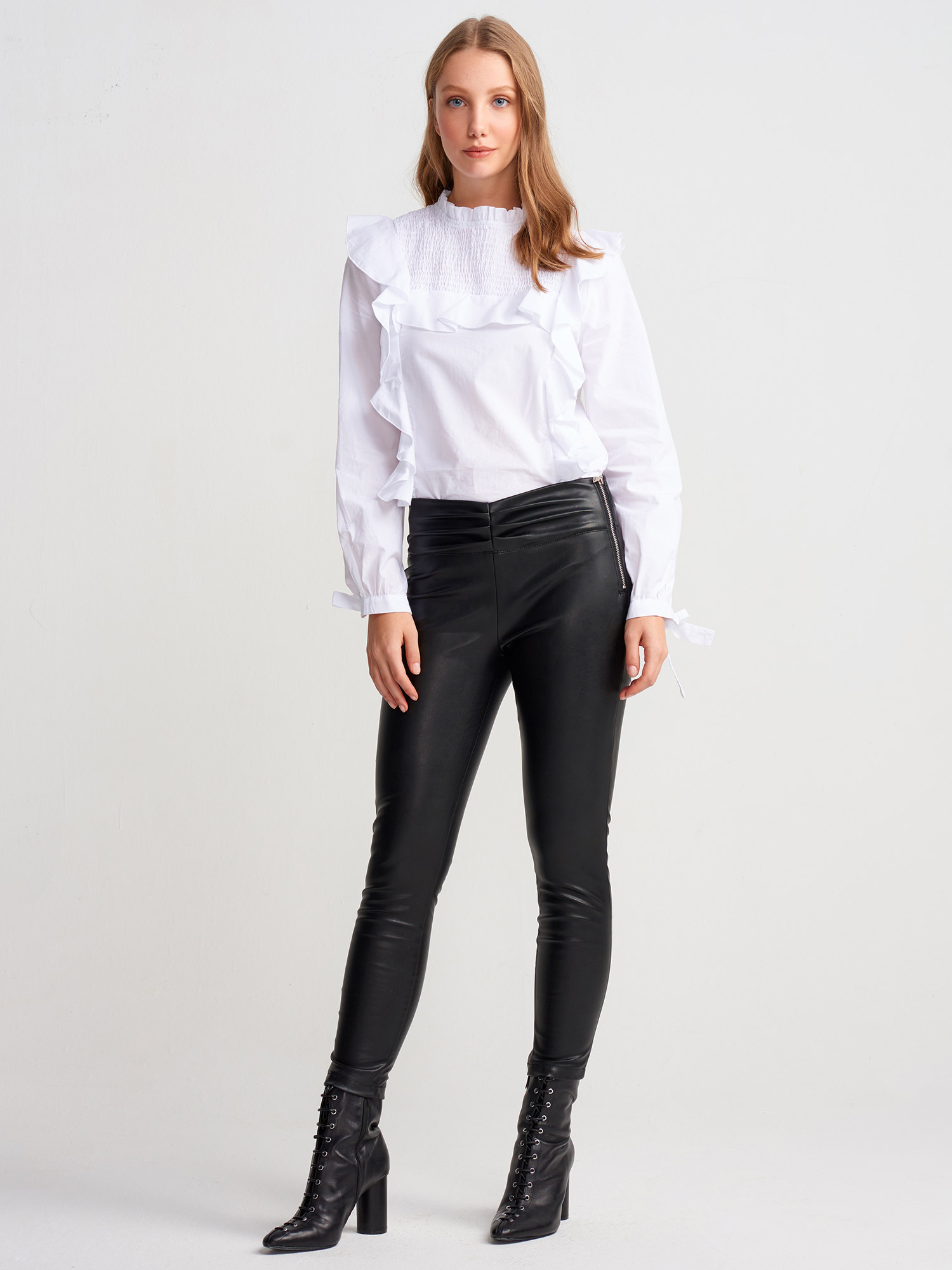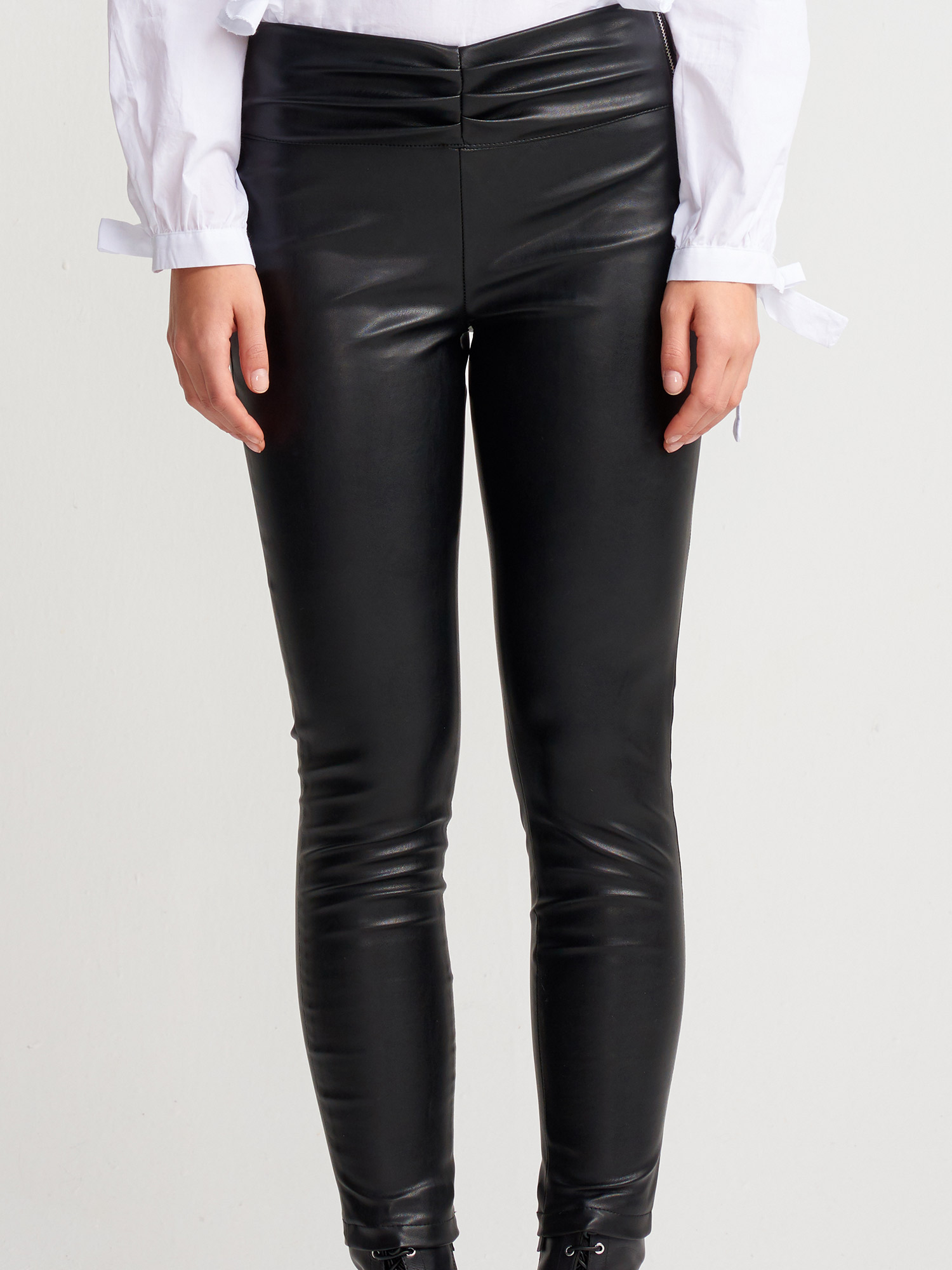 7465 Kemer Bölümü Büzgülü Deri Pantolon-Siyah