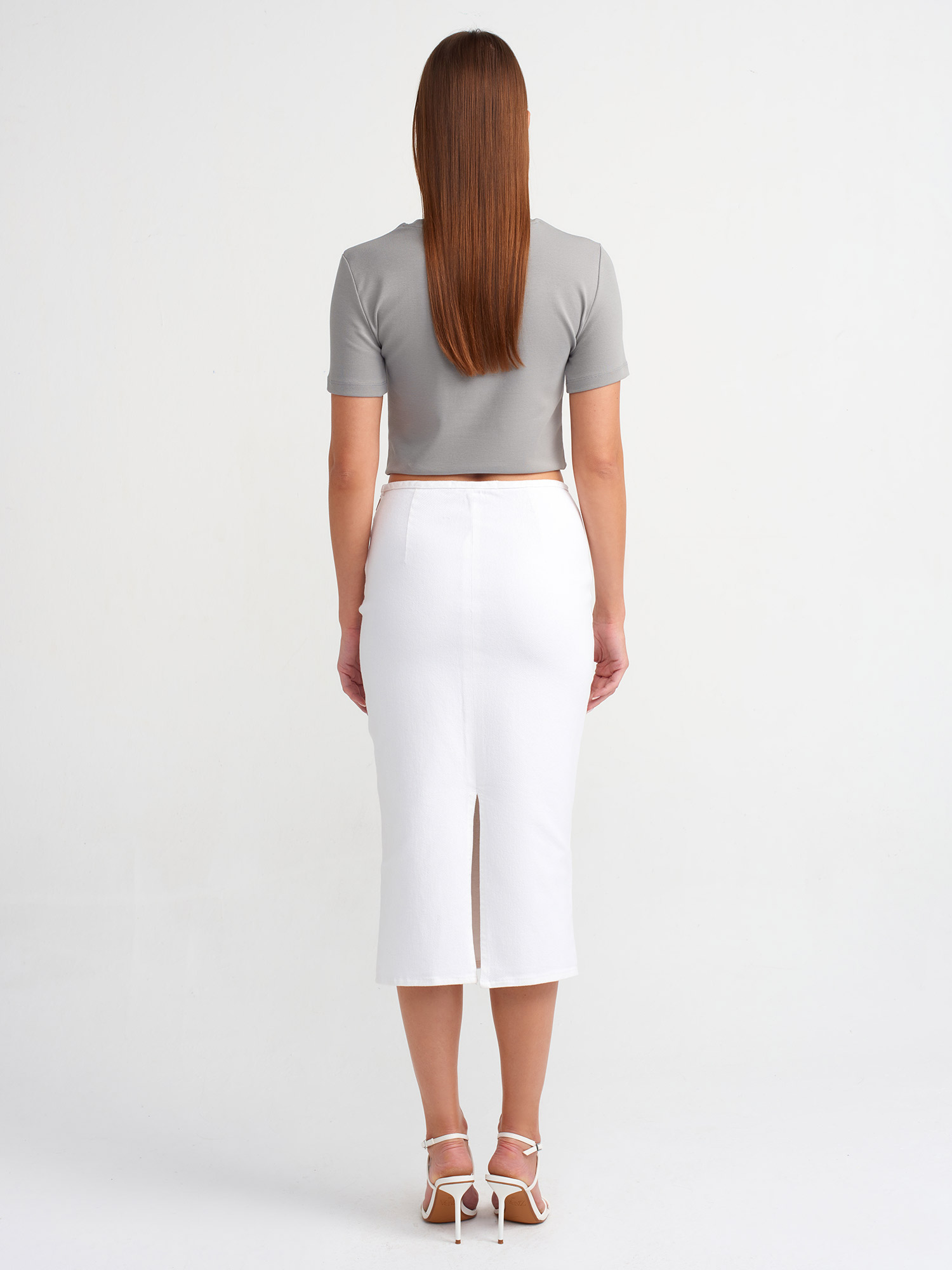 80324 Yırtmaç Detaylı Midi Boy Etek-Beyaz