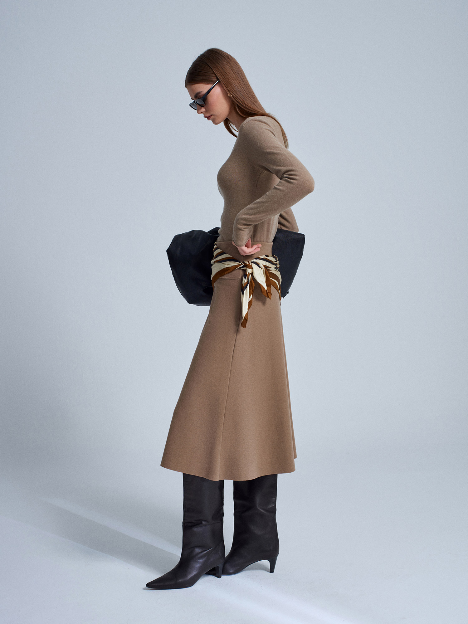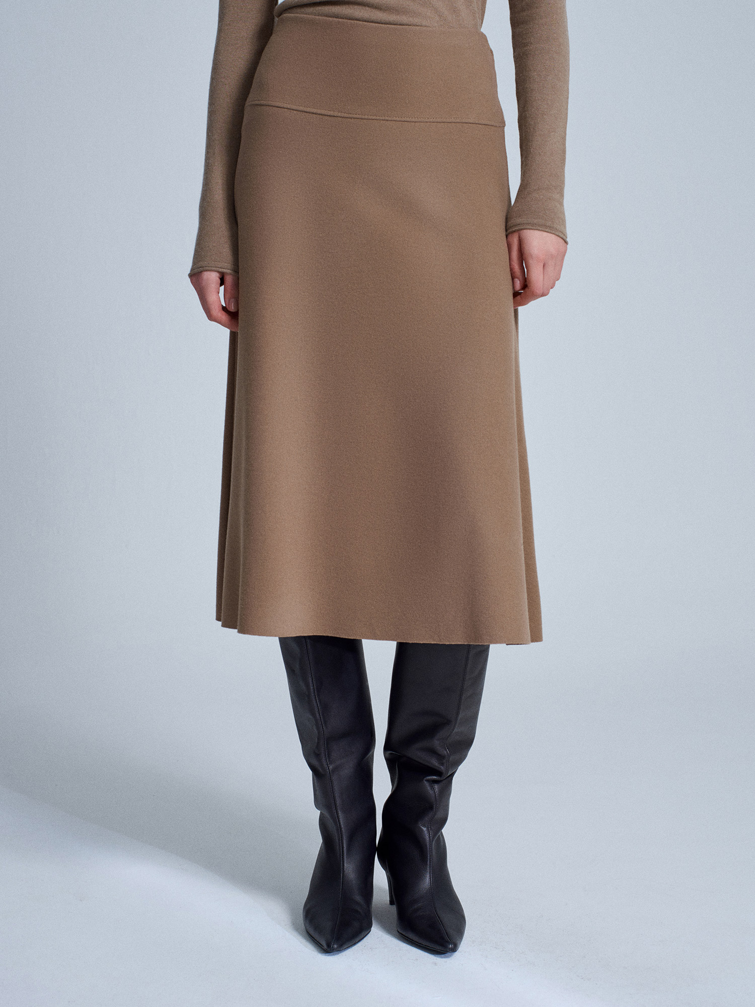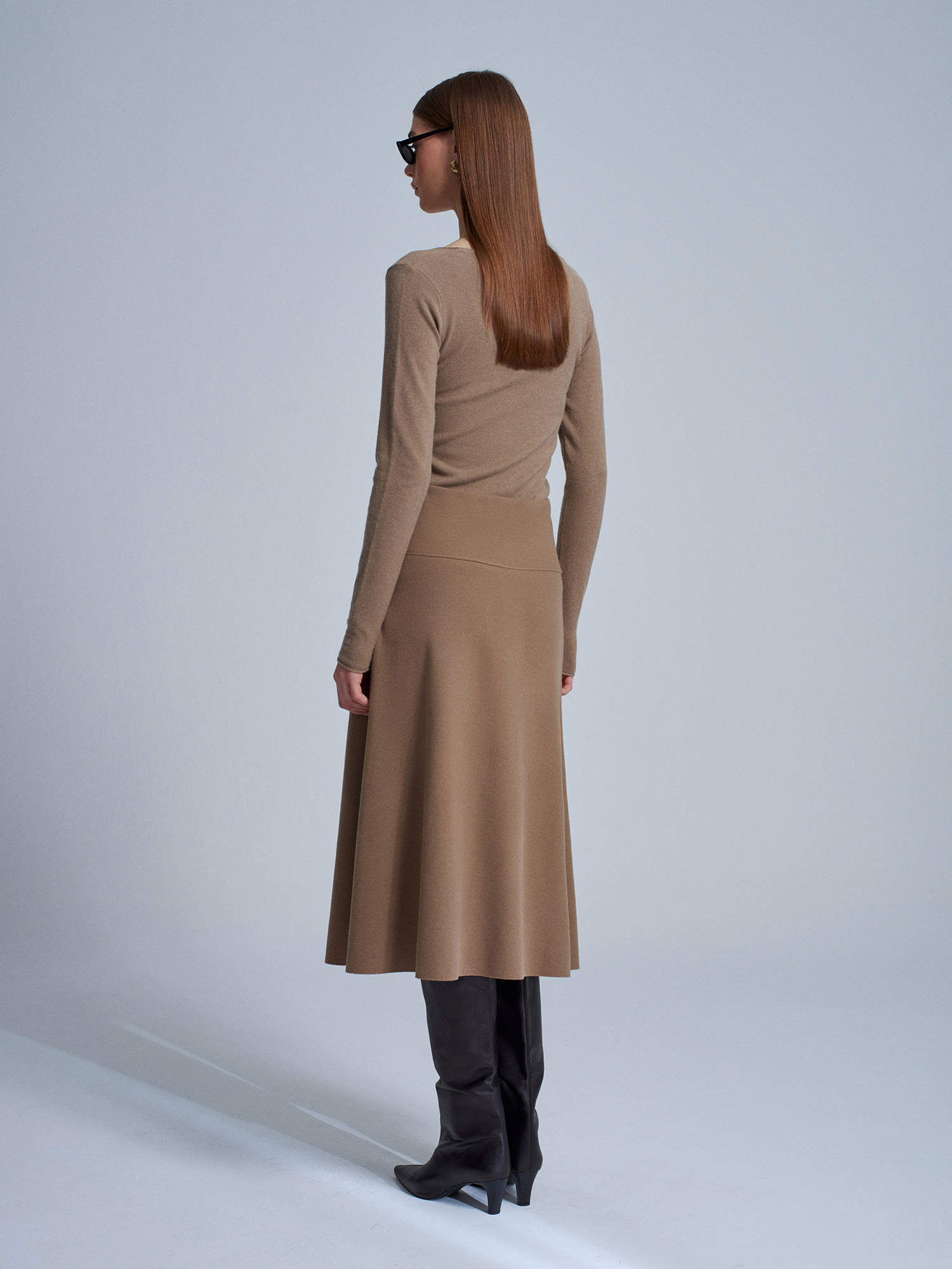 80390 Beli Lastikli Örme Midi Etek-Vizon