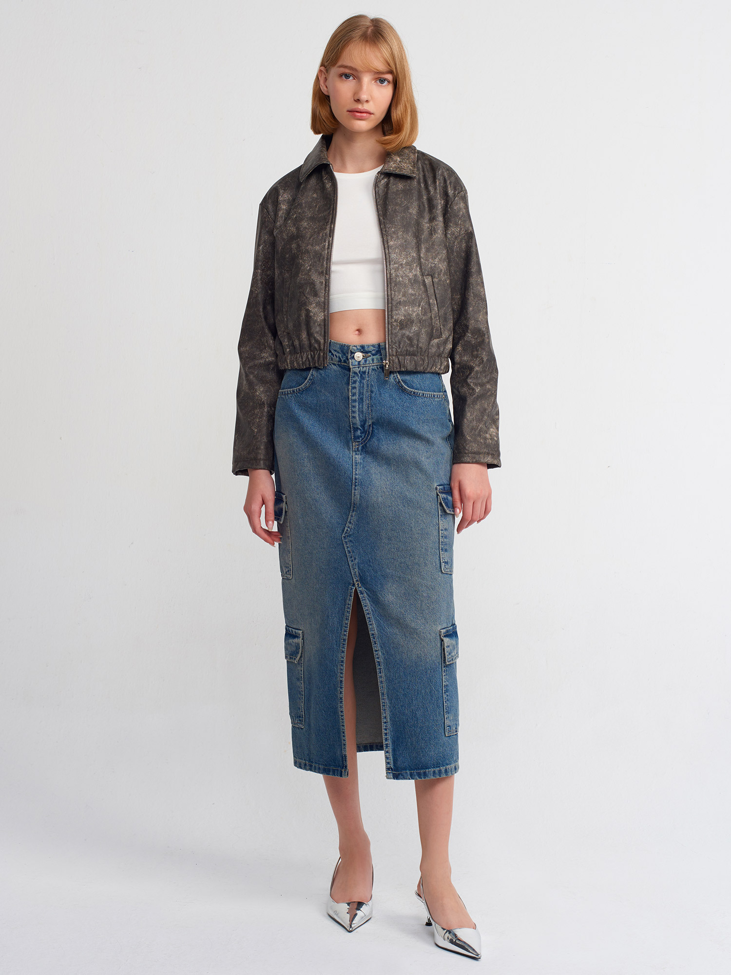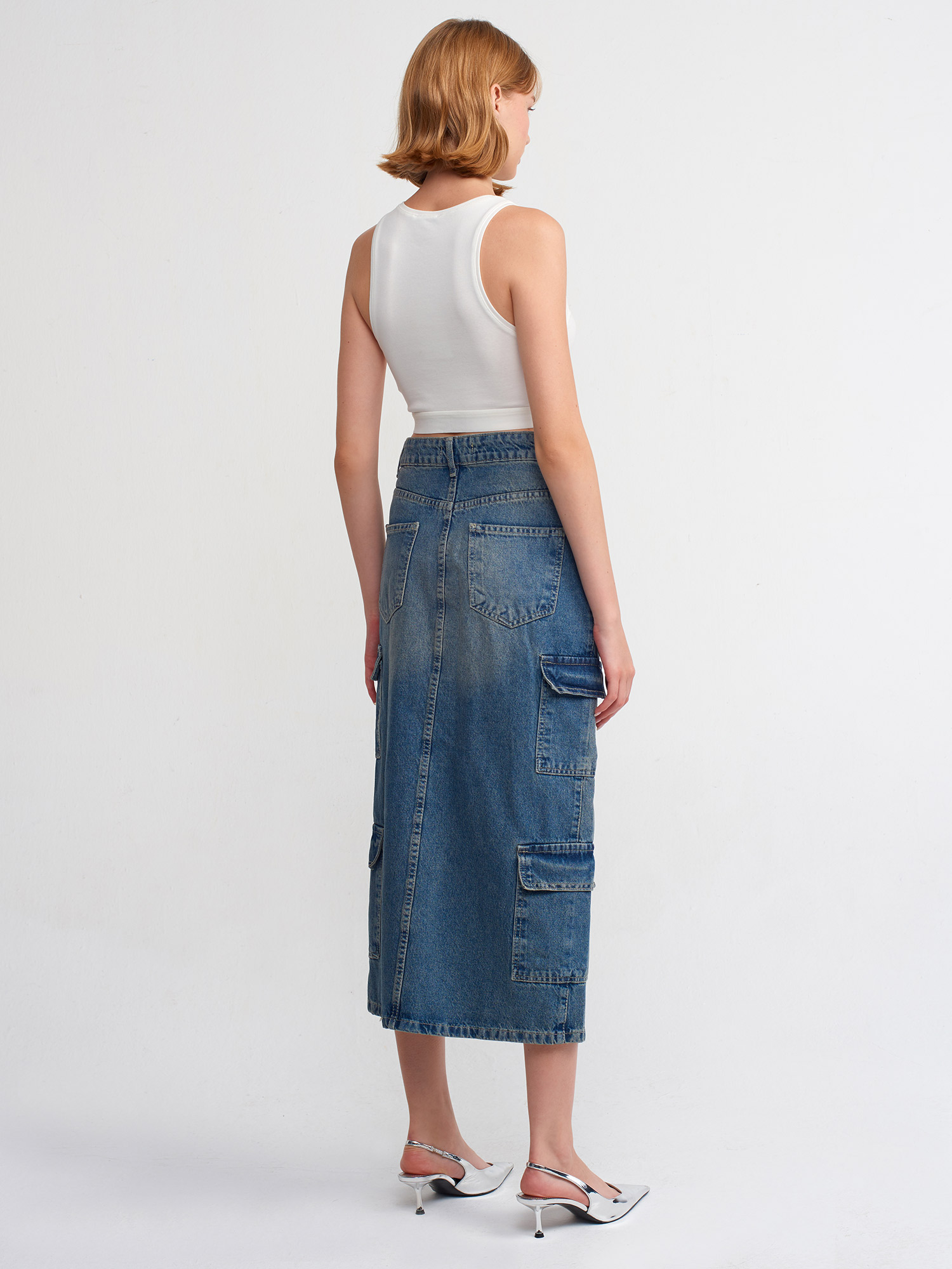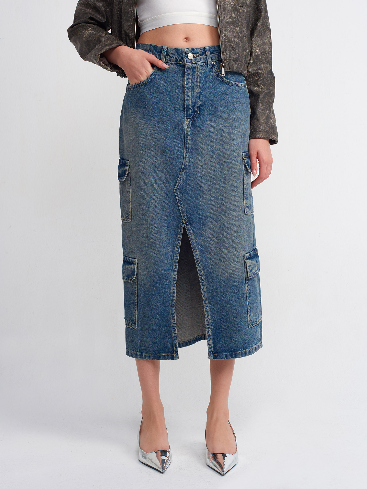80564 Dört Cepli Yırtmaçlı Denim Etek-Tint