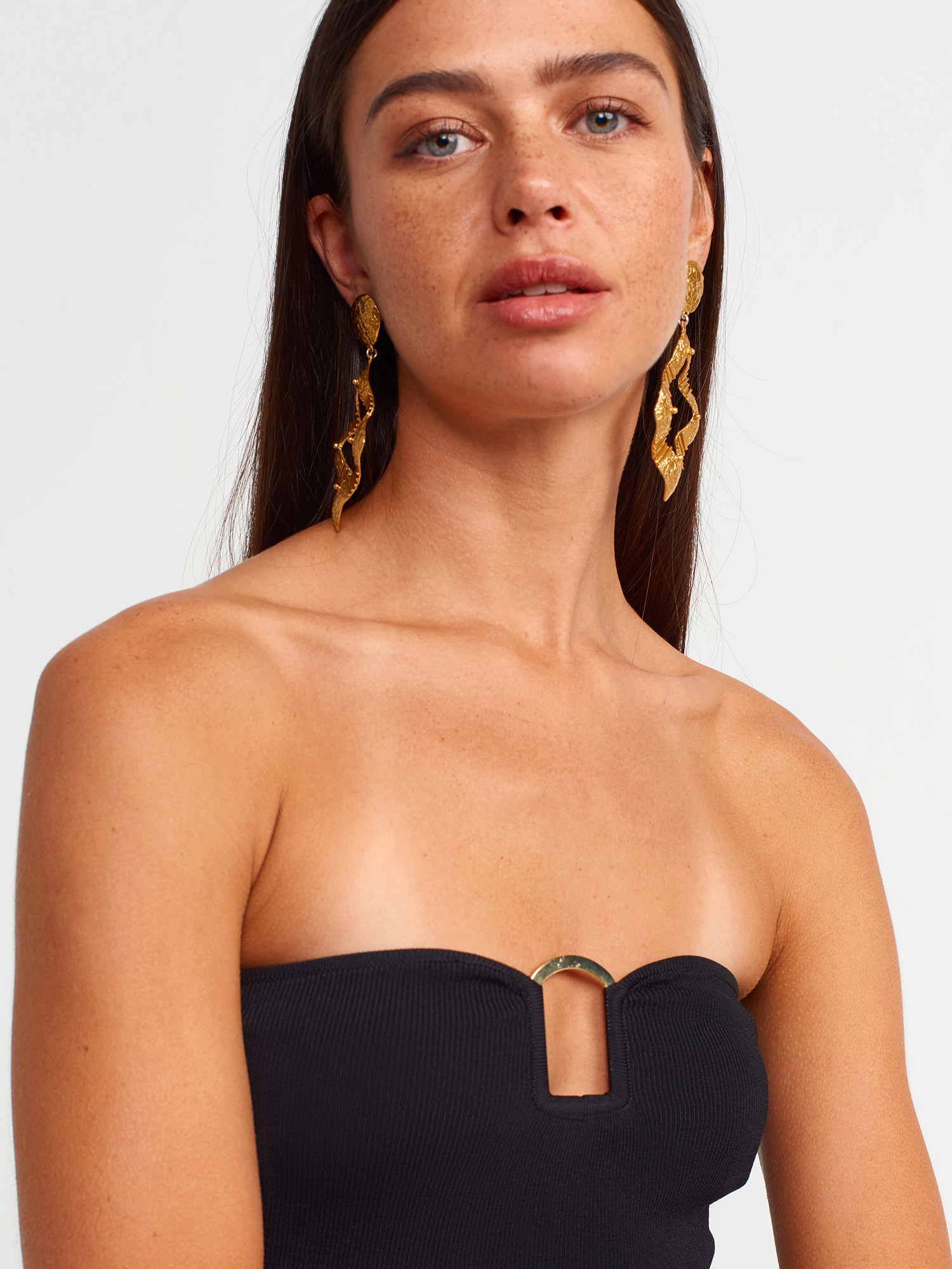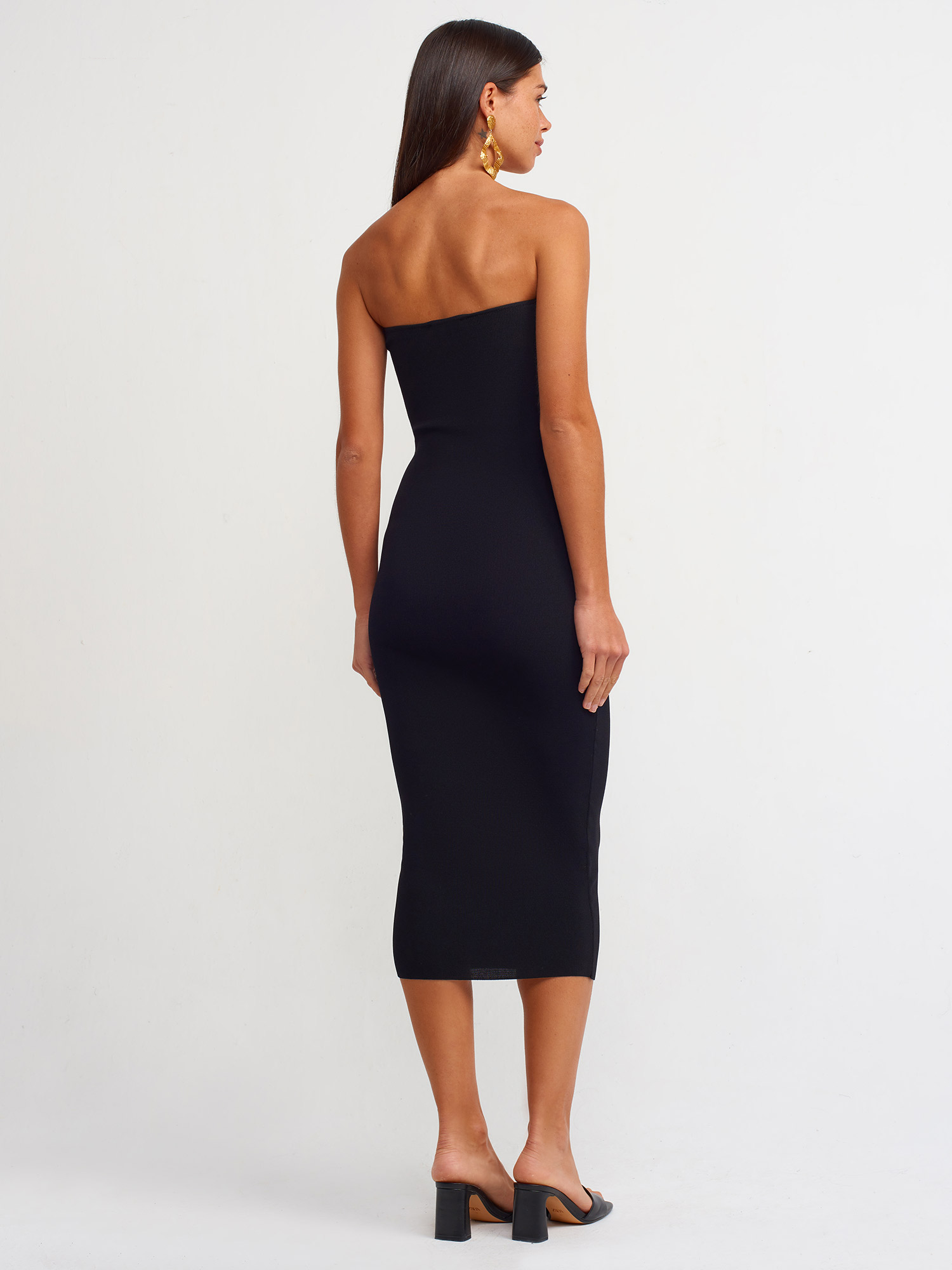 90144 Önü Metal Aksesuarlı Straplez Triko Elbise-Siyah
