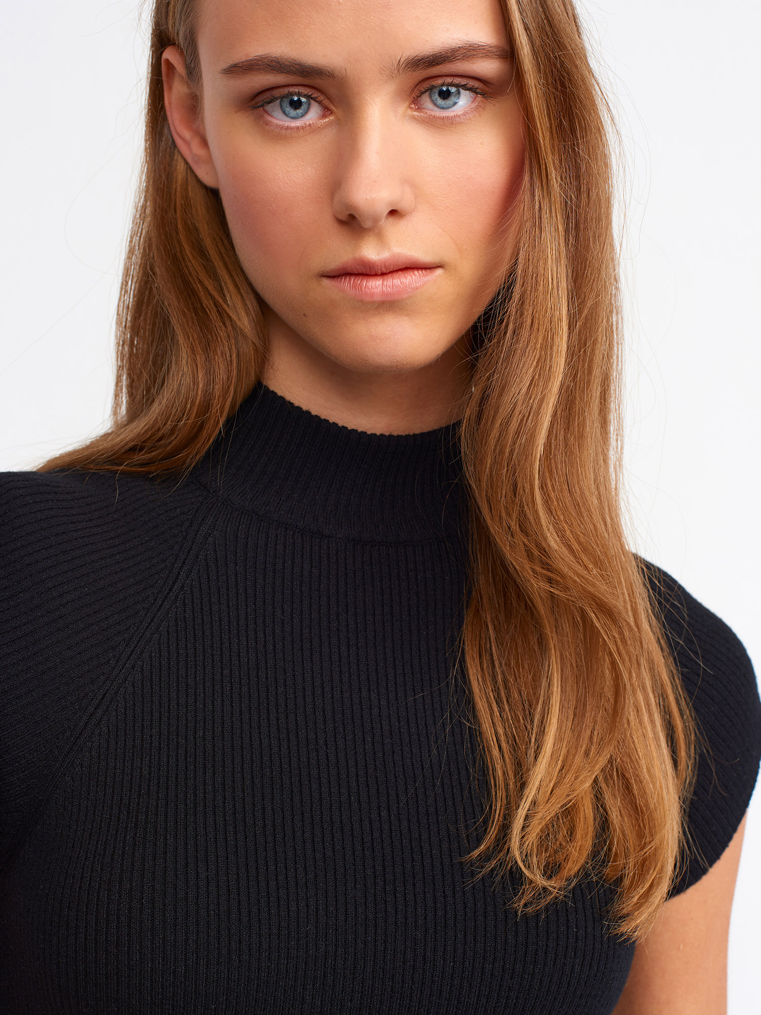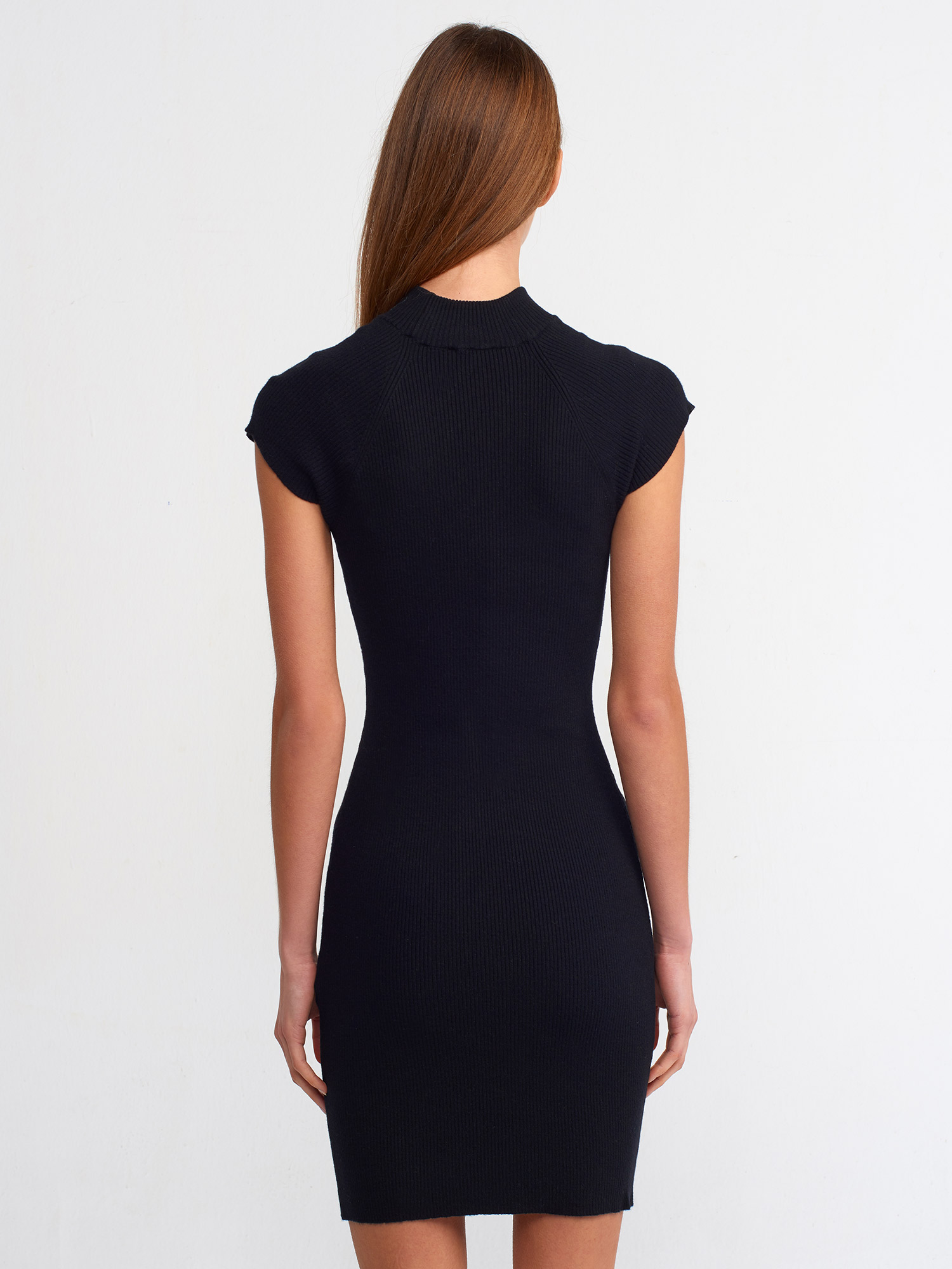 90172 Yarım Dik Yaka Fitilli Triko Elbise-Siyah