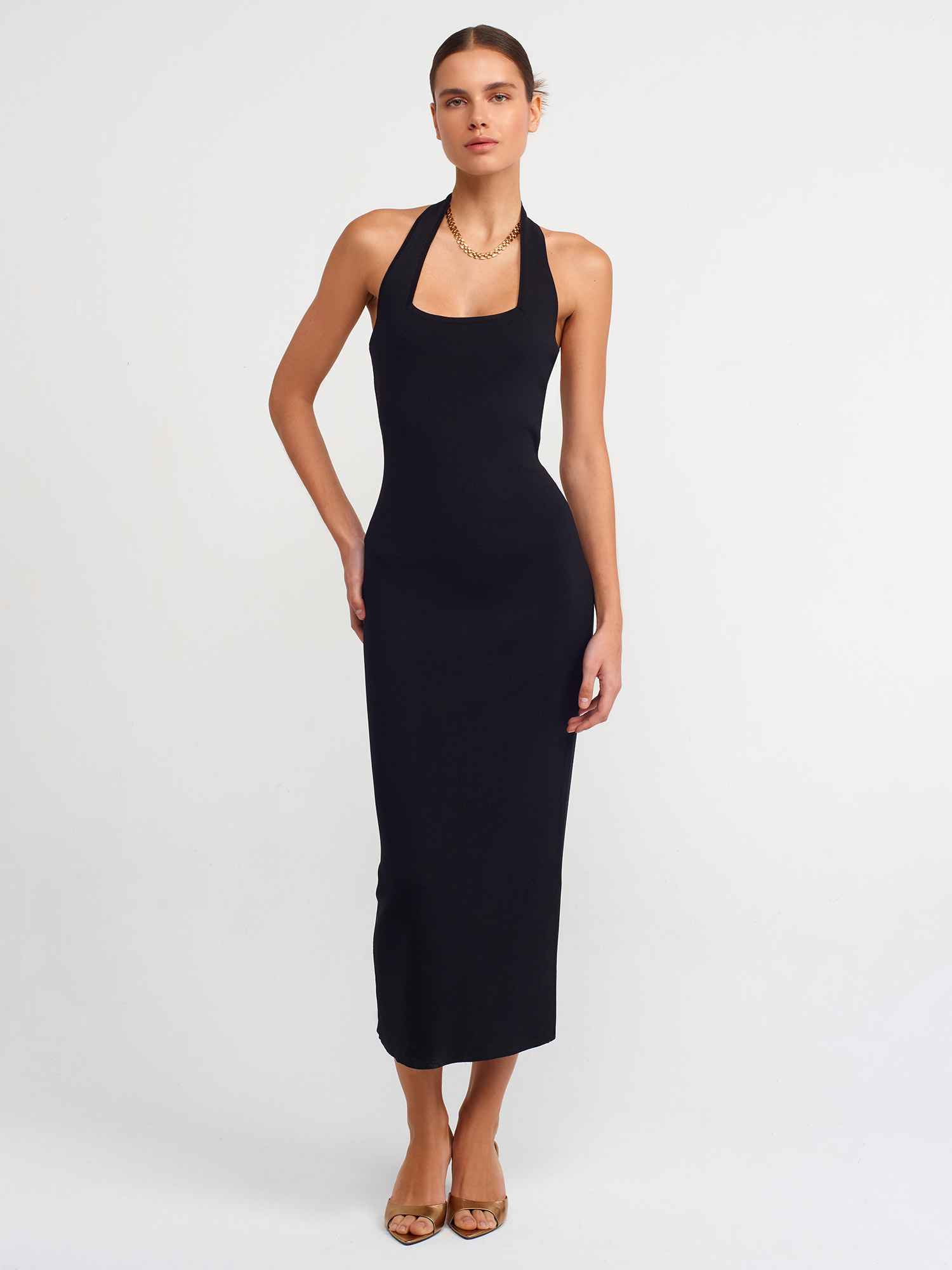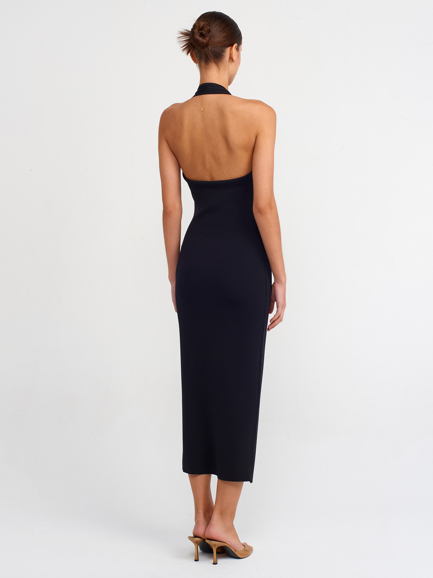 90178 Boyundan Geçmeli Sırtı Açık Triko Elbise-Siyah