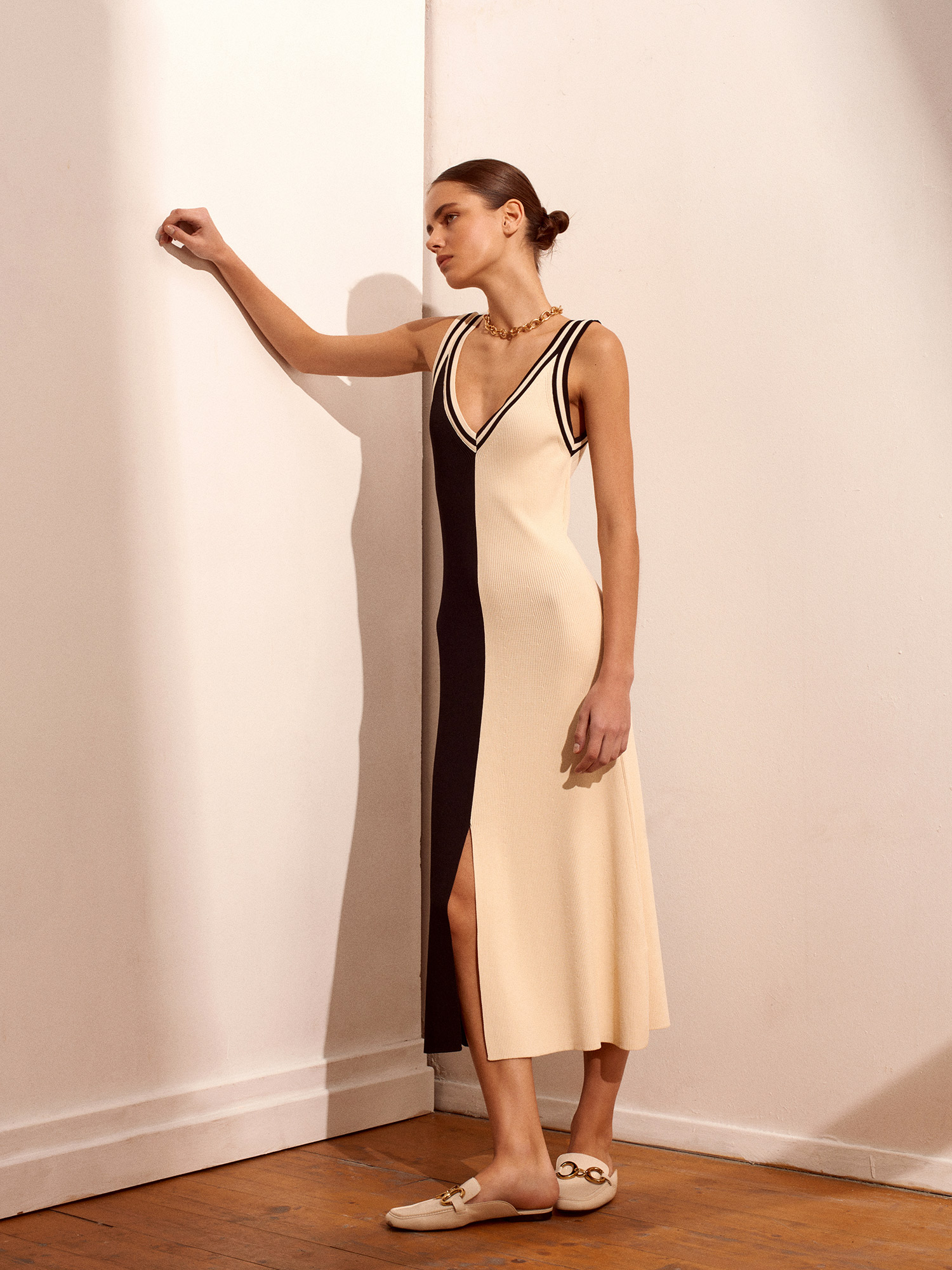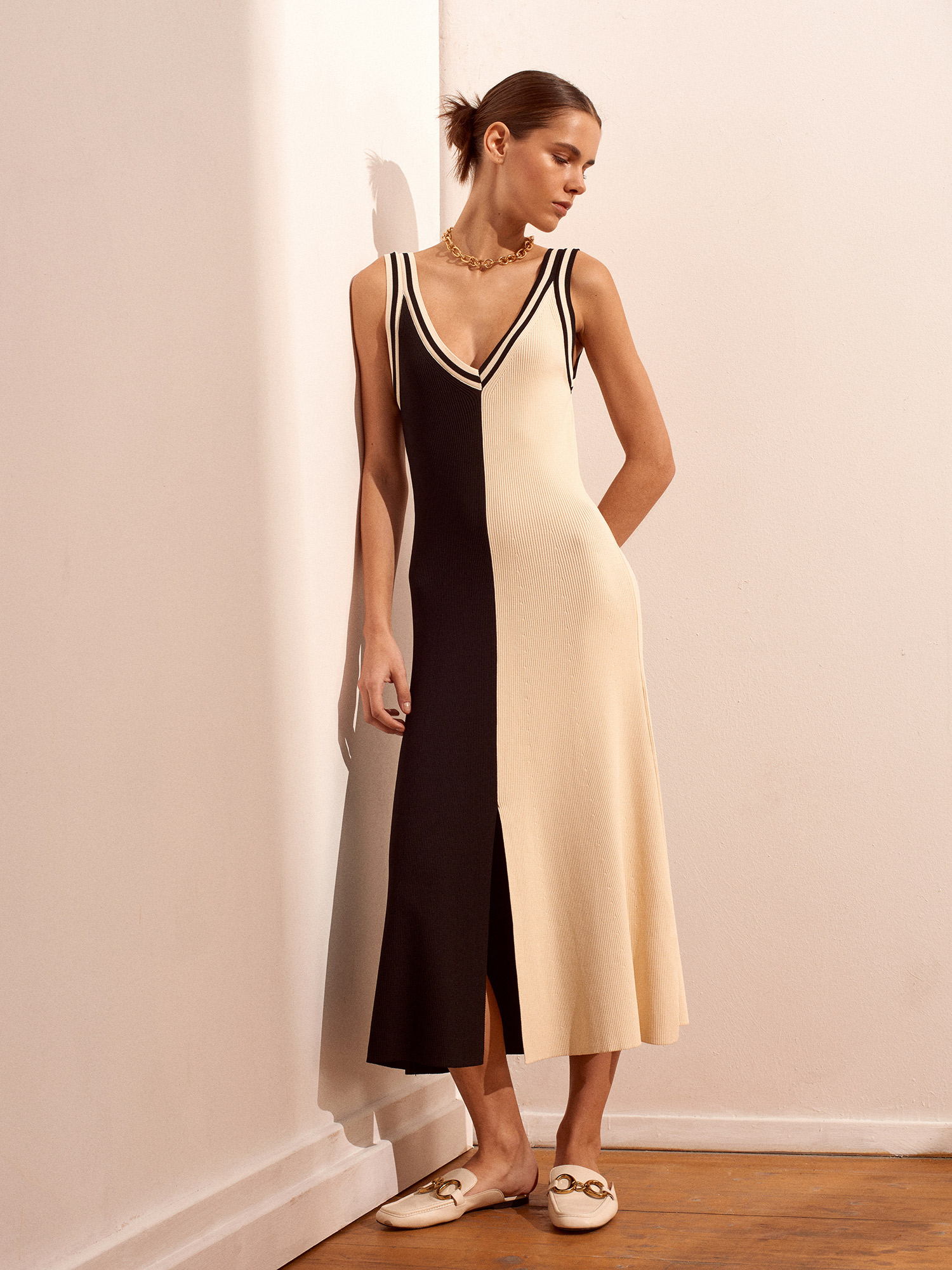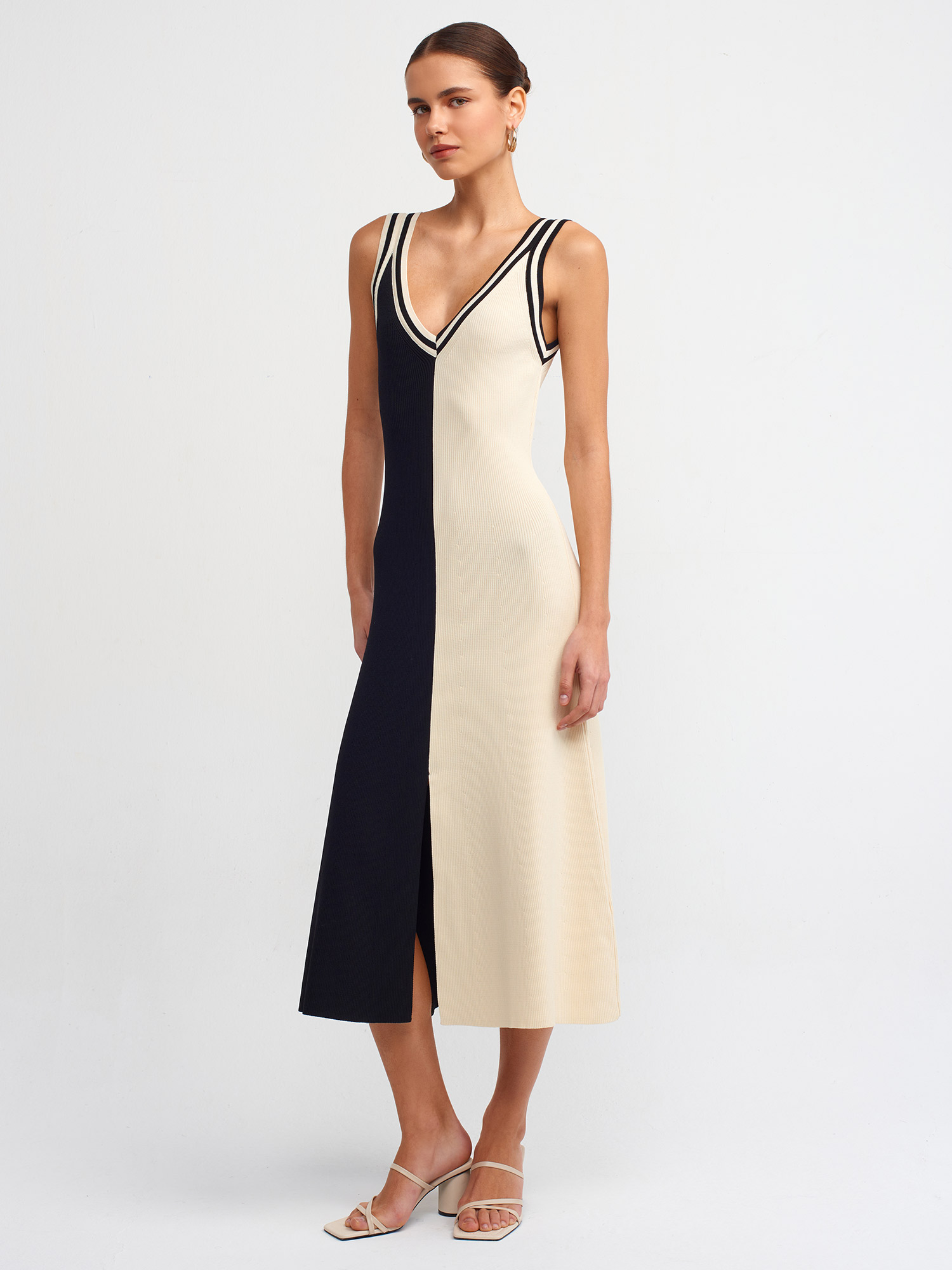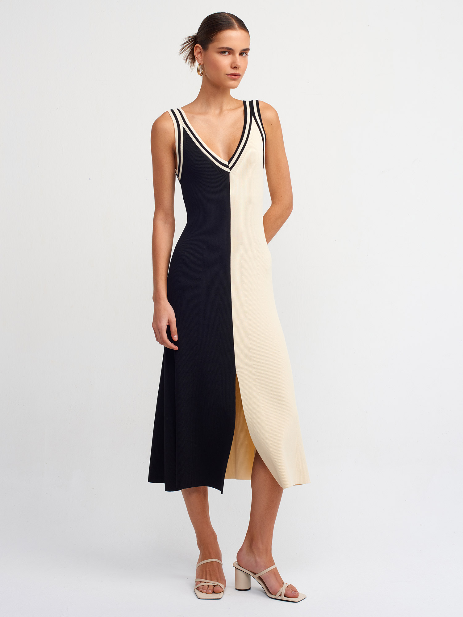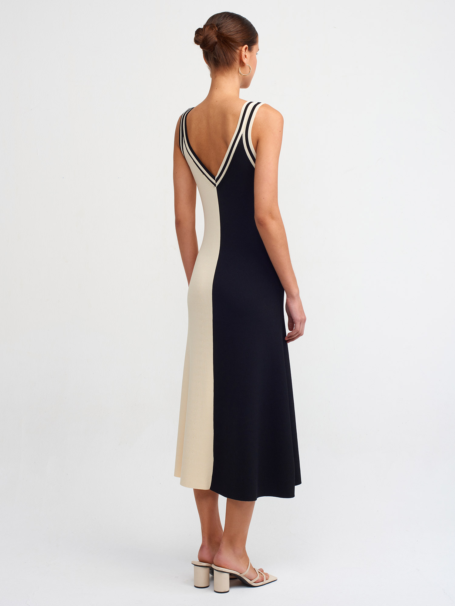 90196 V Yaka Fitilli Çizgili Triko Elbise-Siyah-N.