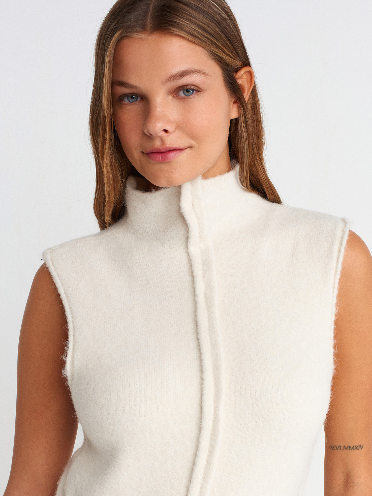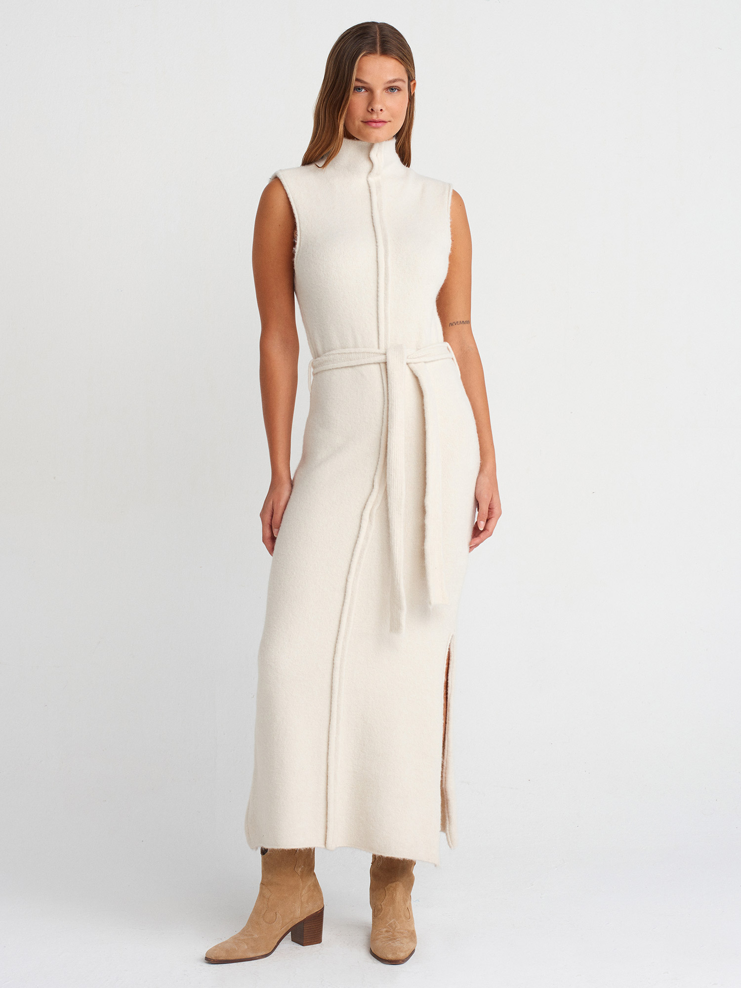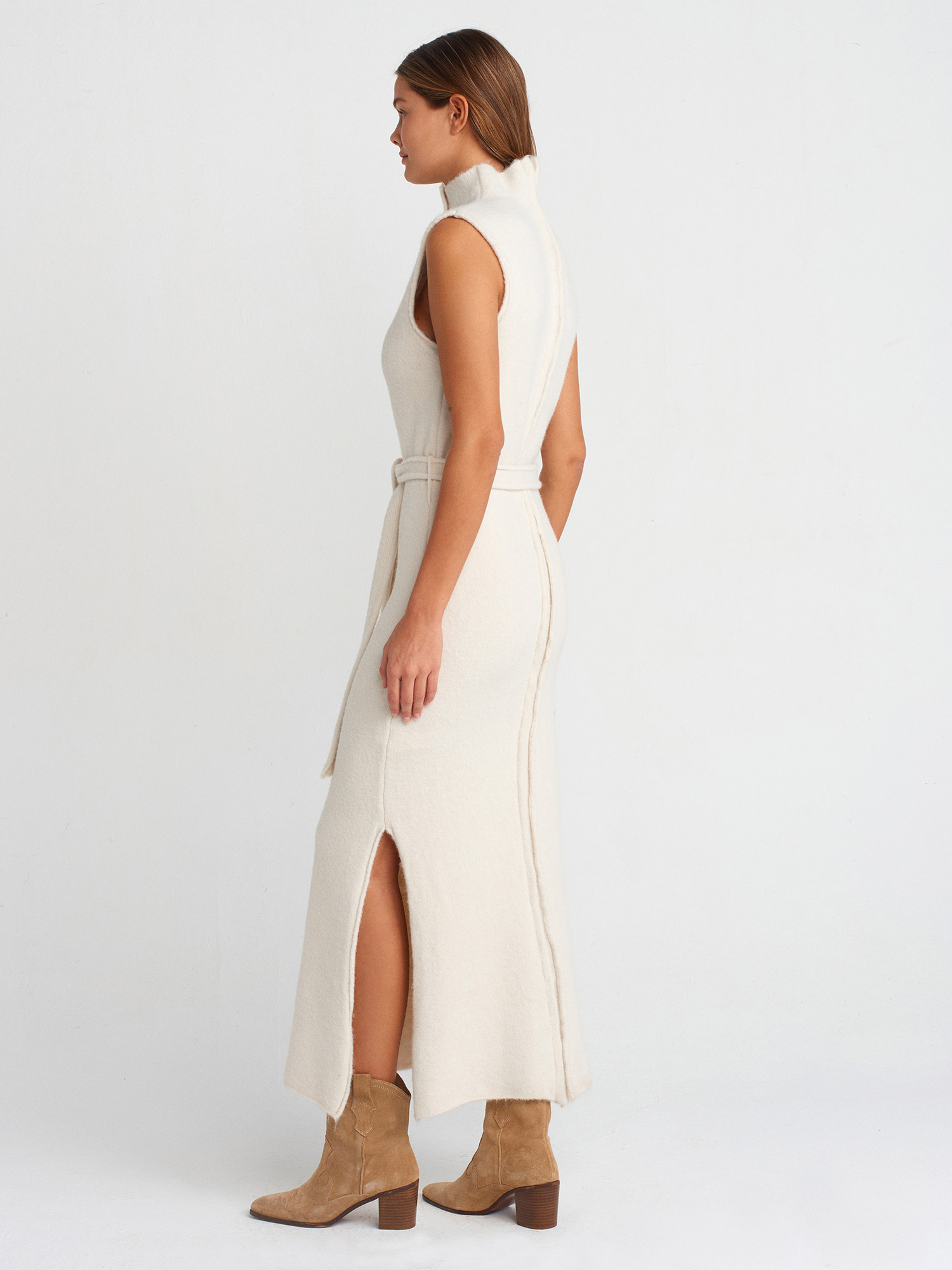 90237 Dik Yaka Kemer Yırtmaç Dikiş Detaylı Triko Elbise-Bej