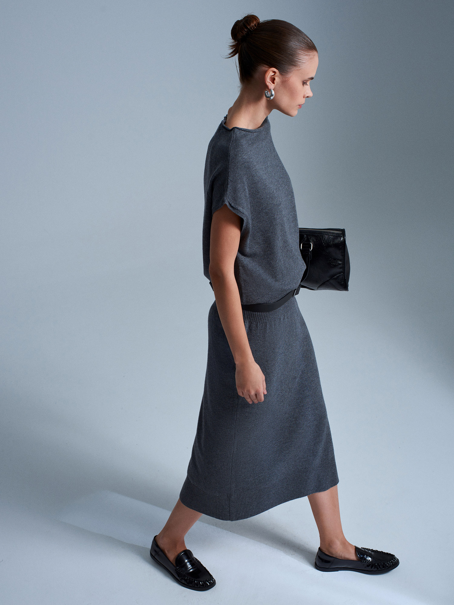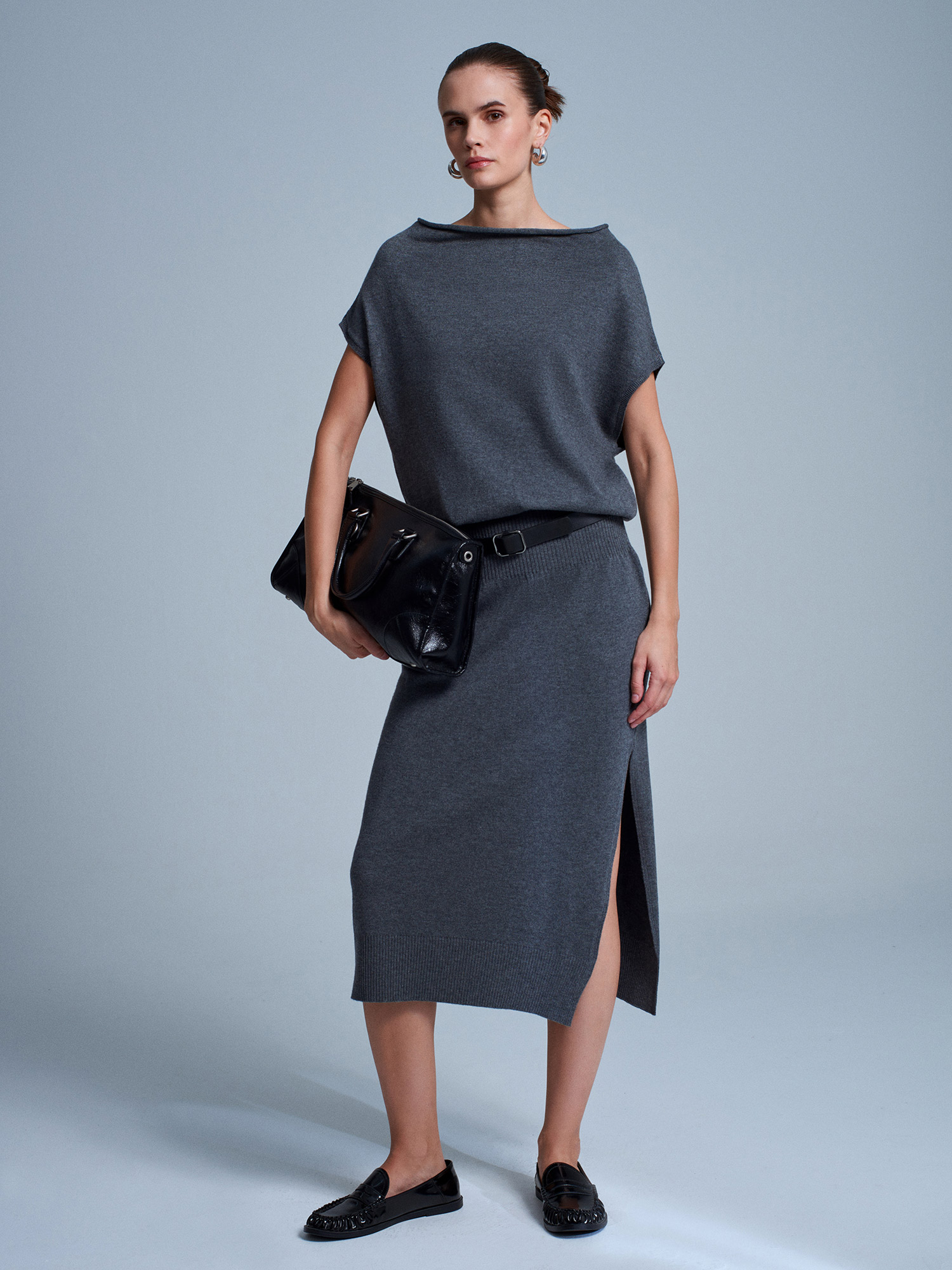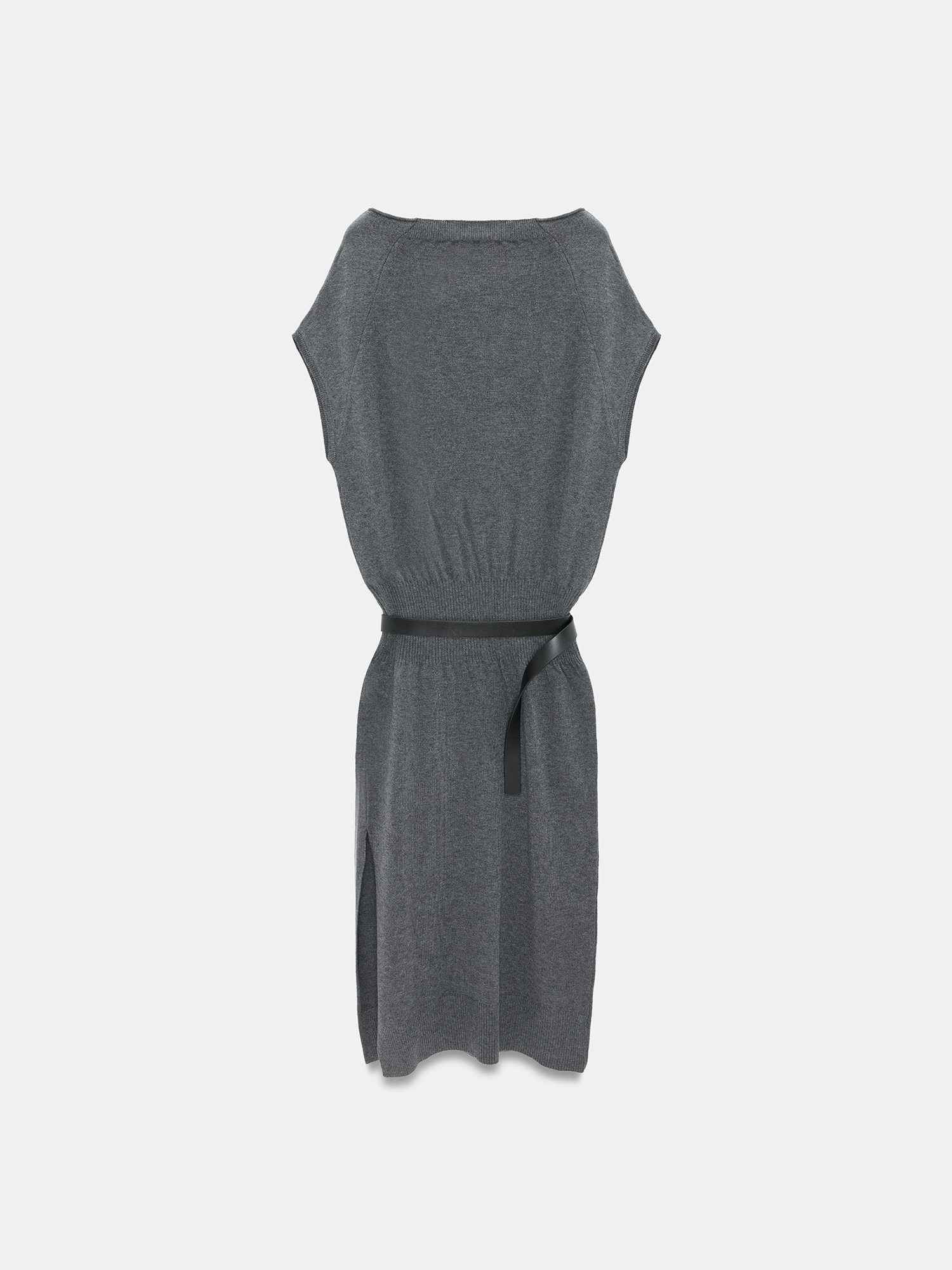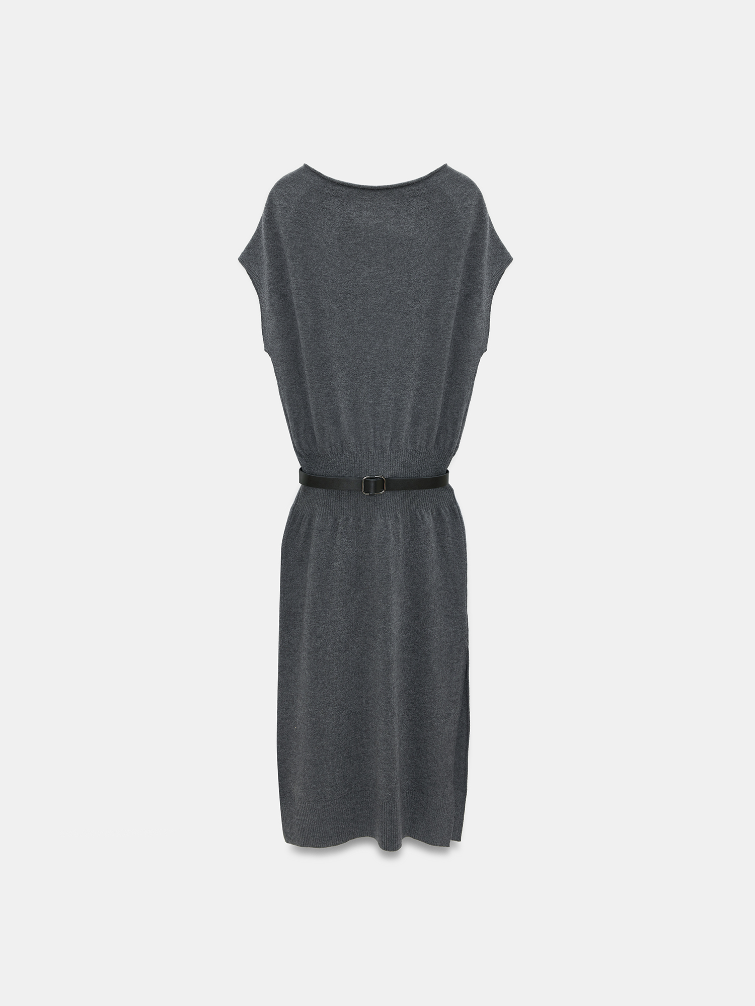 90256 Yün Karışımlı Kemerli Triko Elbise-Füme M.