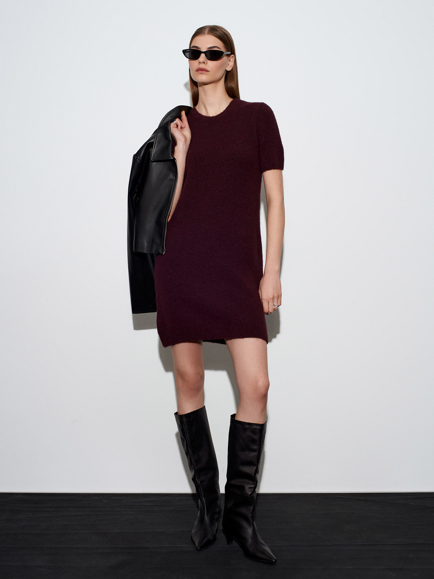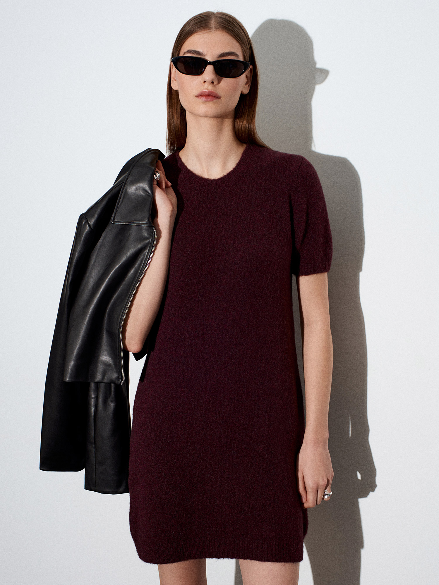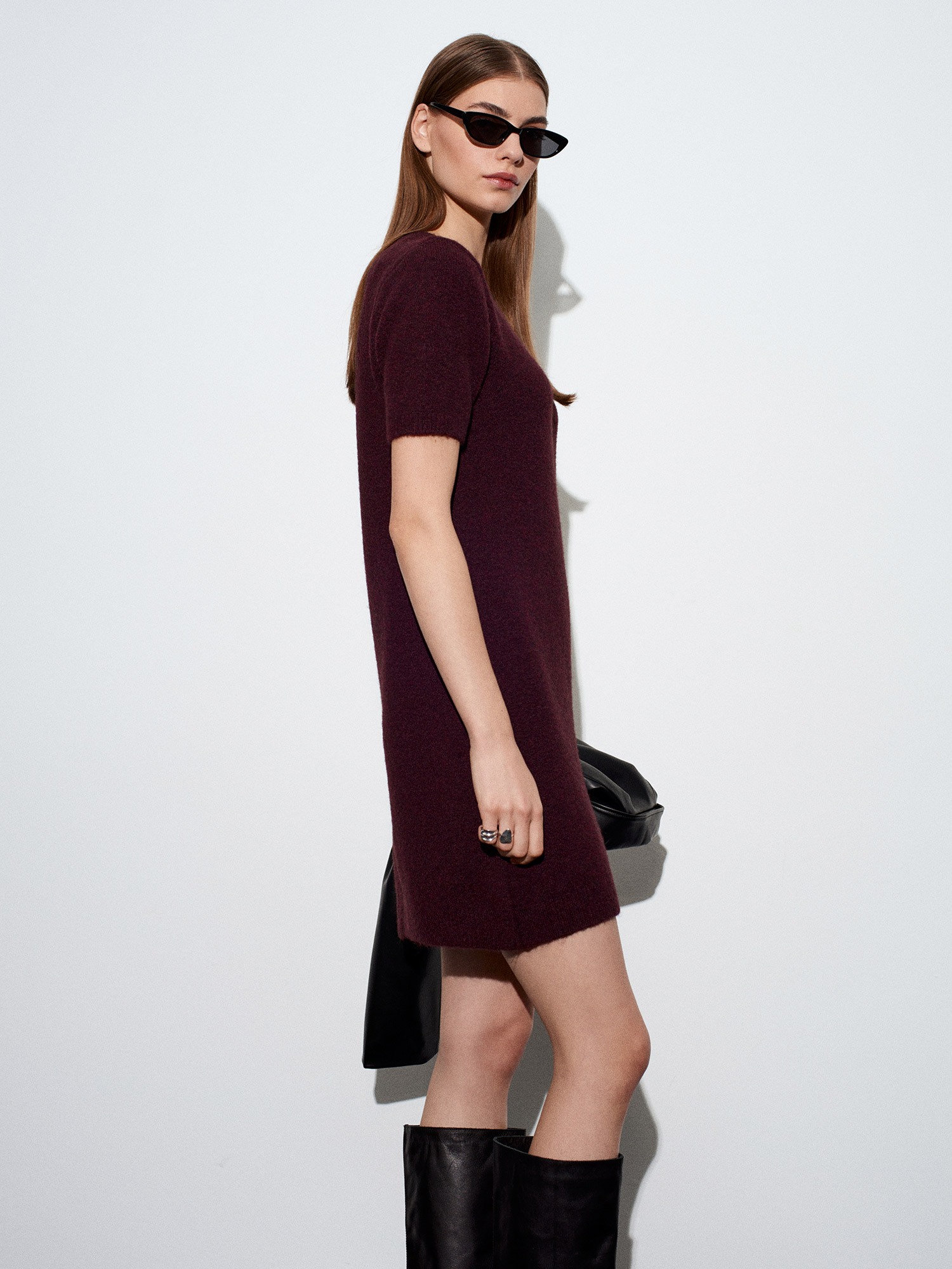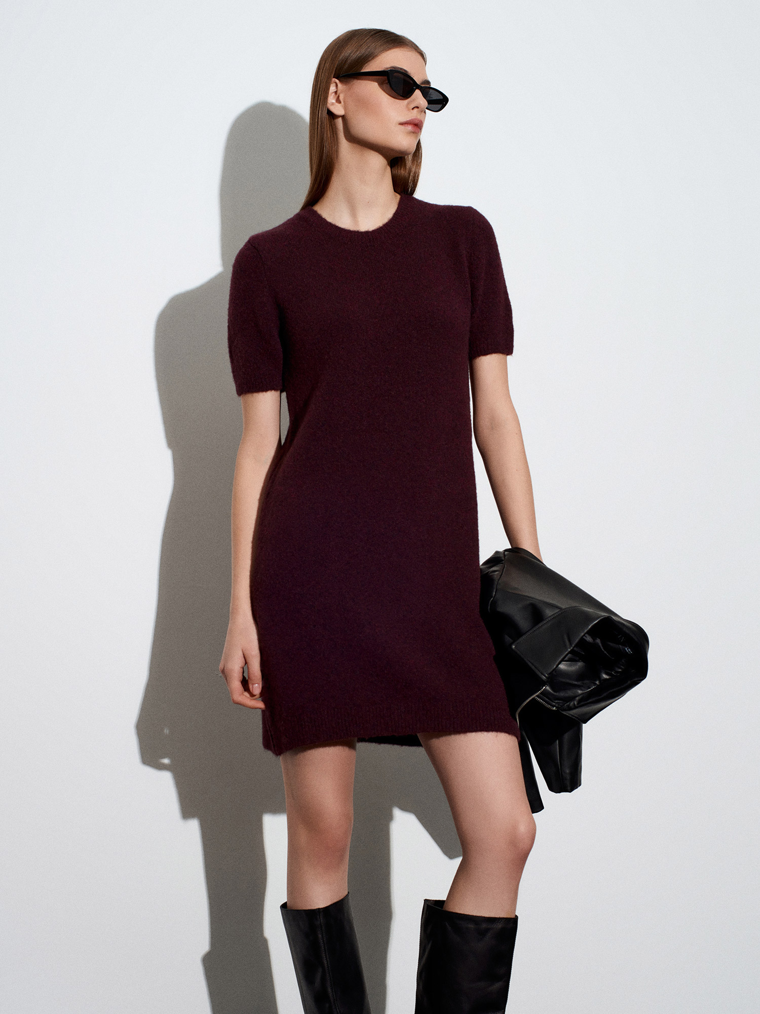 90257 Bisiklet Yaka Yün Karışımlı Triko Elbise-Koyu Bordo