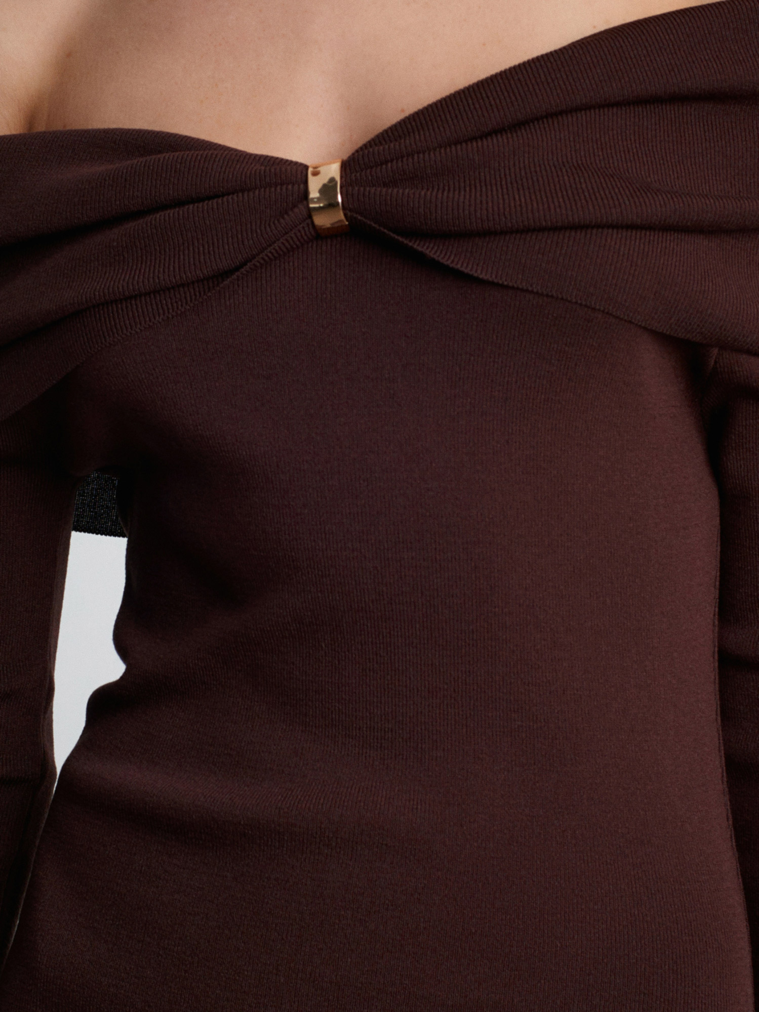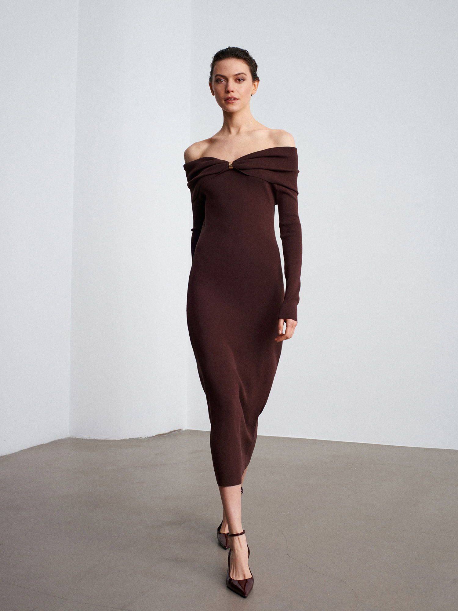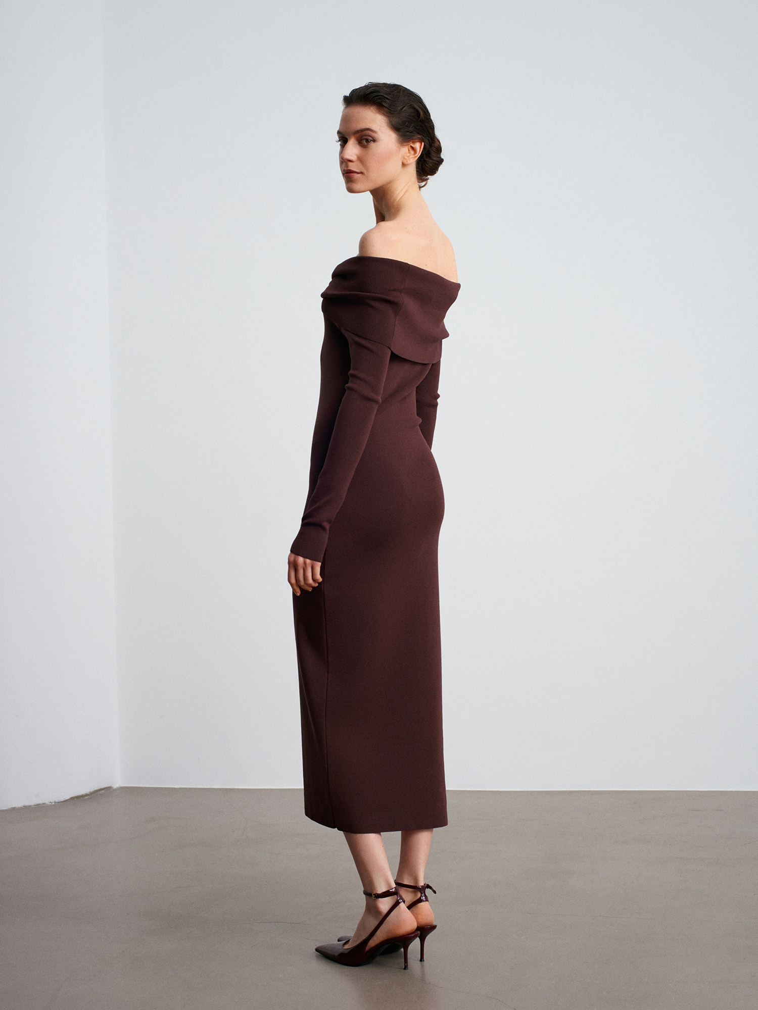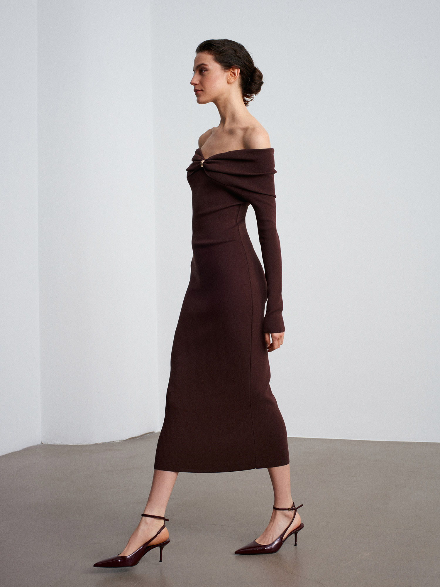 90261 Omzu Açık Fiyonk Detaylı Triko Elbise-Kahve