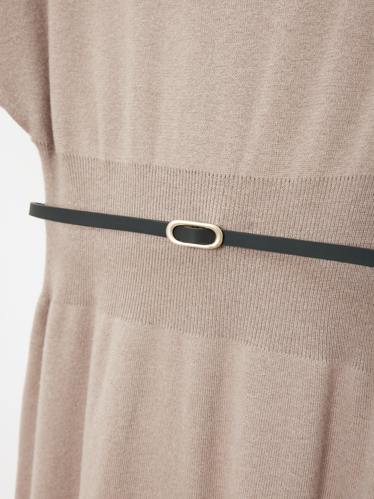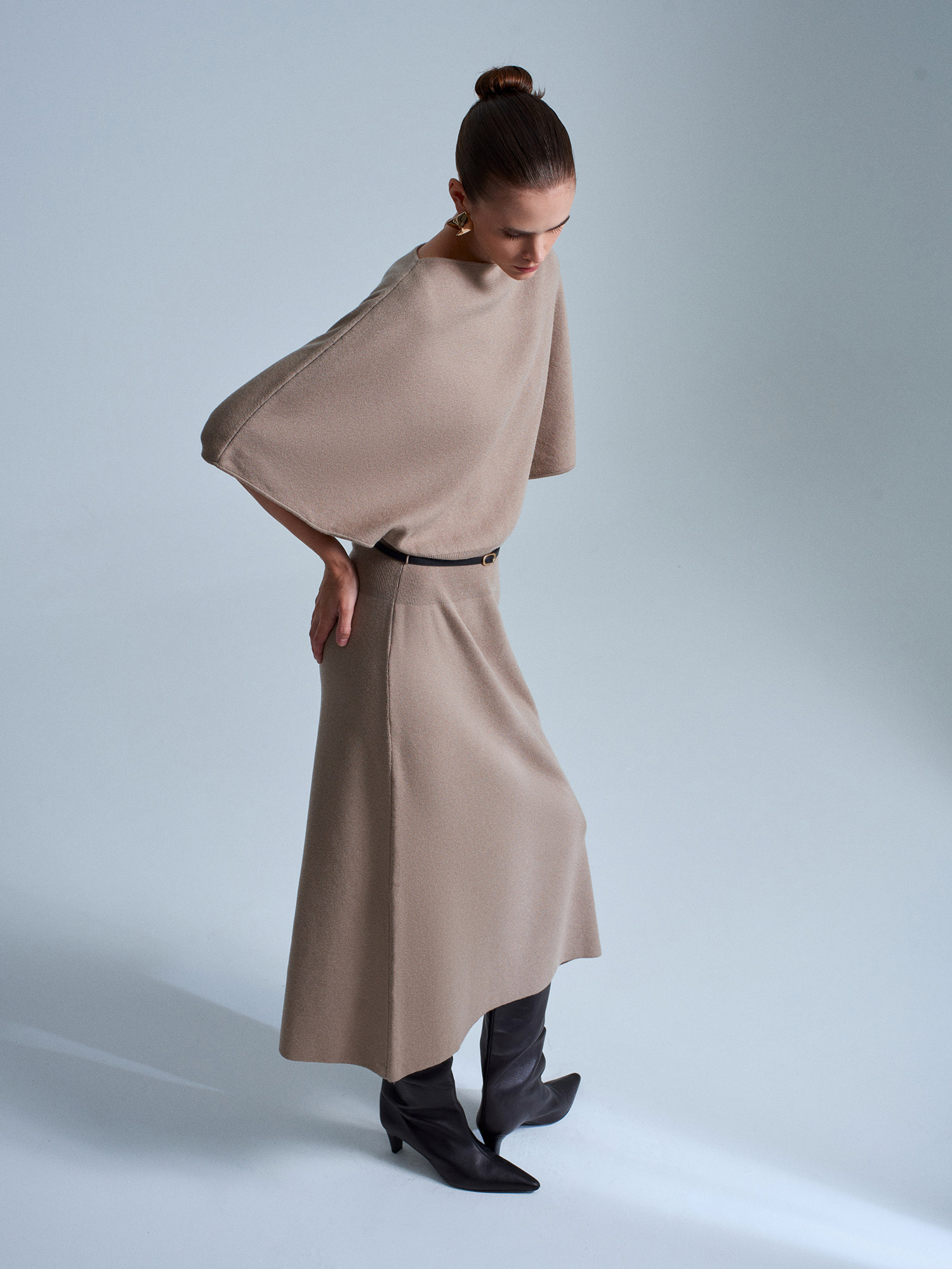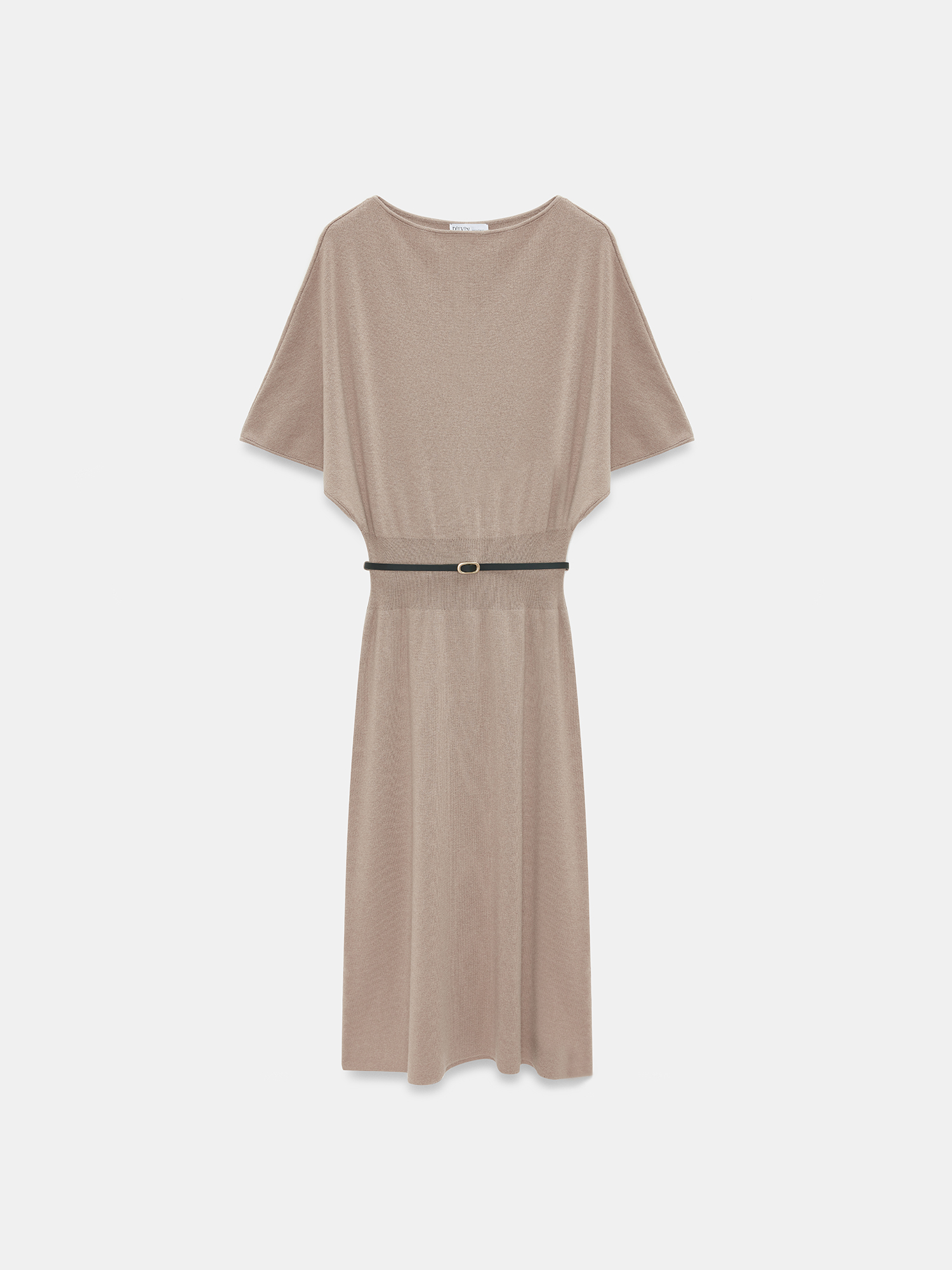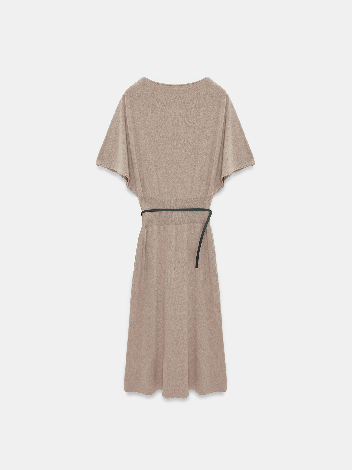 90266 Yün Karışımlı Kayık Yaka Kemerli Triko Elbise-K.Vizon M.