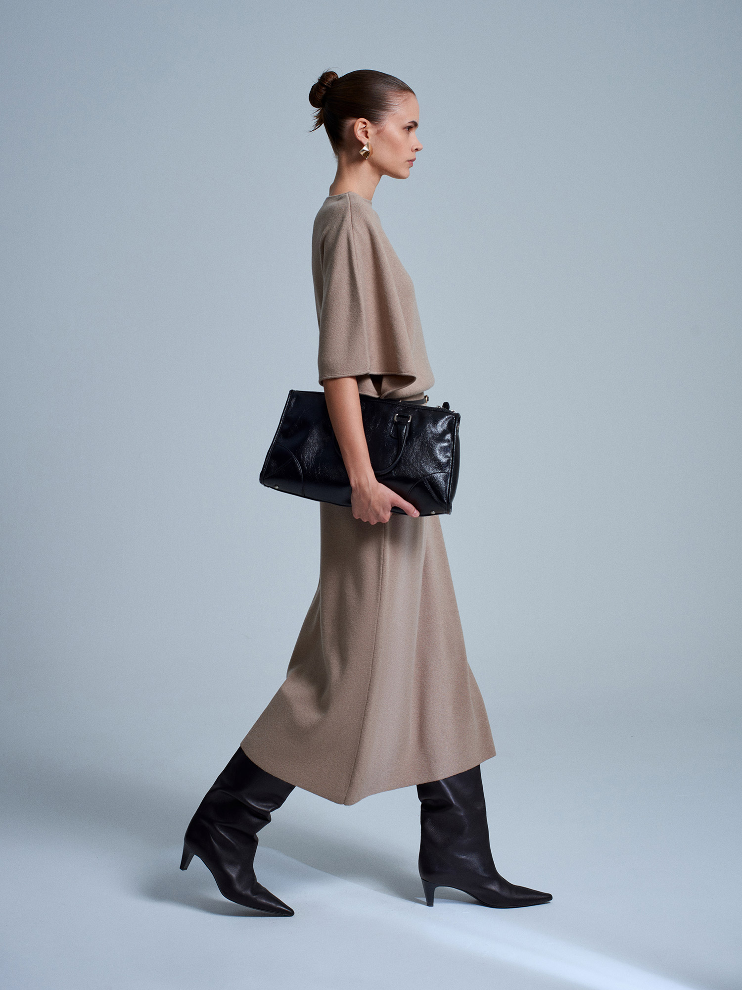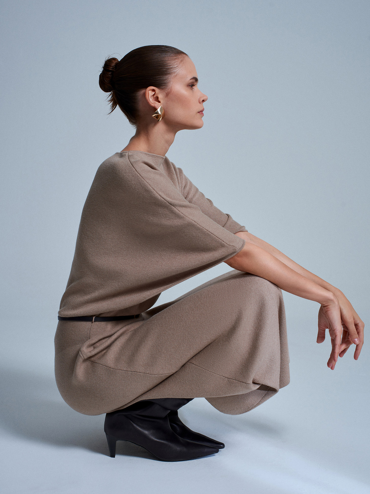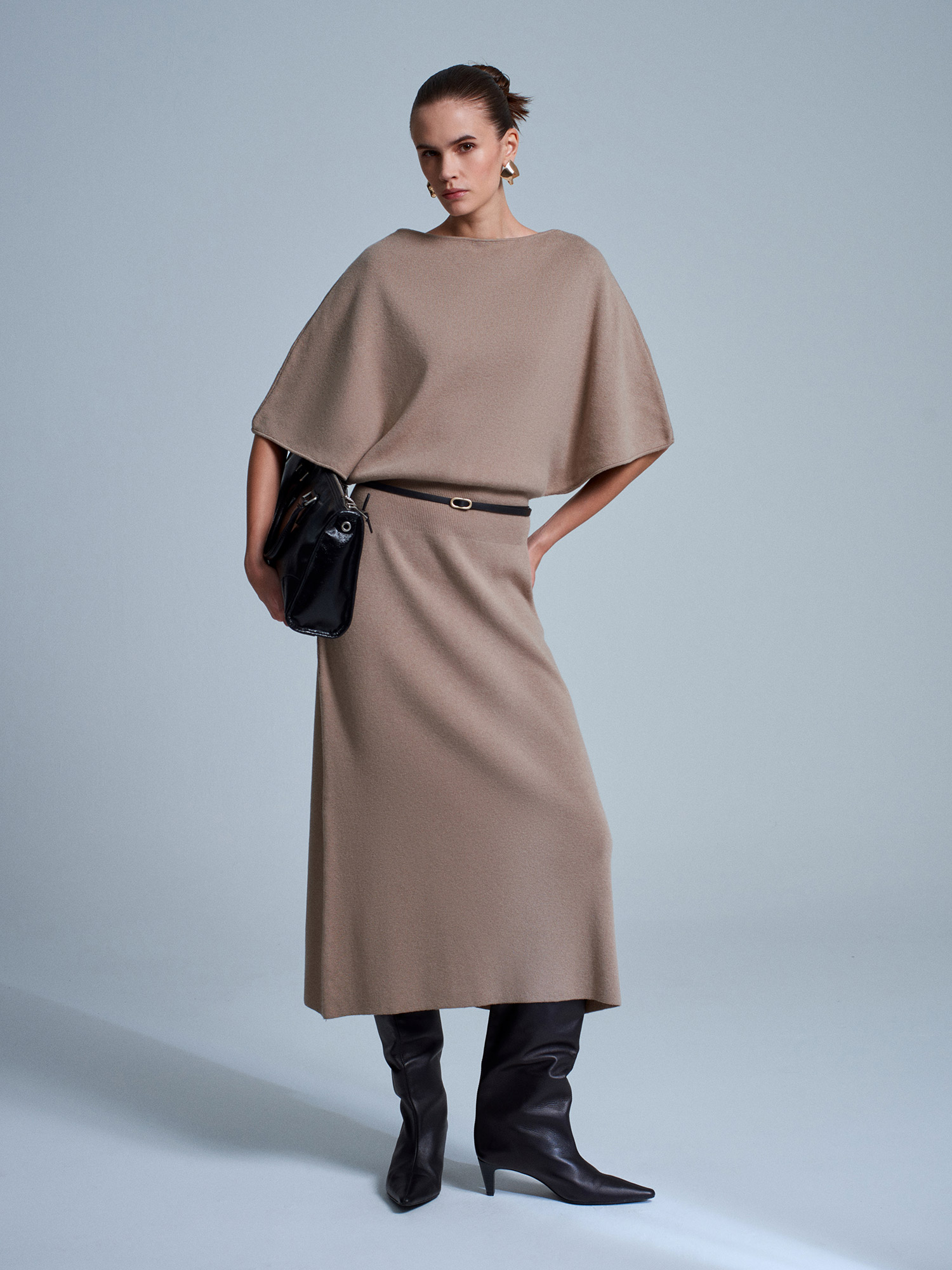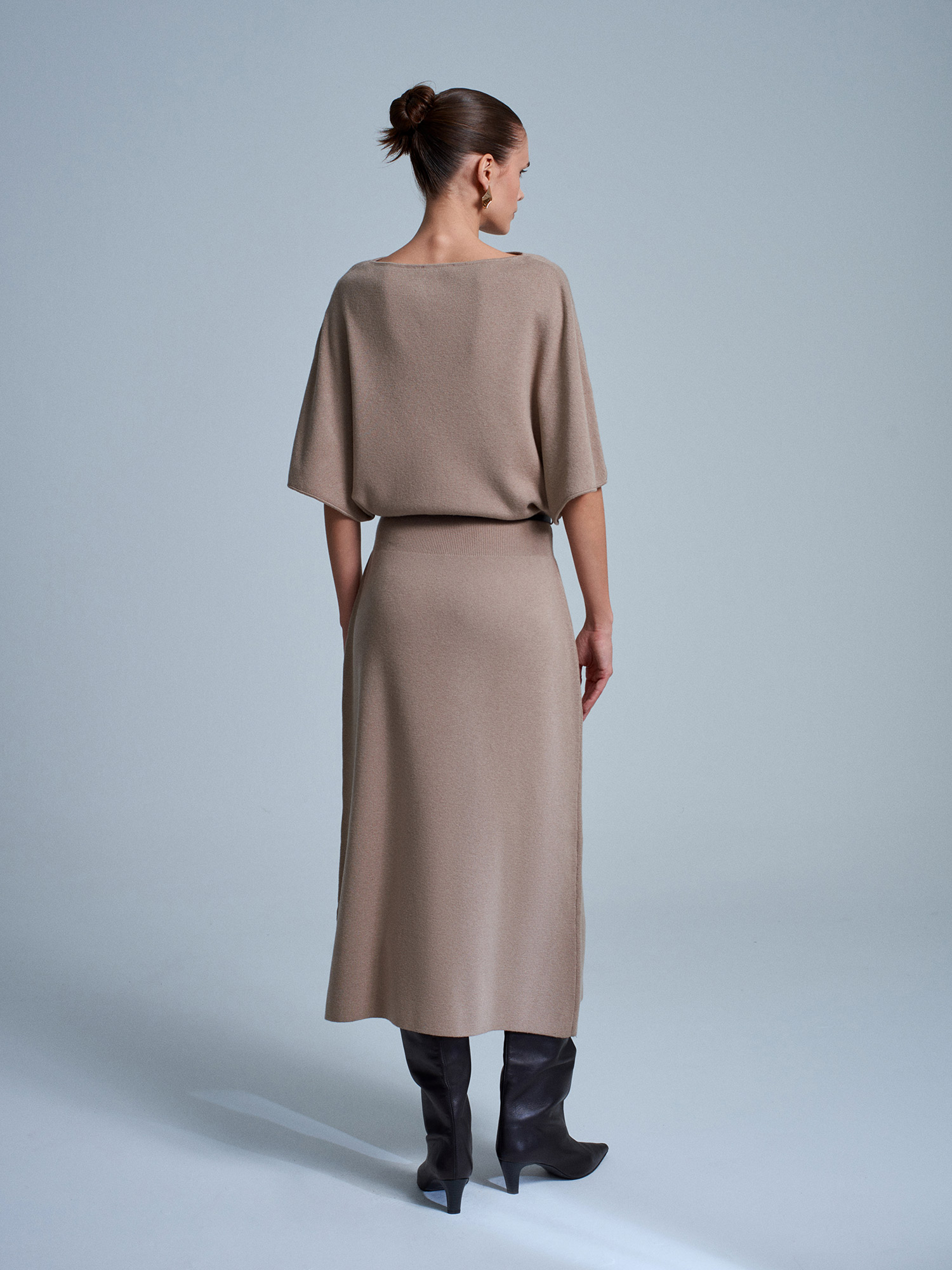 90266 Yün Karışımlı Kayık Yaka Kemerli Triko Elbise-K.Vizon M.