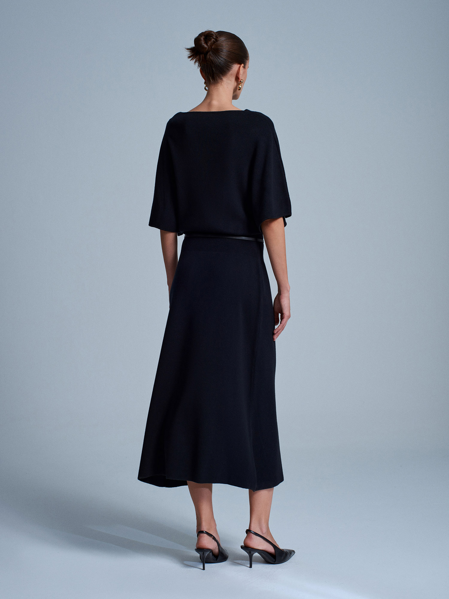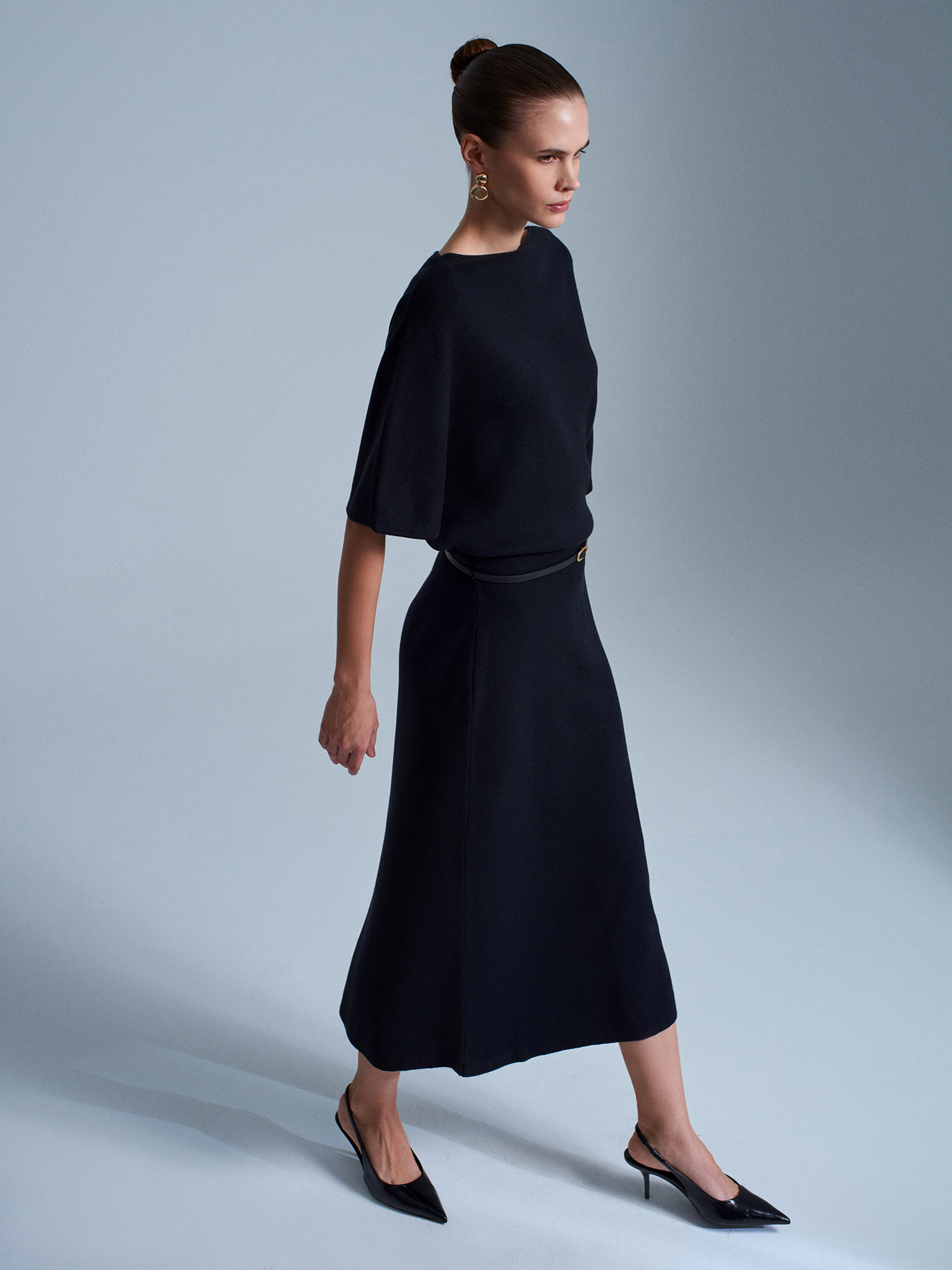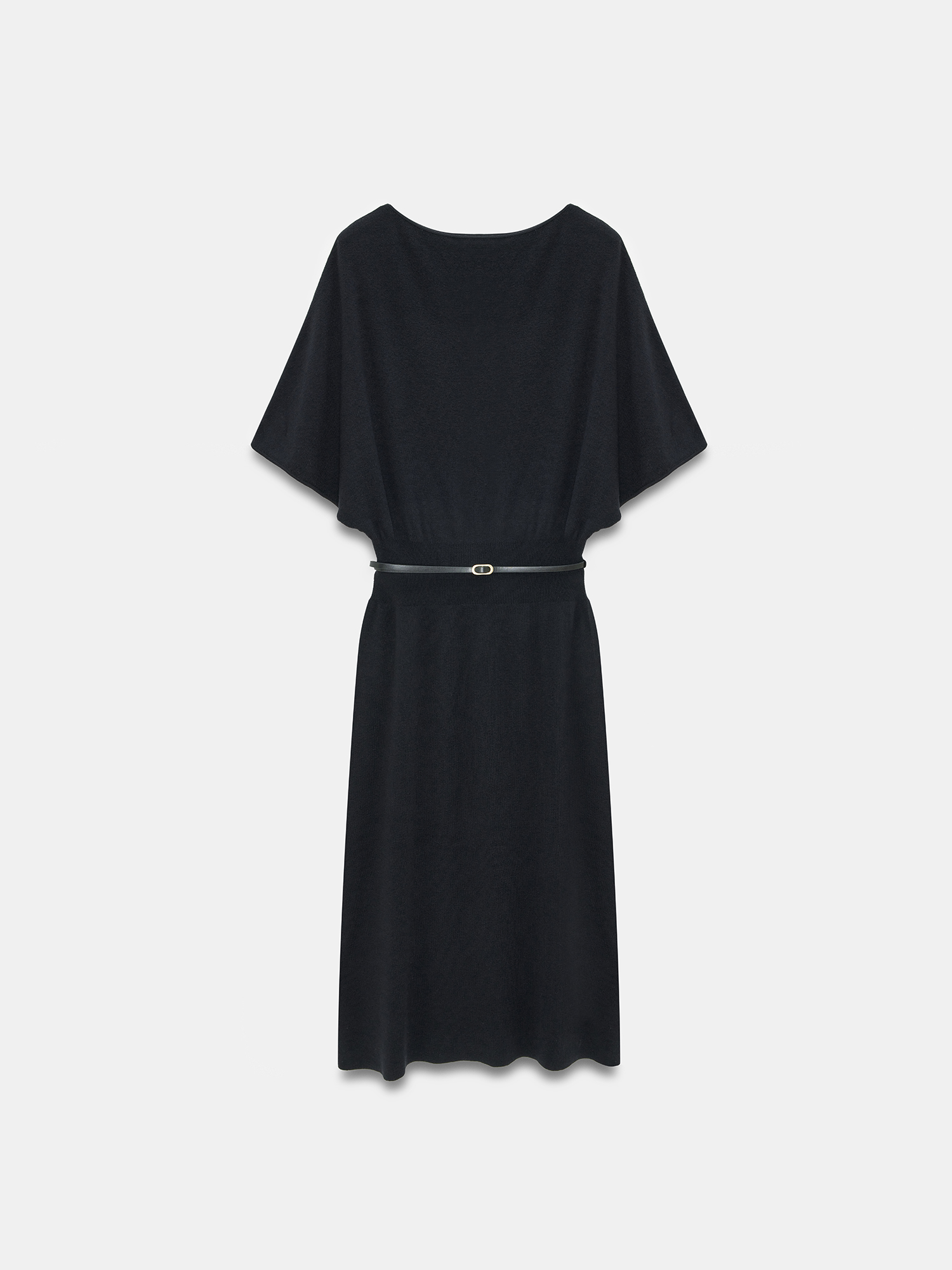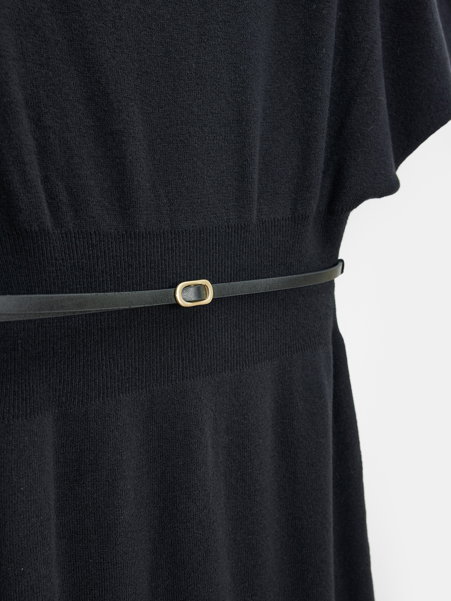 90266 Yün Karışımlı Kayık Yaka Kemerli Triko Elbise-Siyah