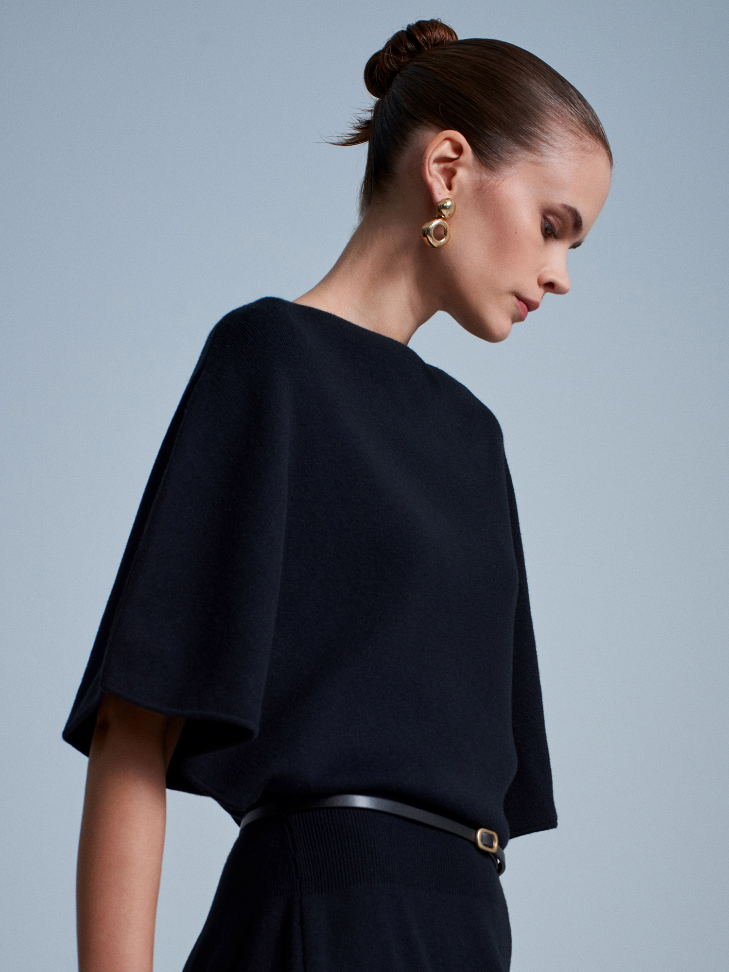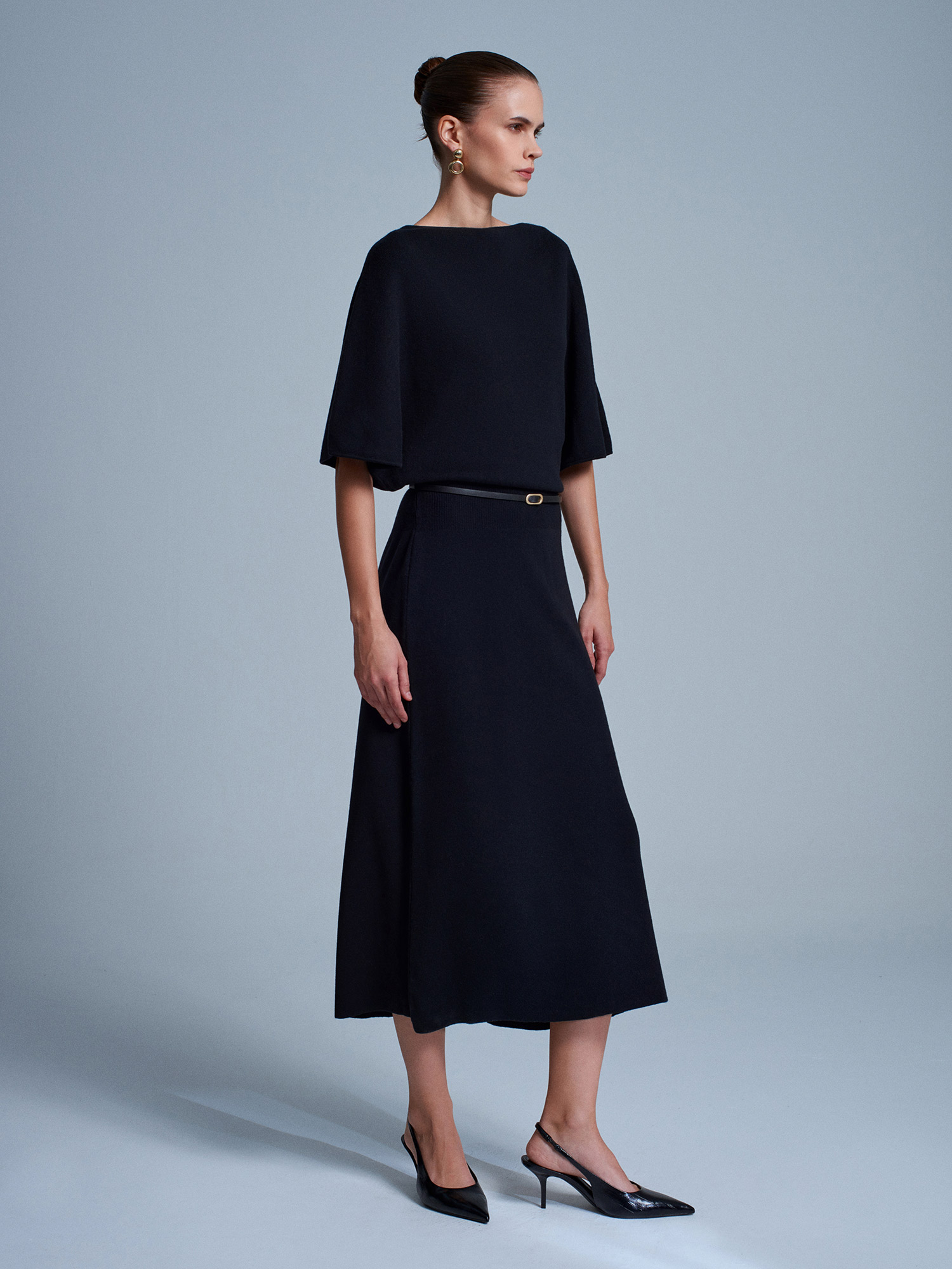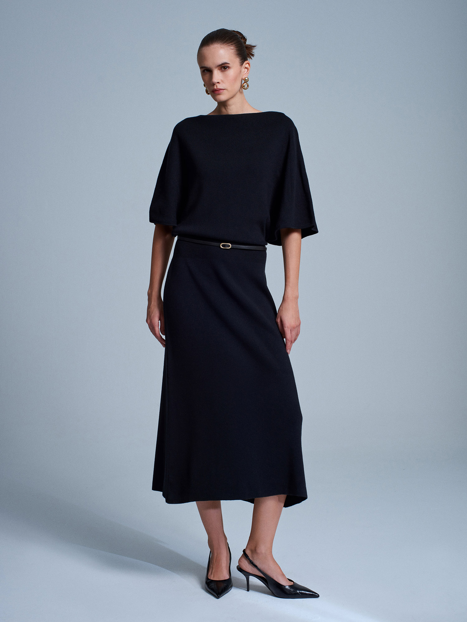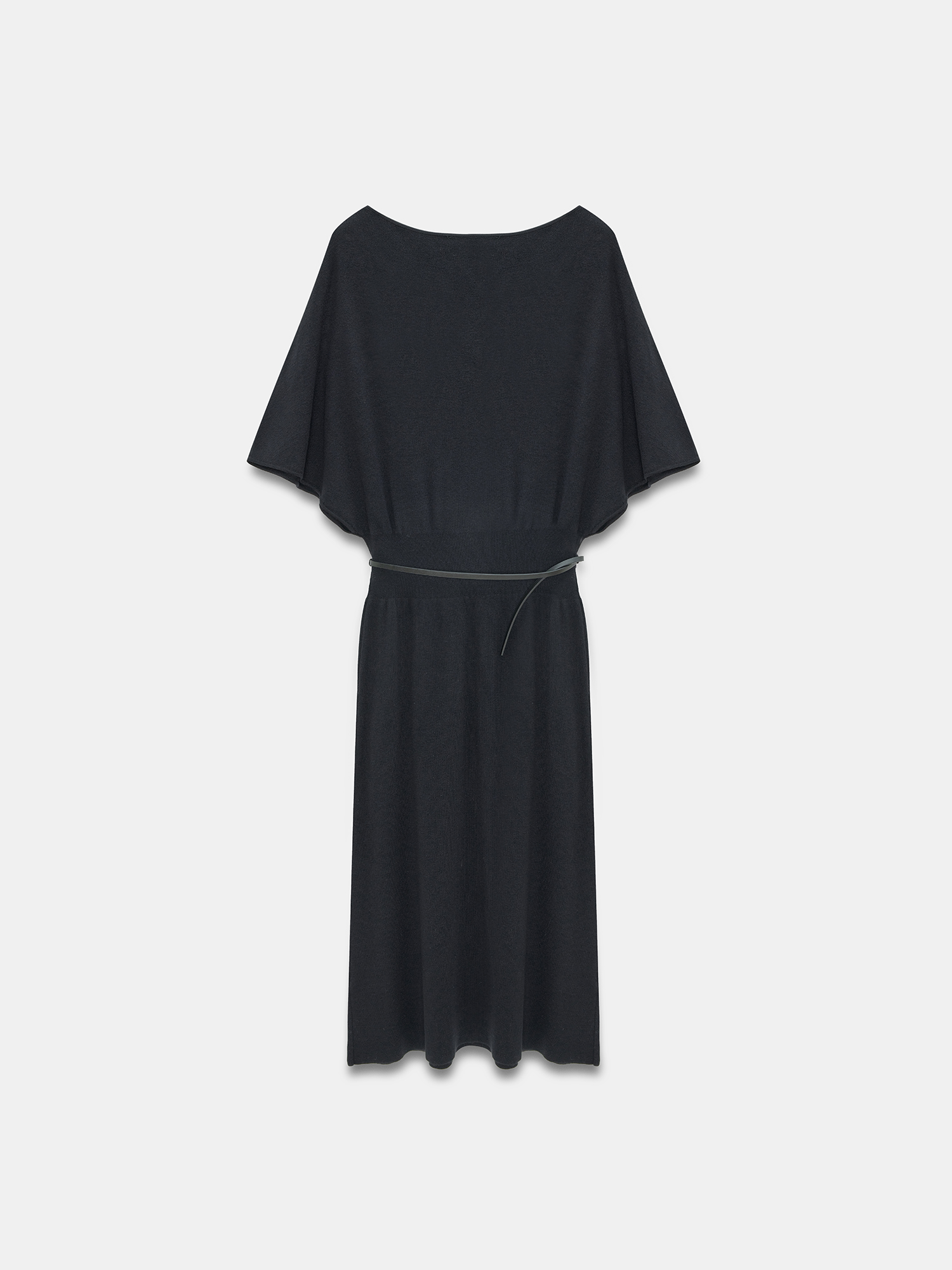 90266 Yün Karışımlı Kayık Yaka Kemerli Triko Elbise-Siyah