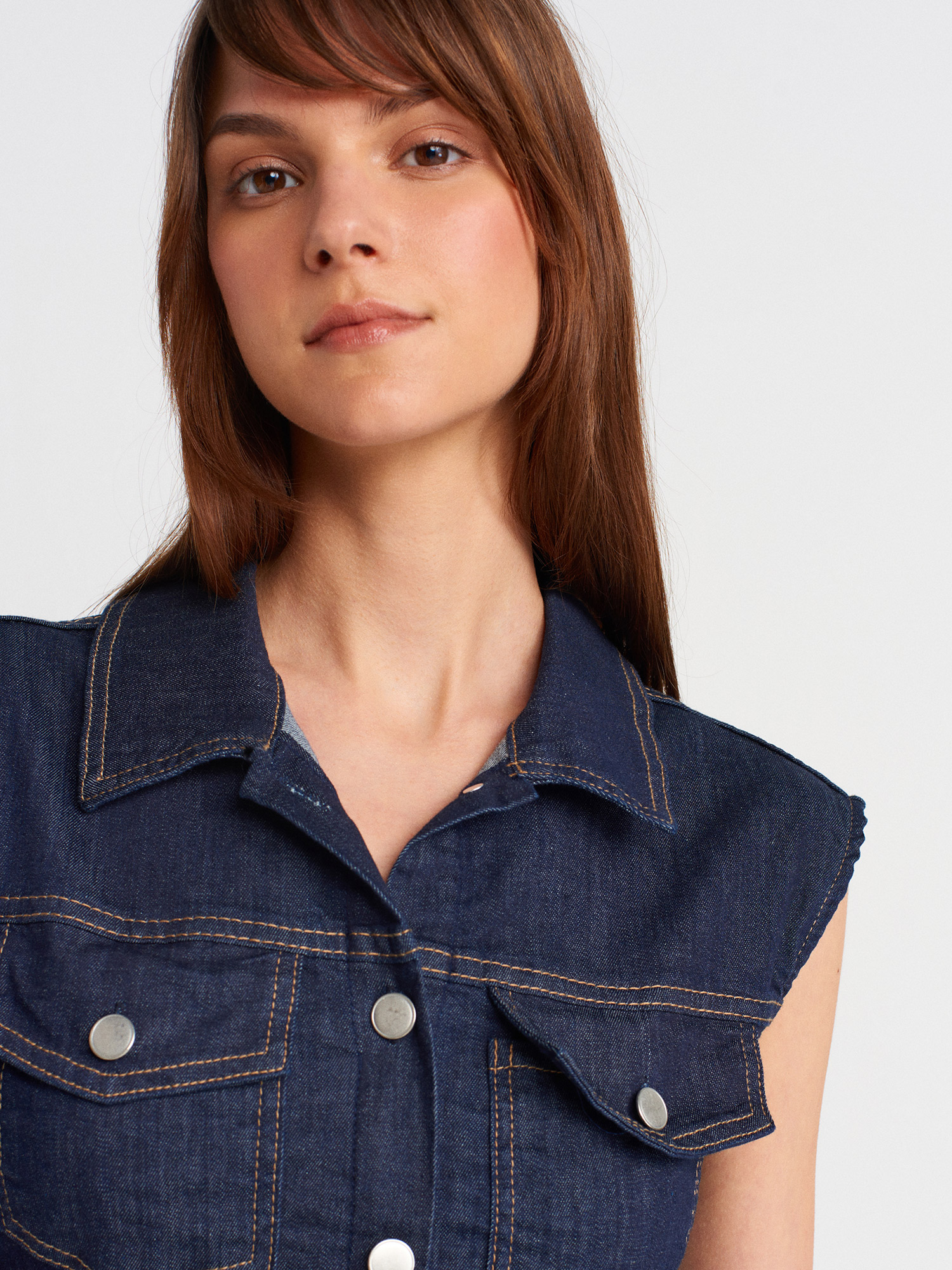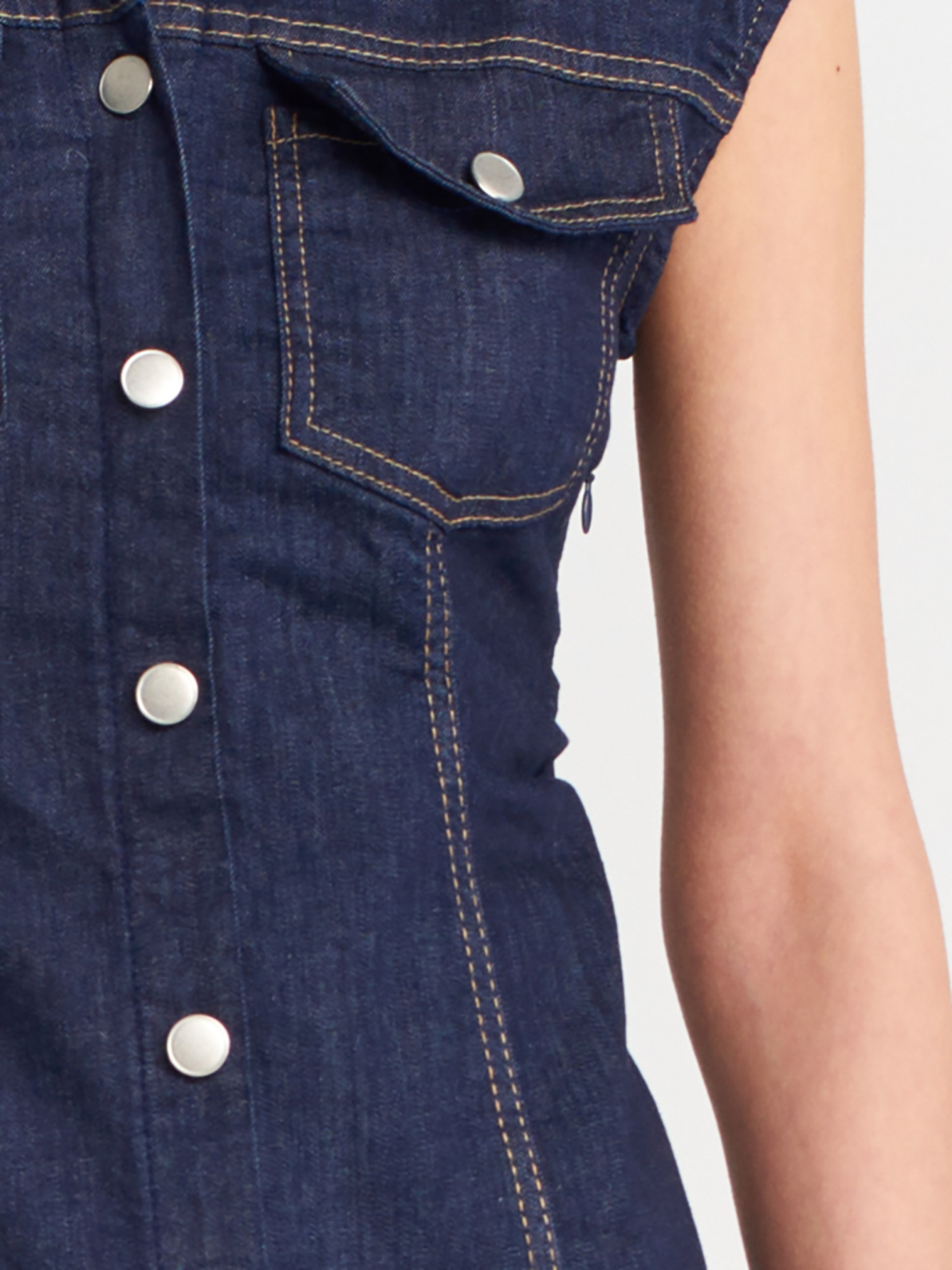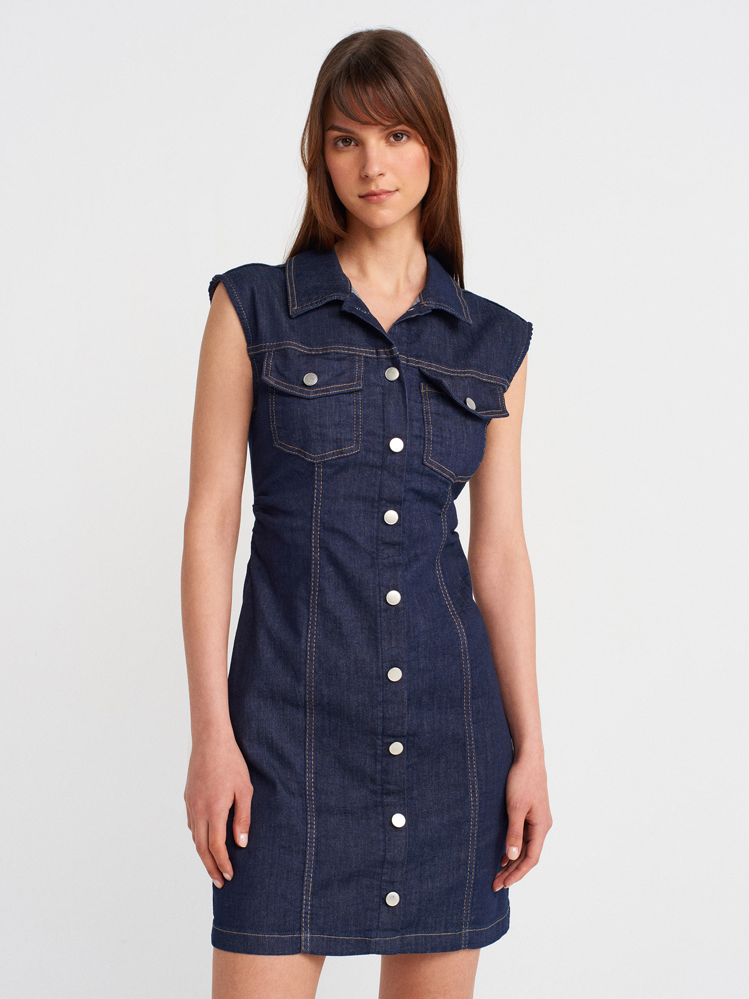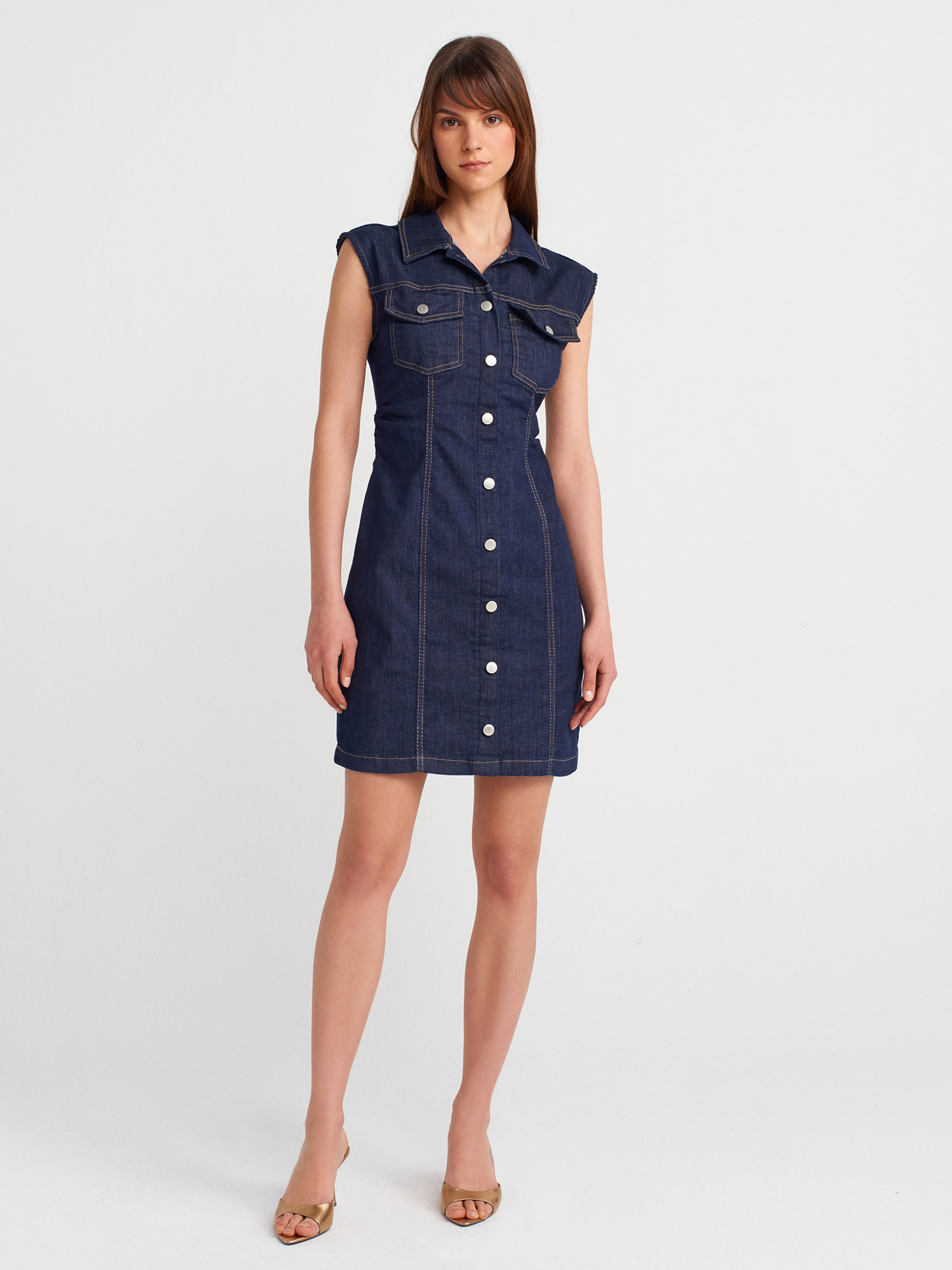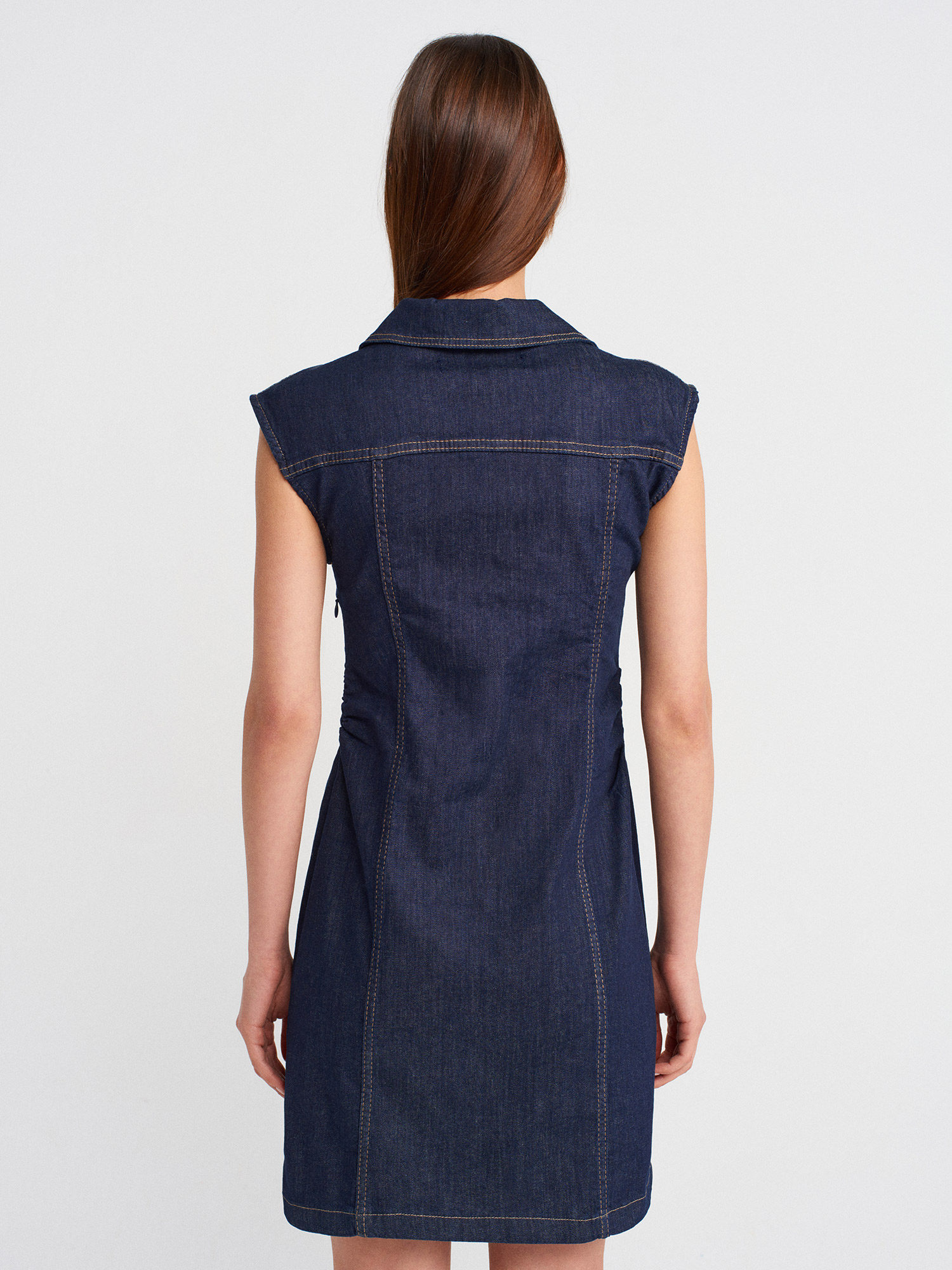90557 Yanları Büzgülü Mini Denim Elbise-Lacivert