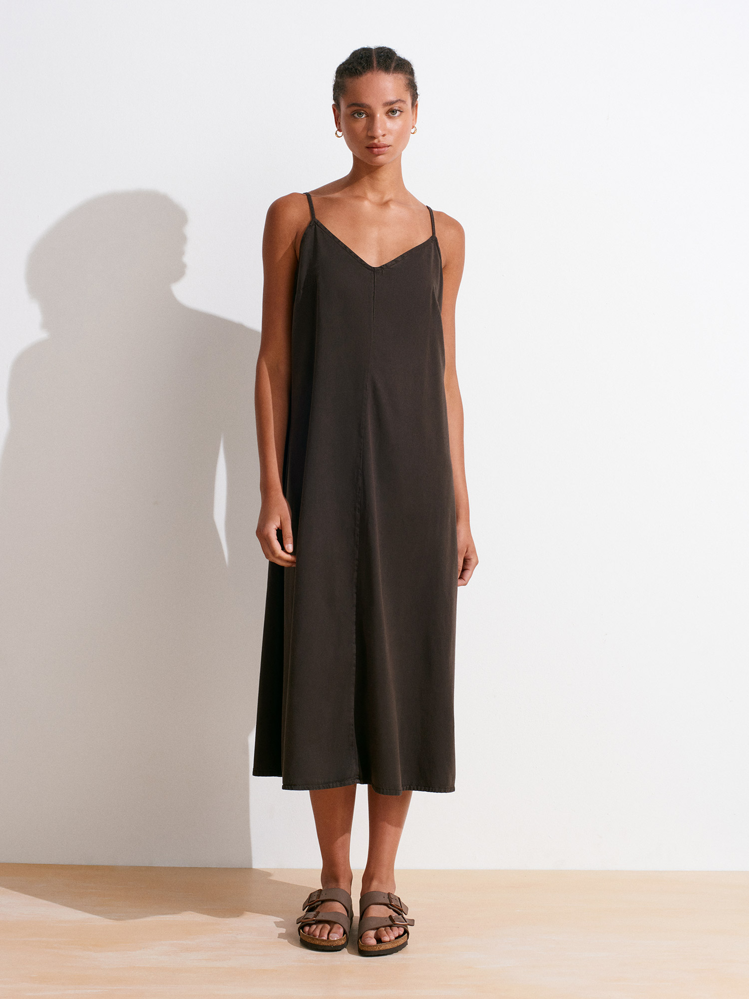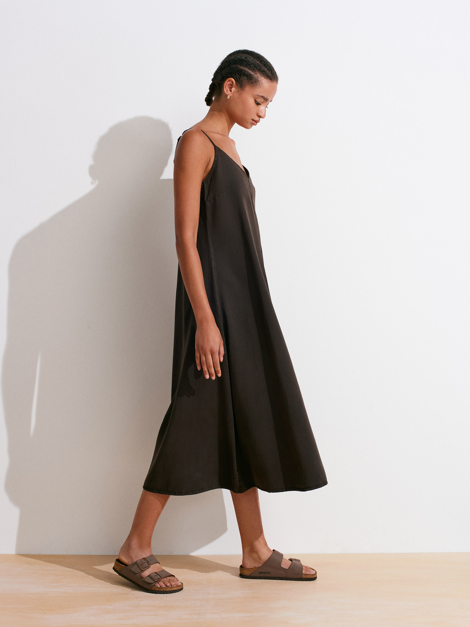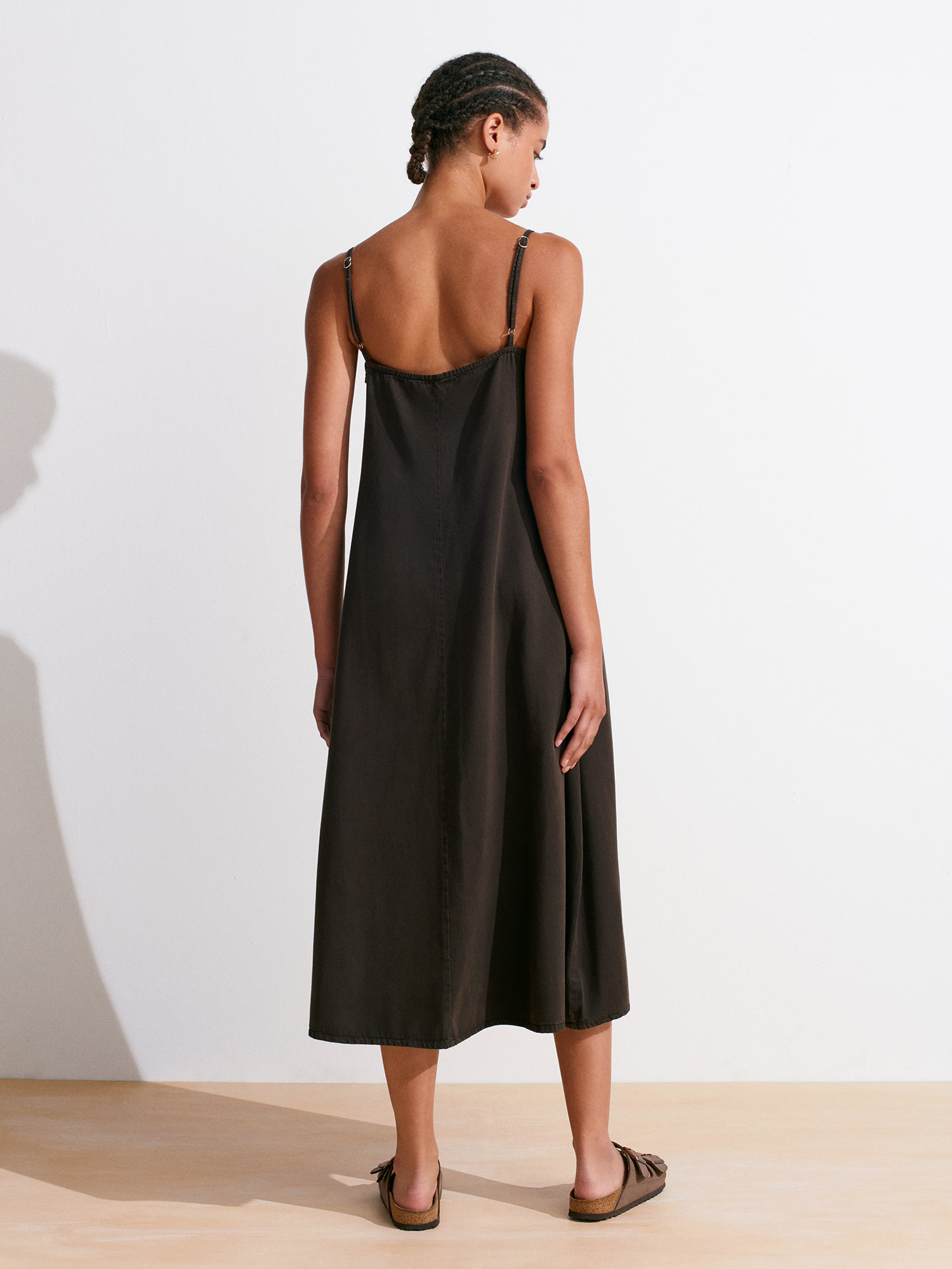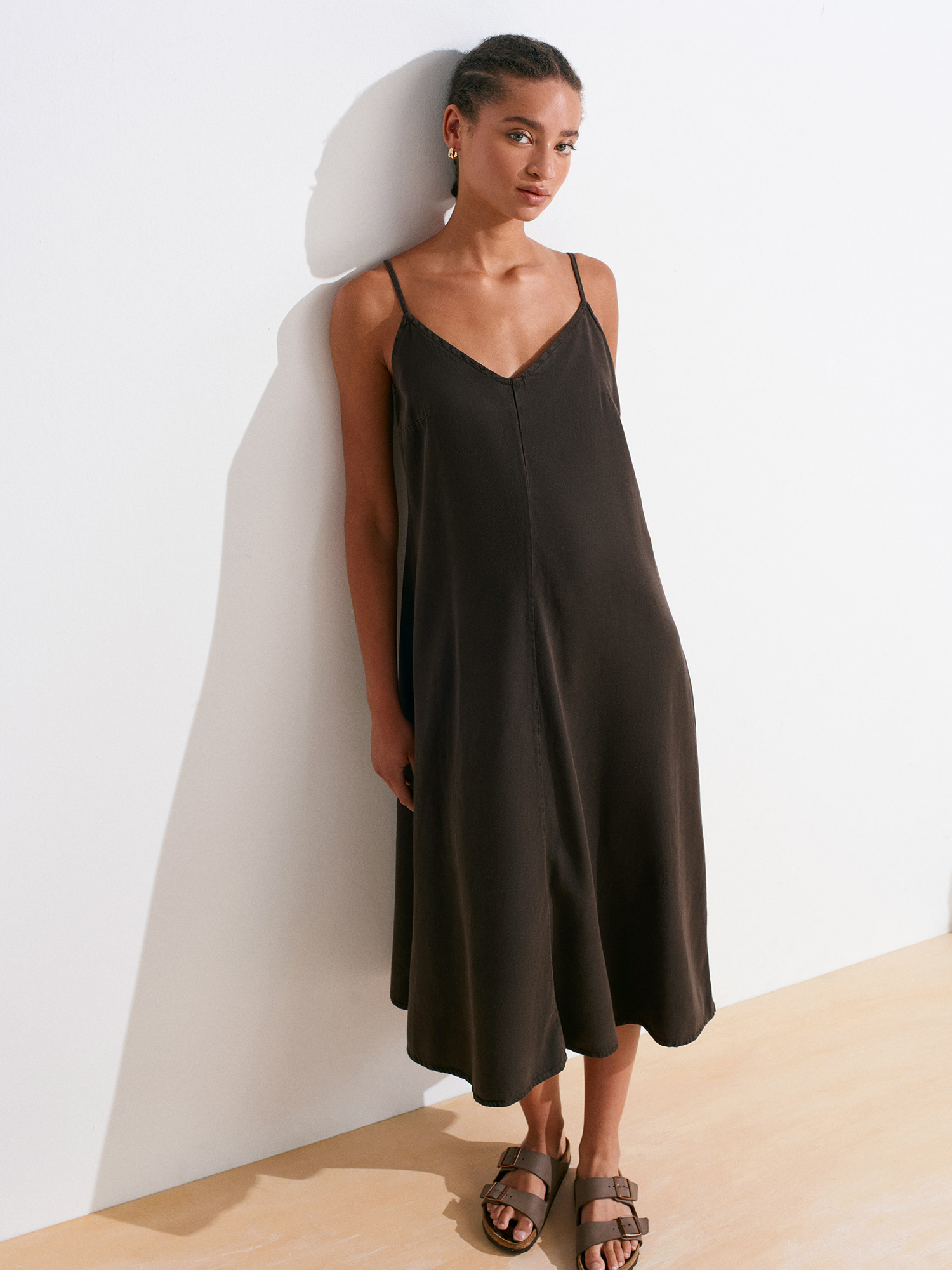 90562 İnce Askılı Parçaboya Denim Elbise-Kahve