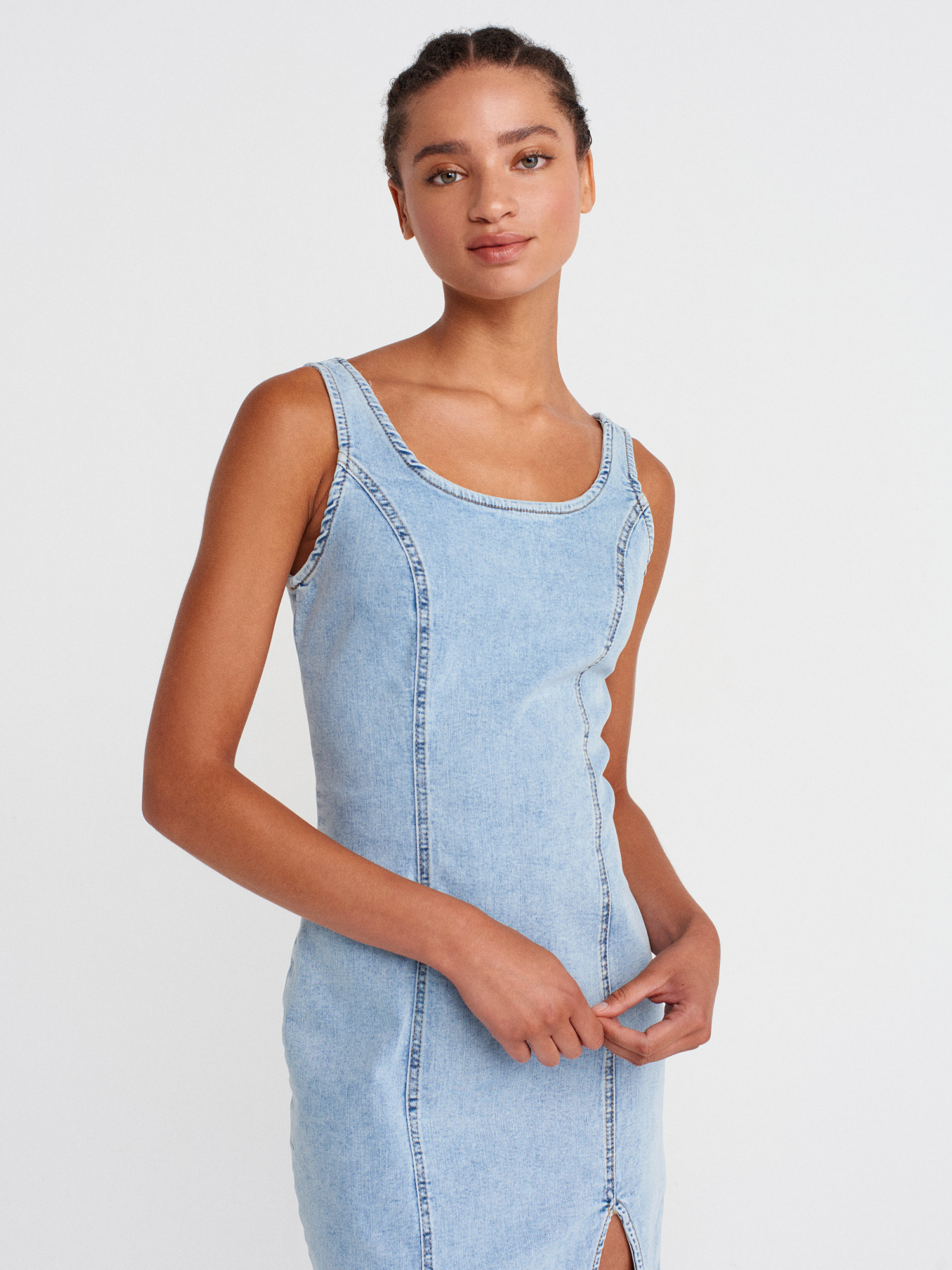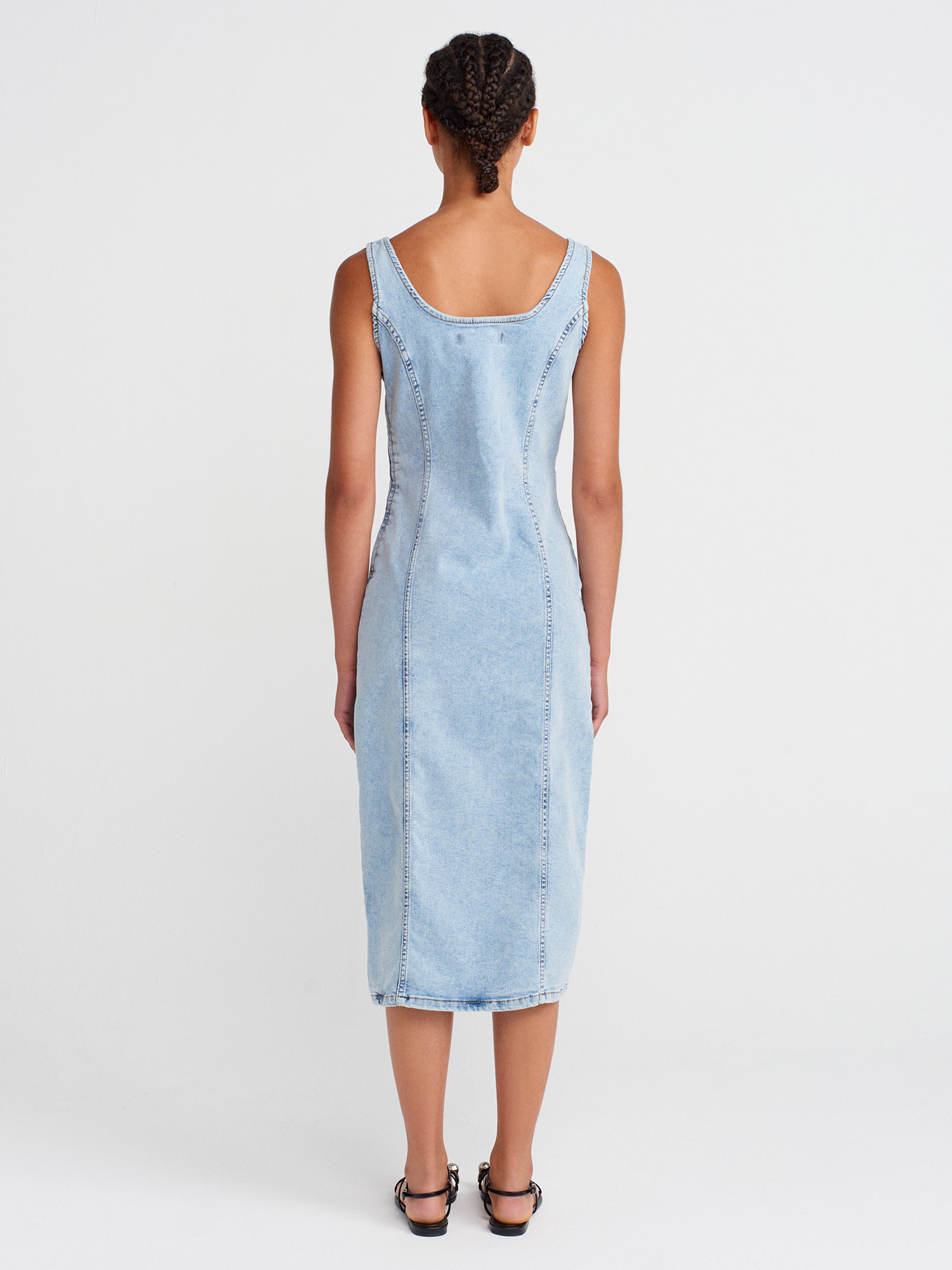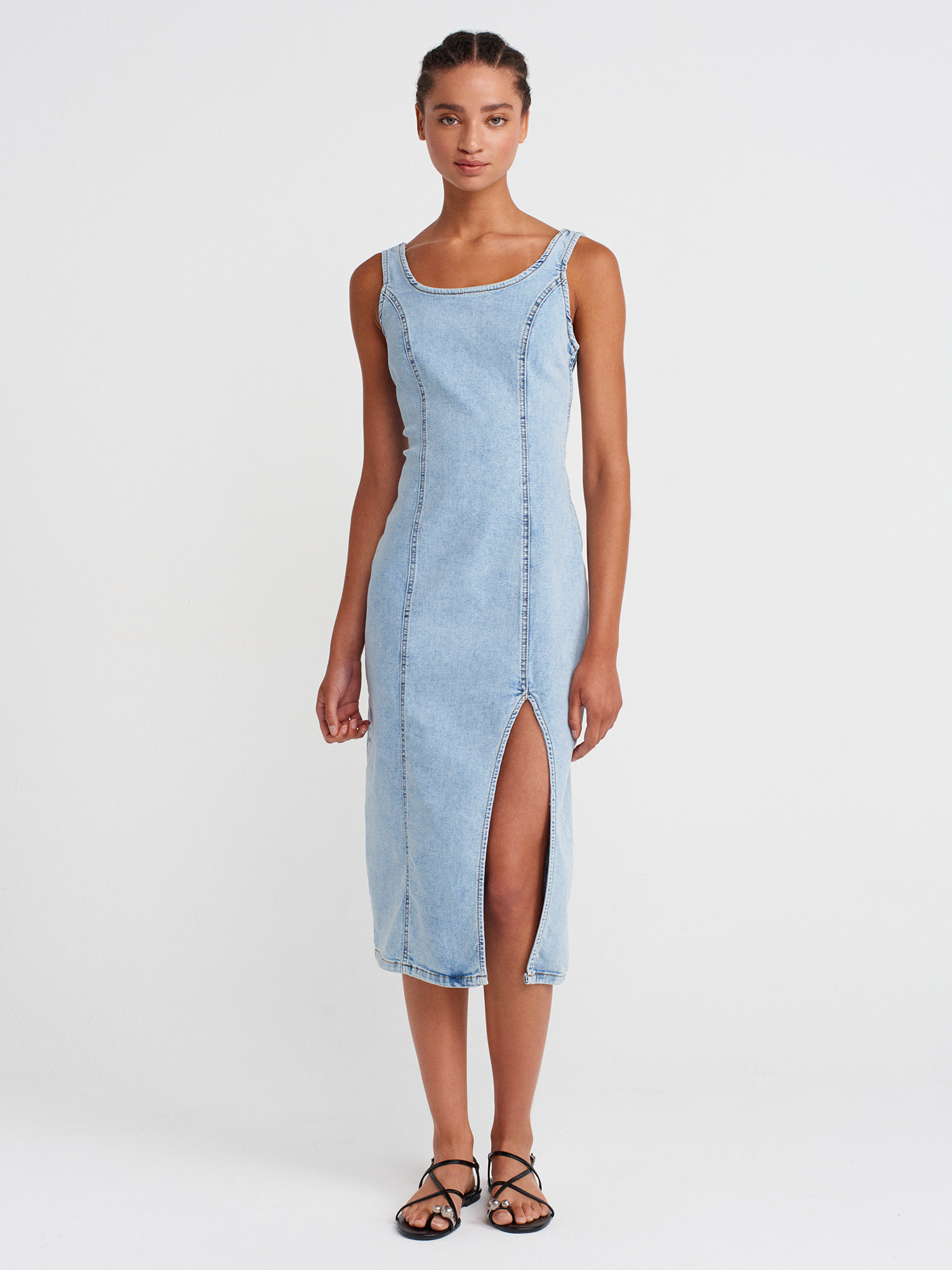 90565 Önü Derin Yırtmaçlı Denim Elbise-Mavi