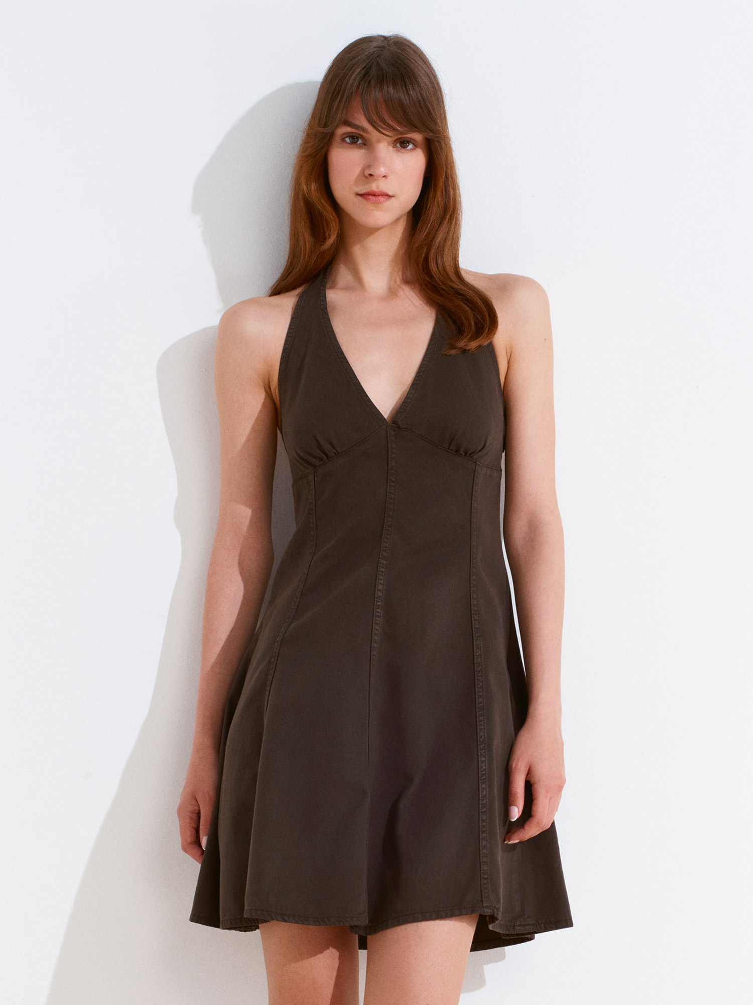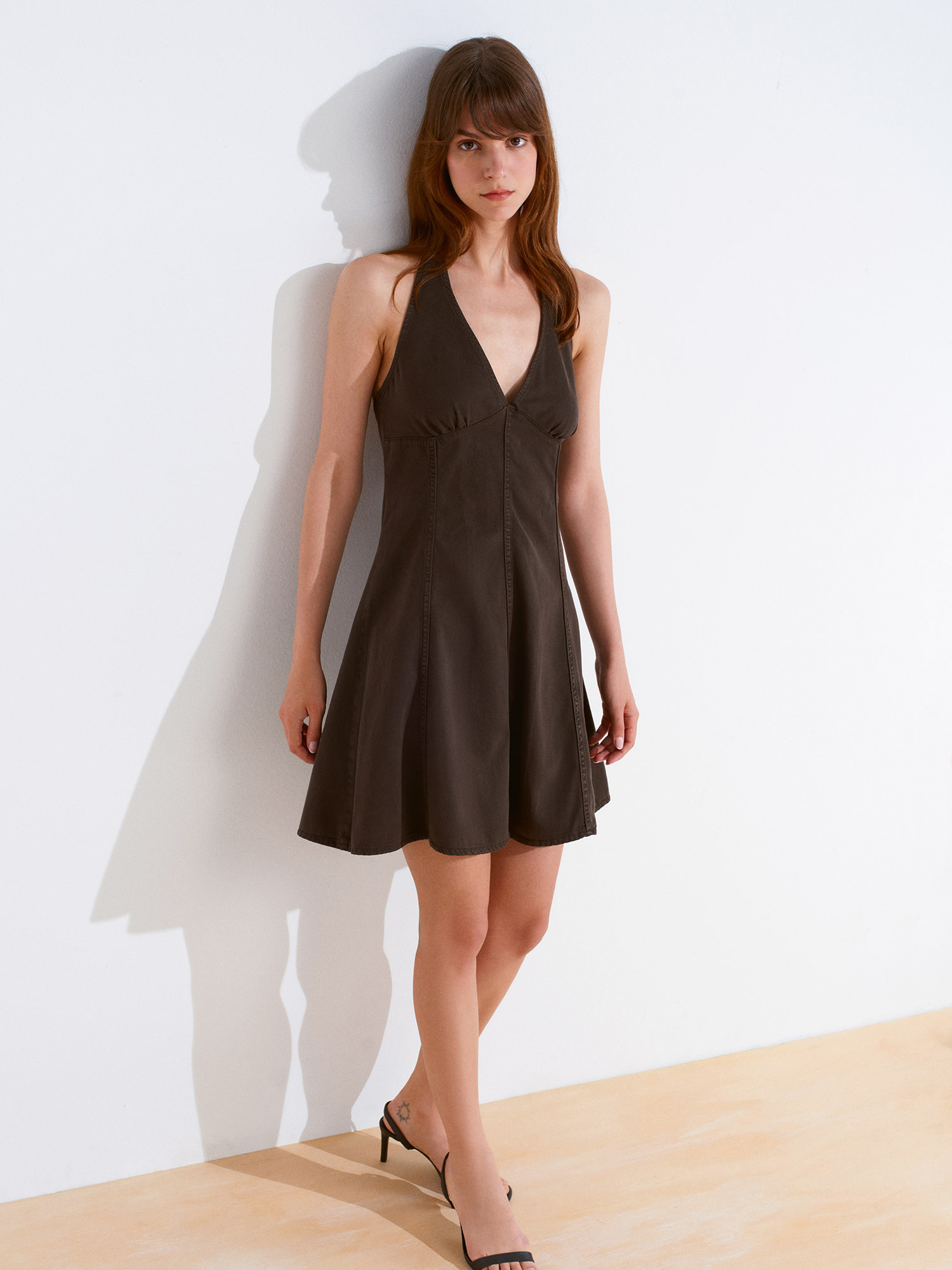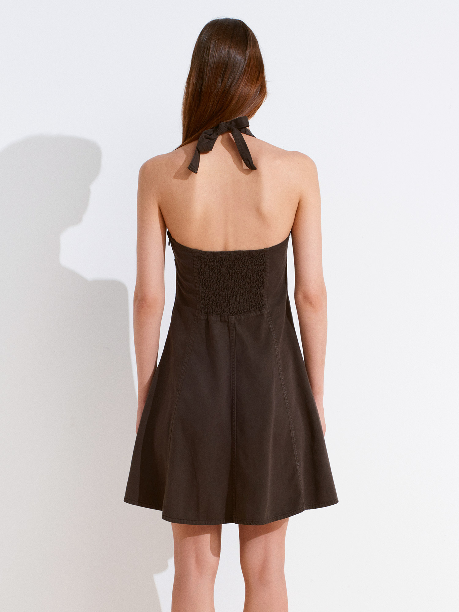 90568 Arka Bölümü Lastikli Kısa Denim Elbise-Kahve