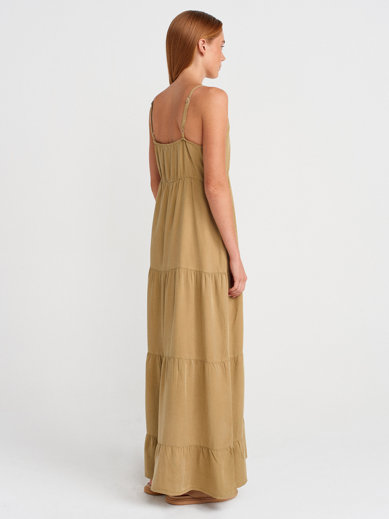 90573 Büzgülü Uzun Denim Elbise-Çağla