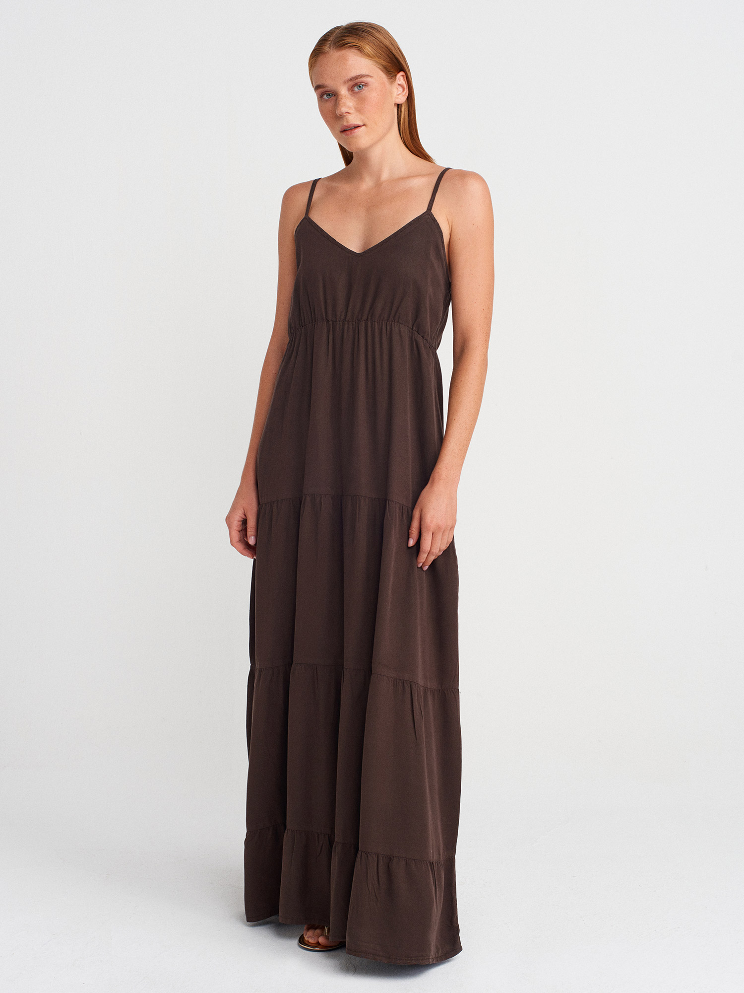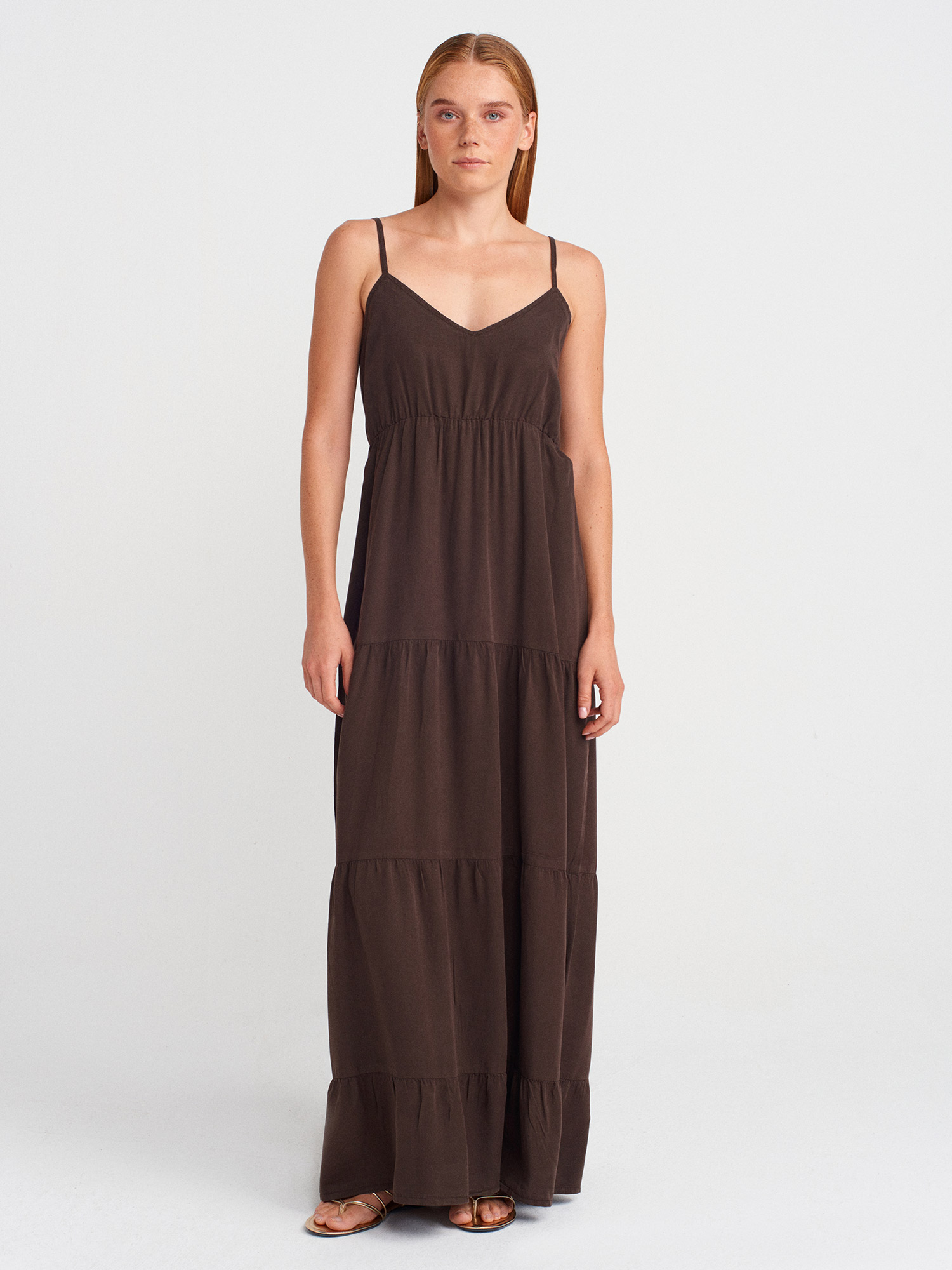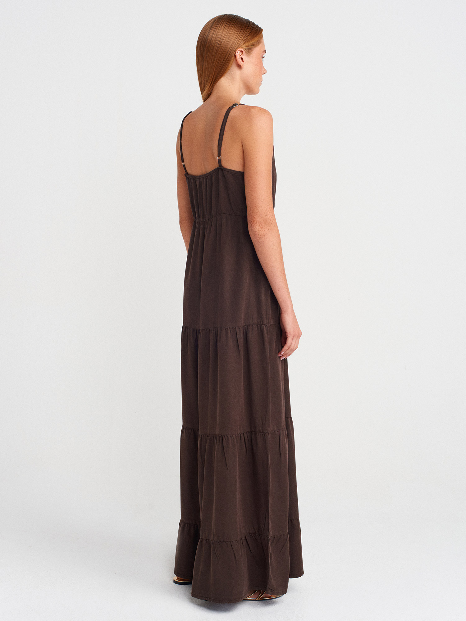 90573 Büzgülü Uzun Denim Elbise-Kahve