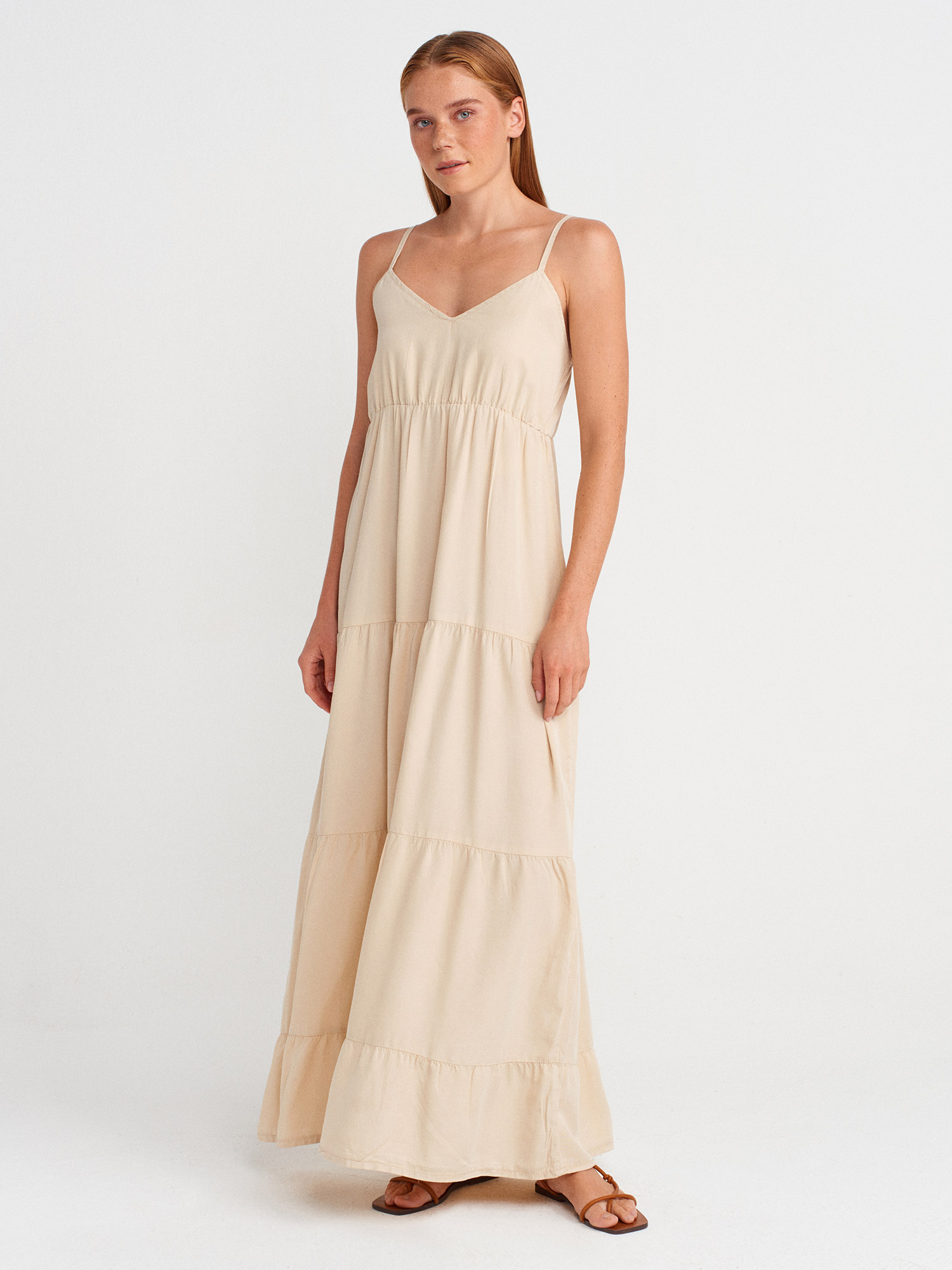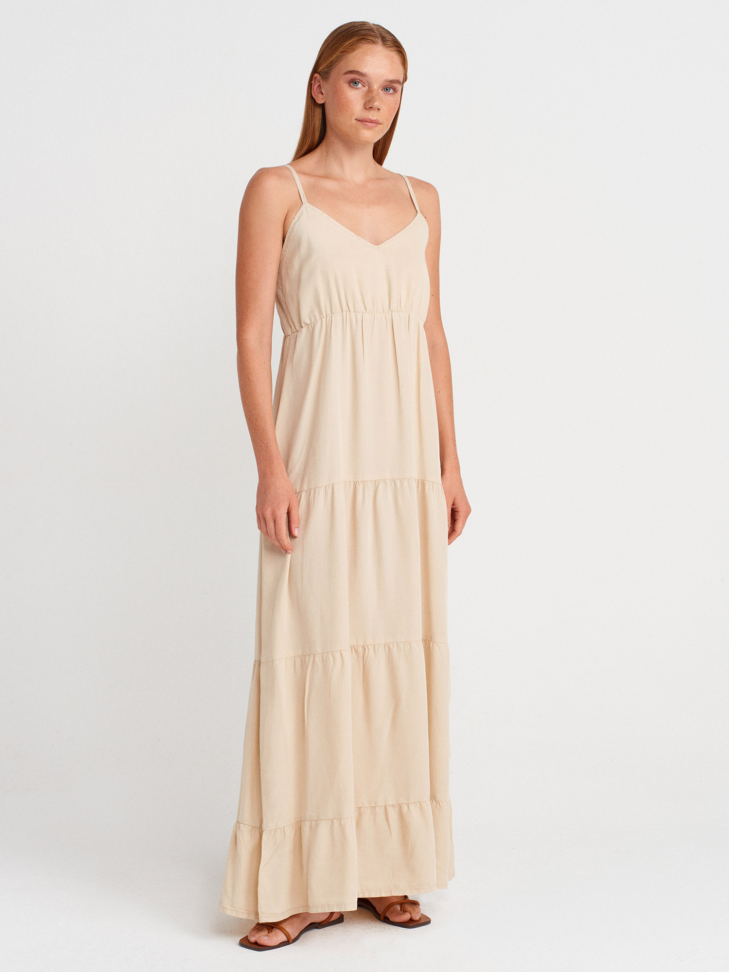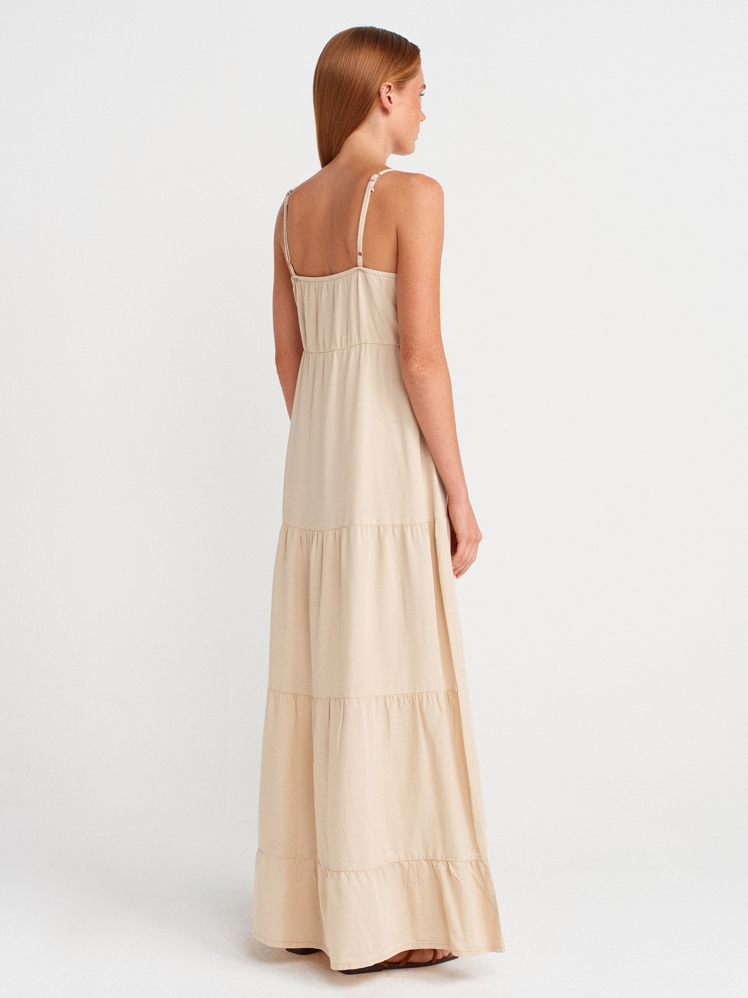 90573 Büzgülü Uzun Denim Elbise-Taş