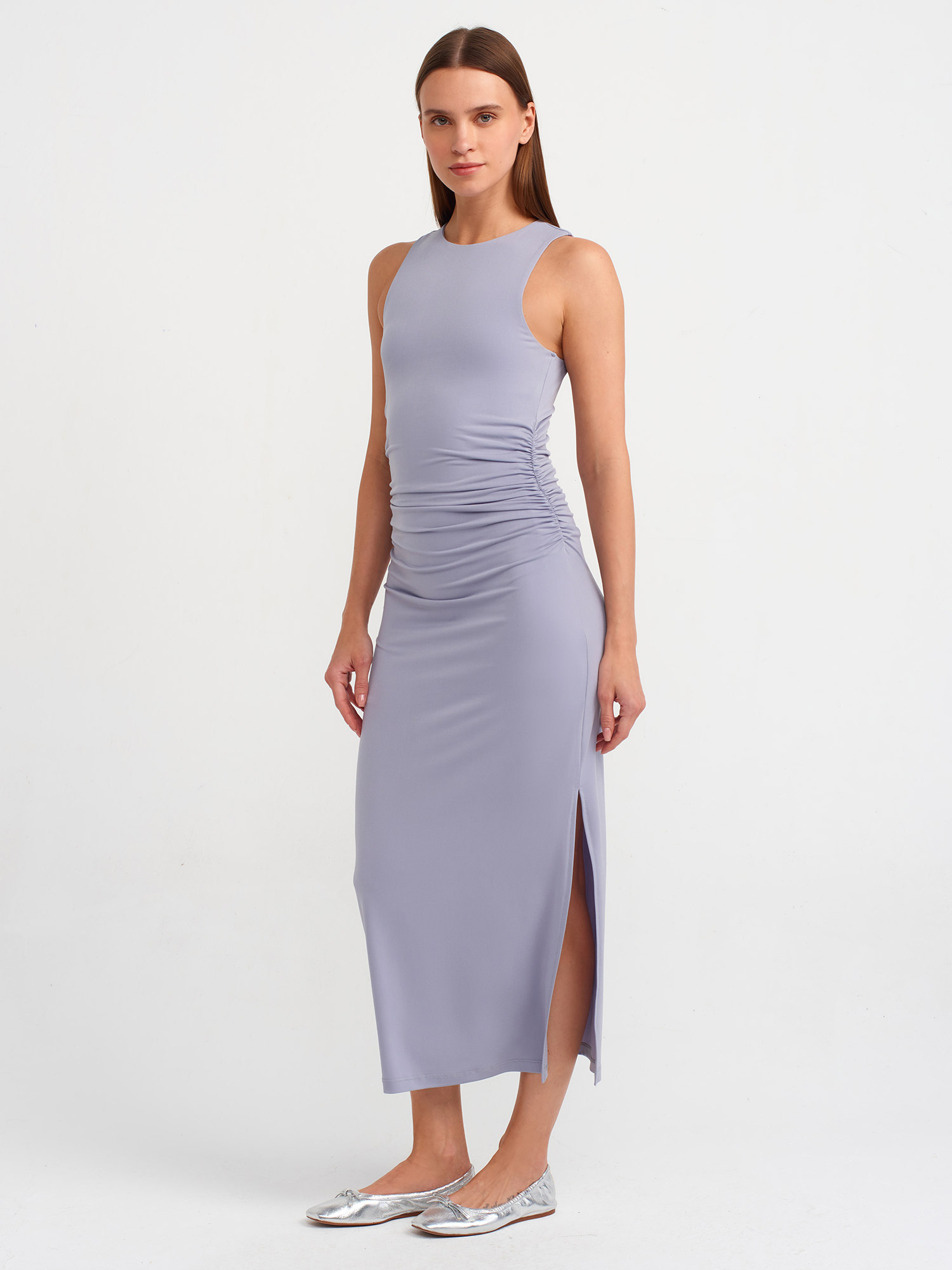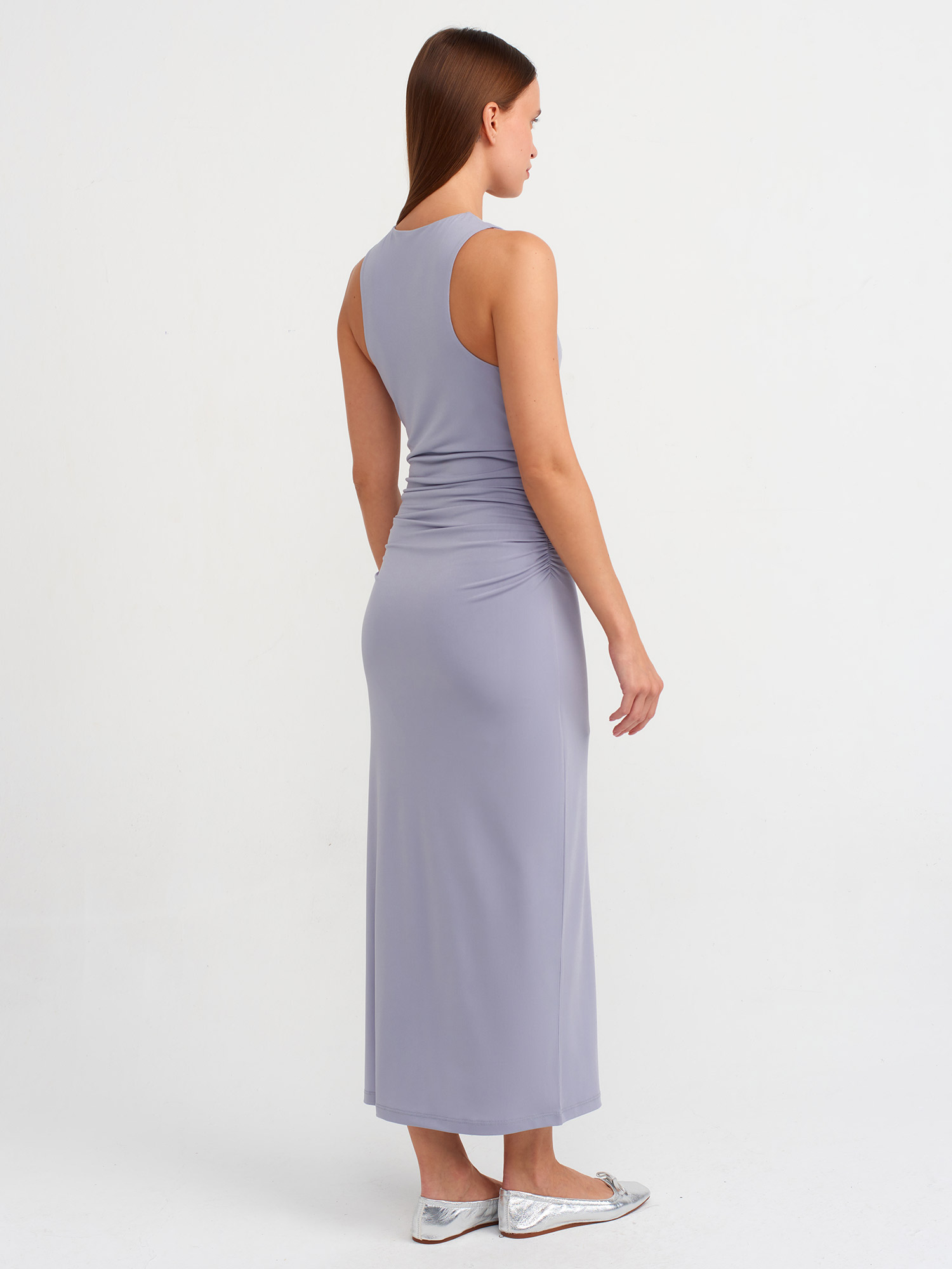 90861 Yırtmaç Detaylı Uzun Elbise-Gri