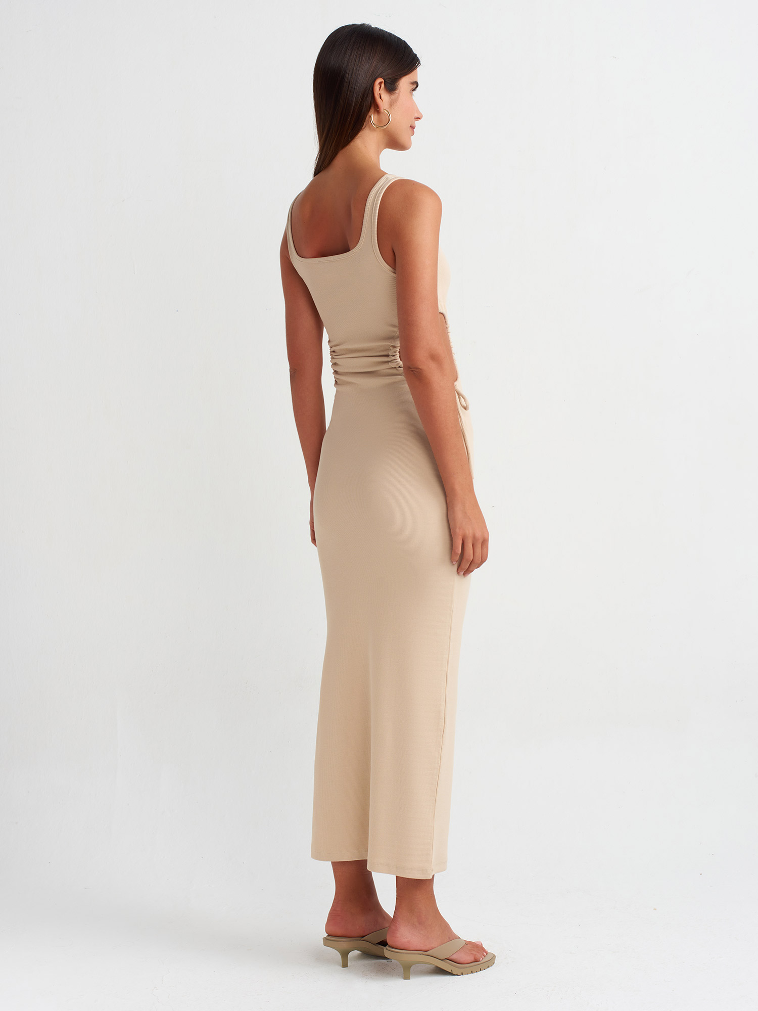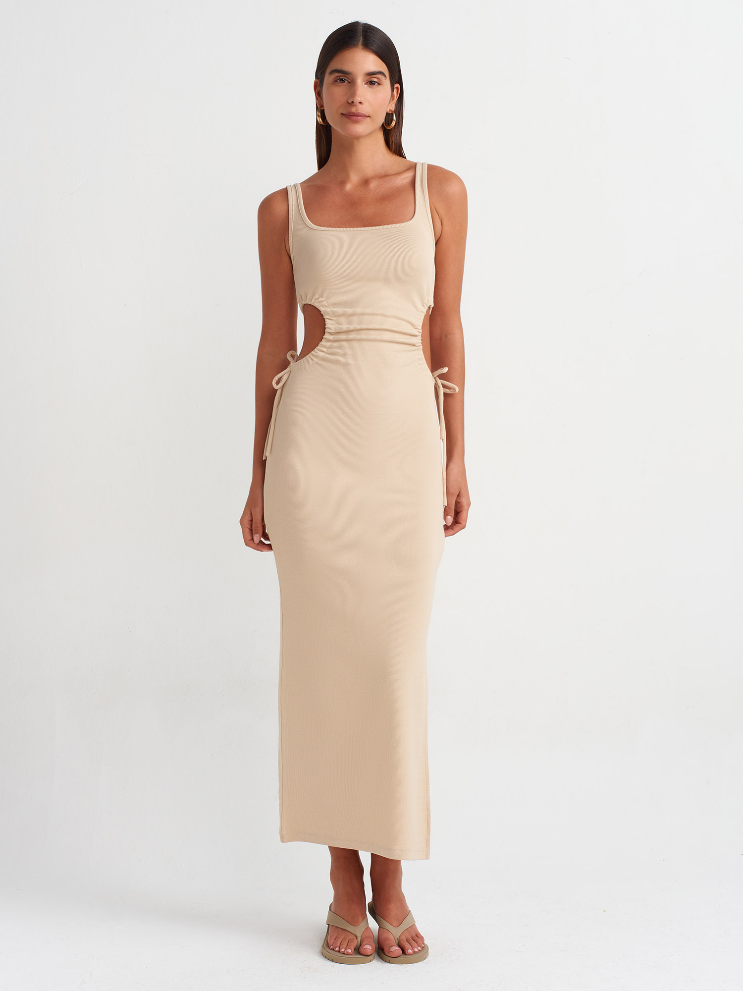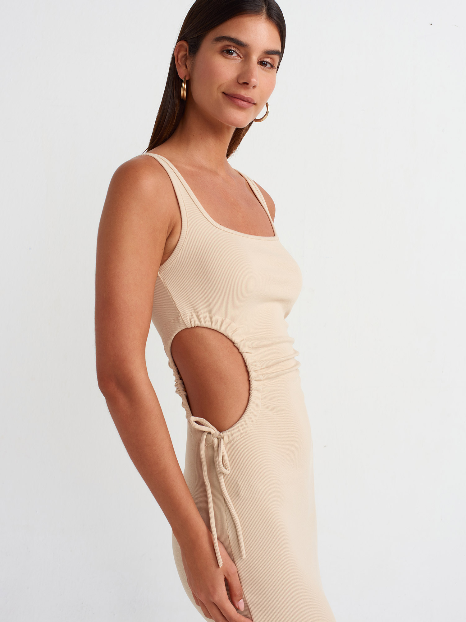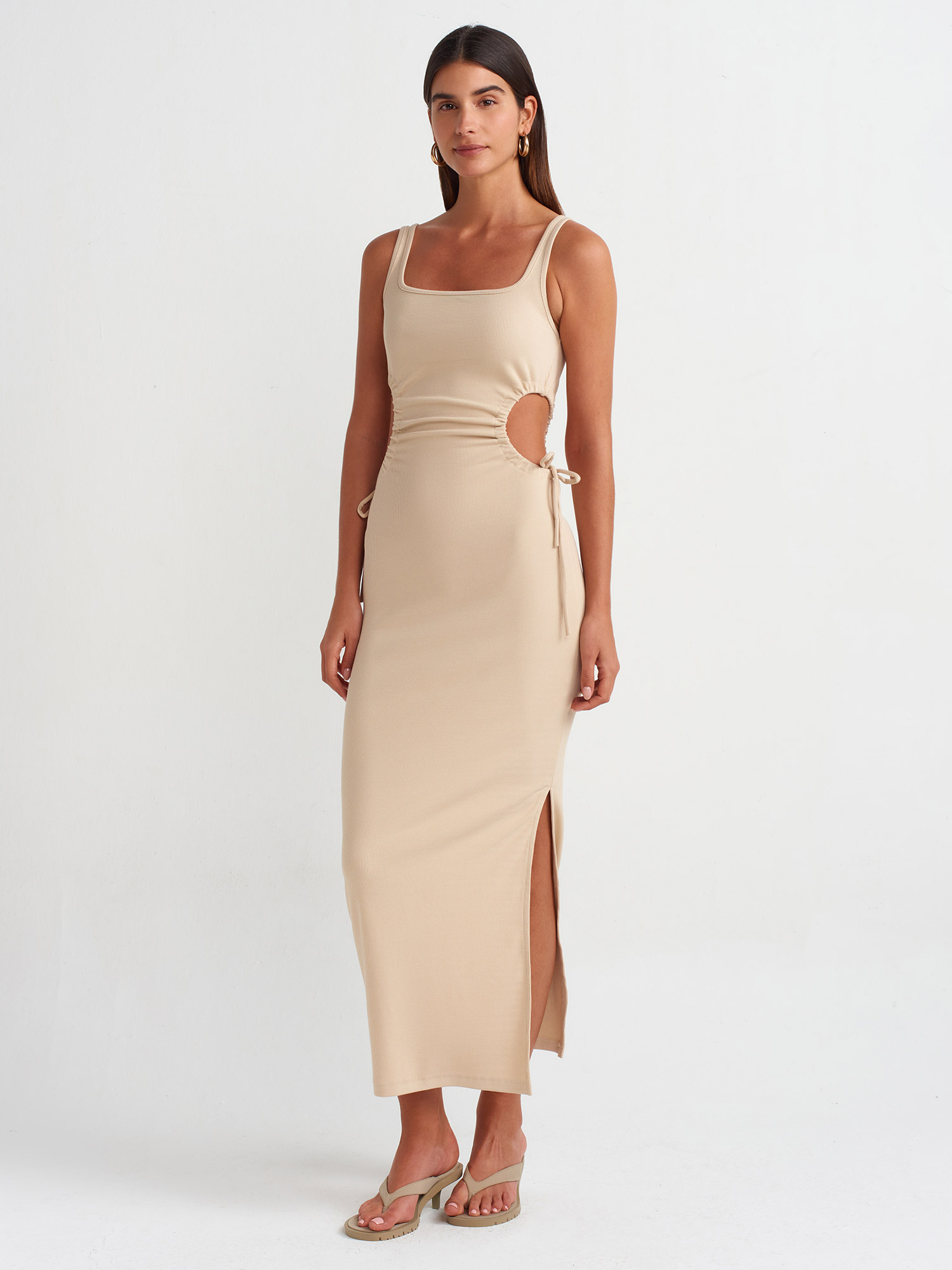 9094 Pencere Detaylı Uzun Elbise-Açık Bej