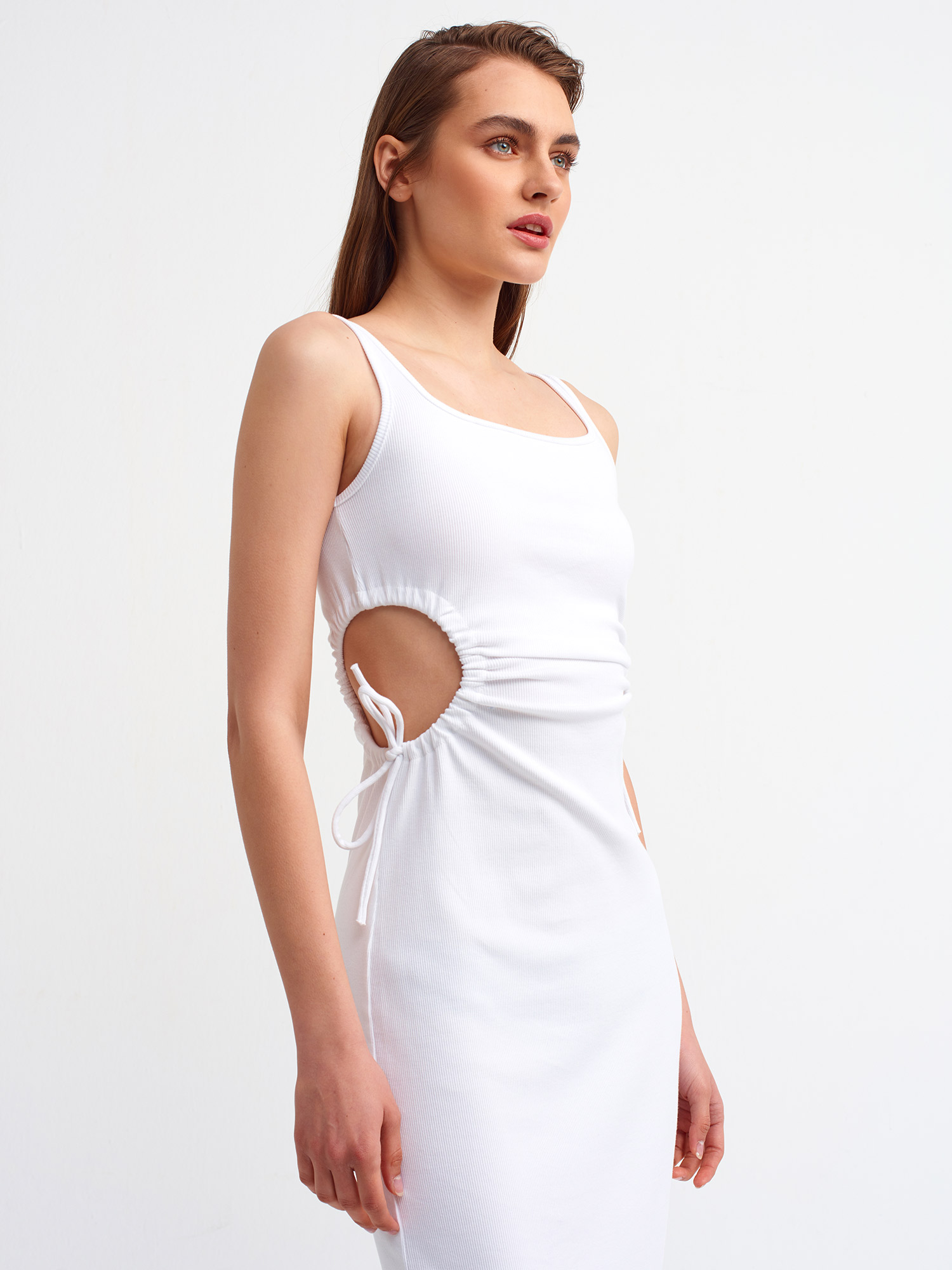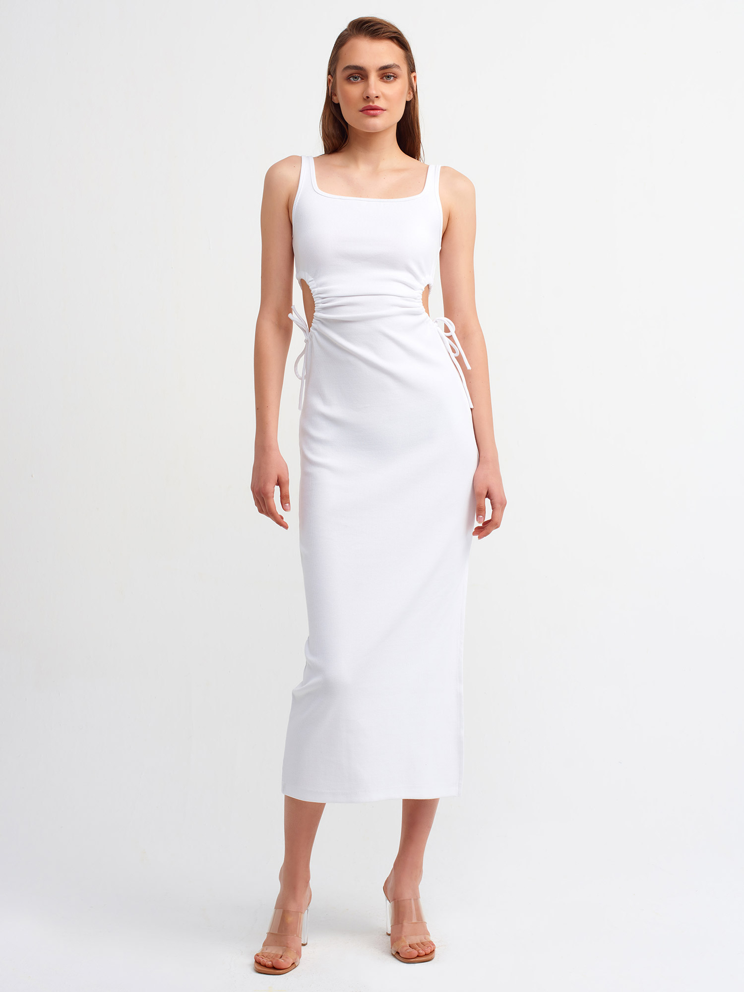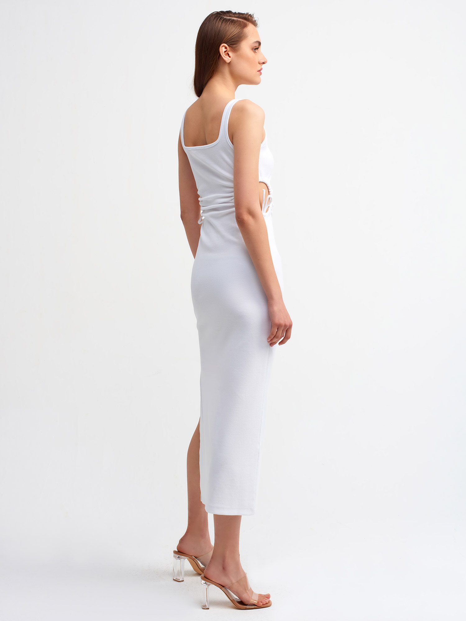 9094 Pencere Detaylı Uzun Elbise-Beyaz