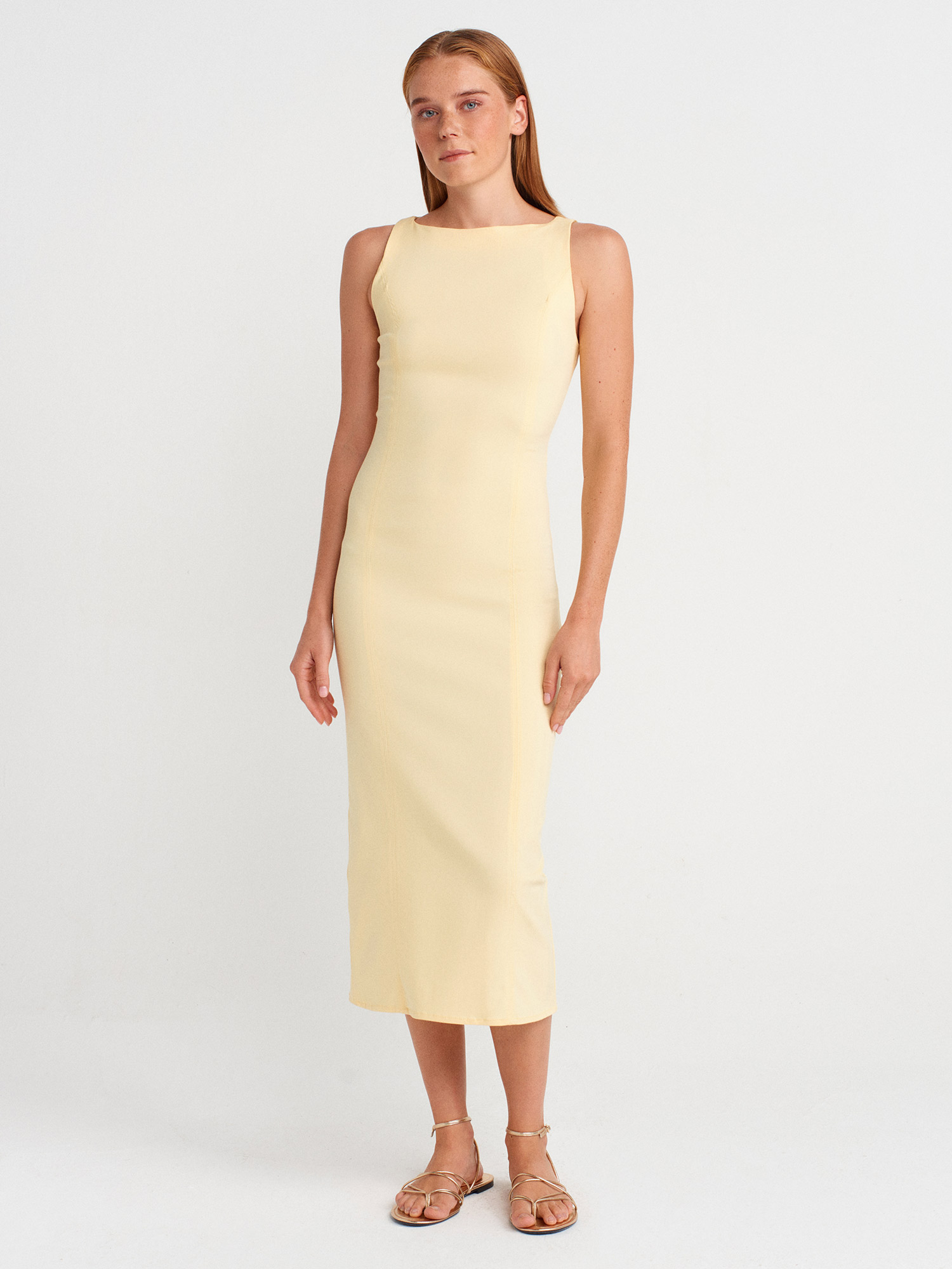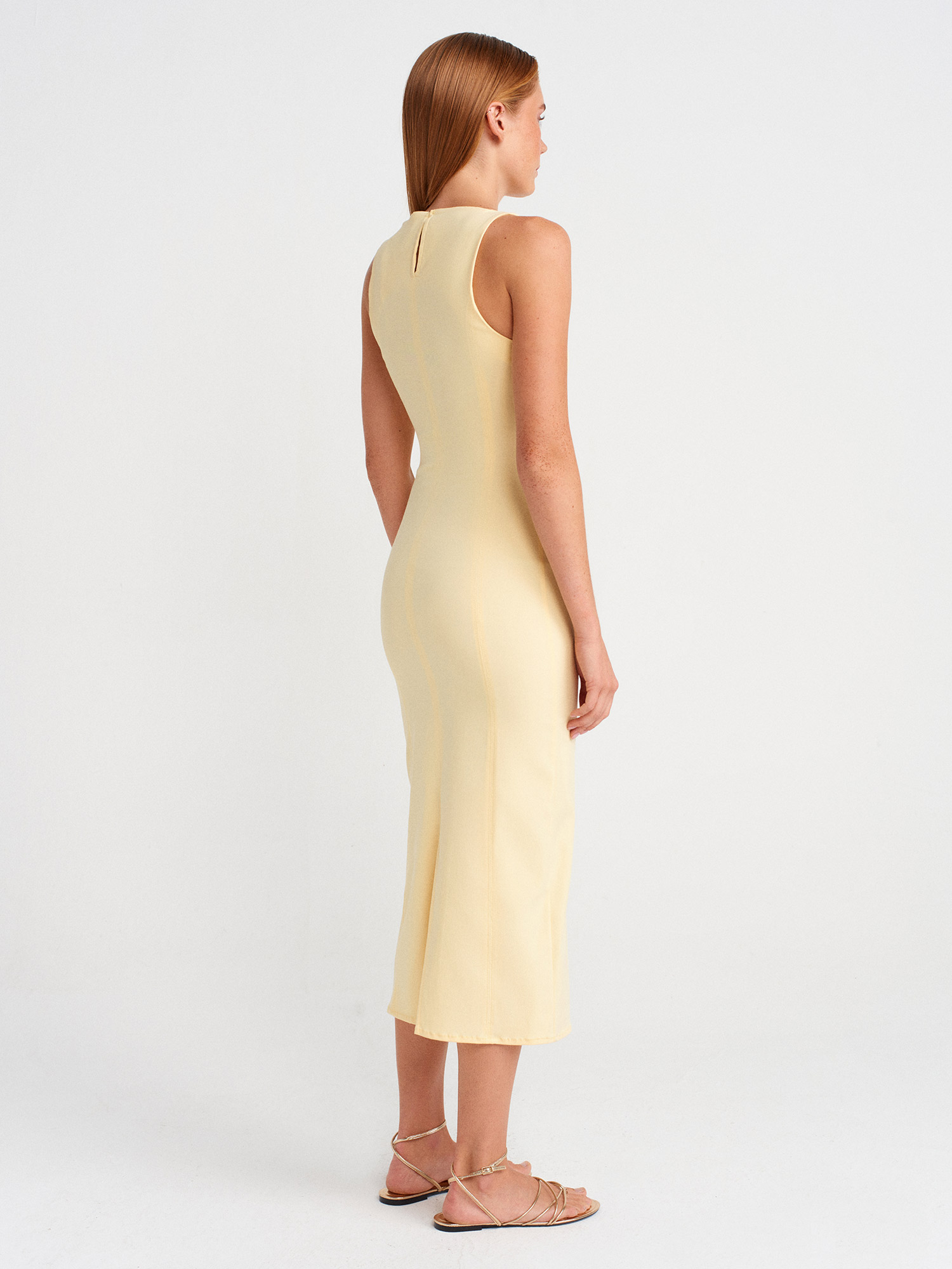 91099 Vücuda Oturan Midi Elbise-Açık Sarı