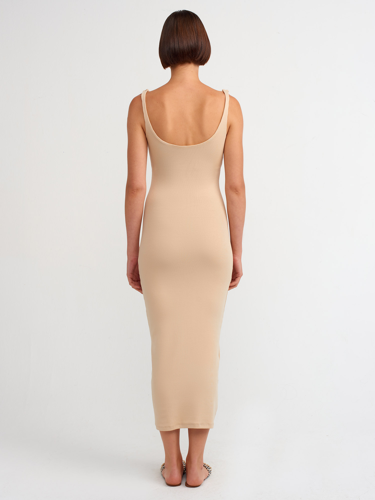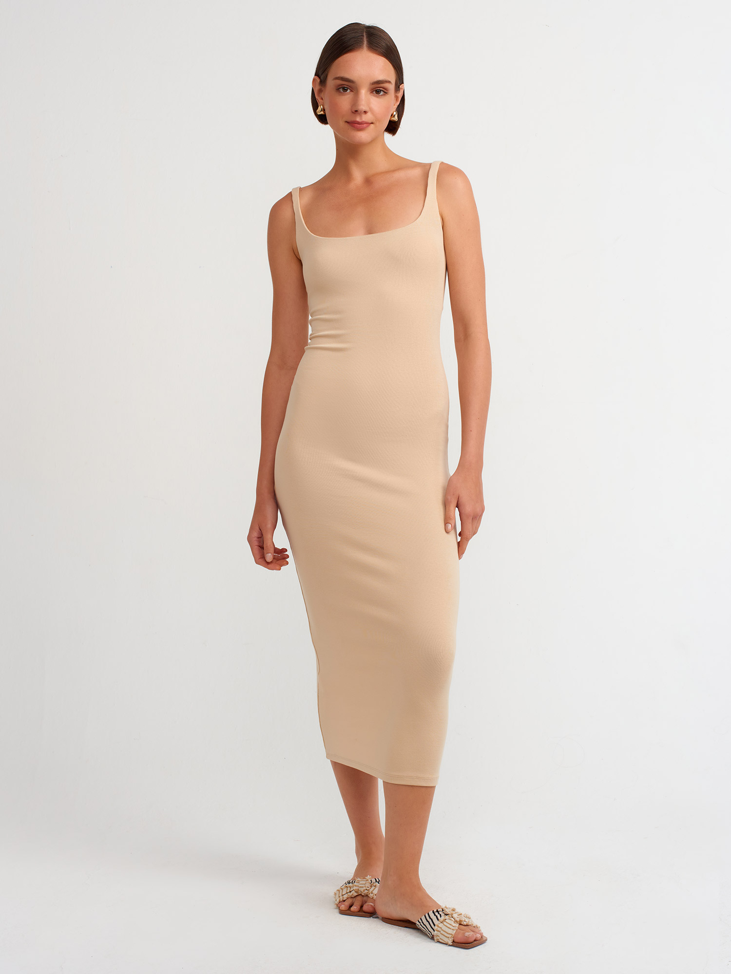 91172 Kare Yaka Midi Elbise-Açık Bej