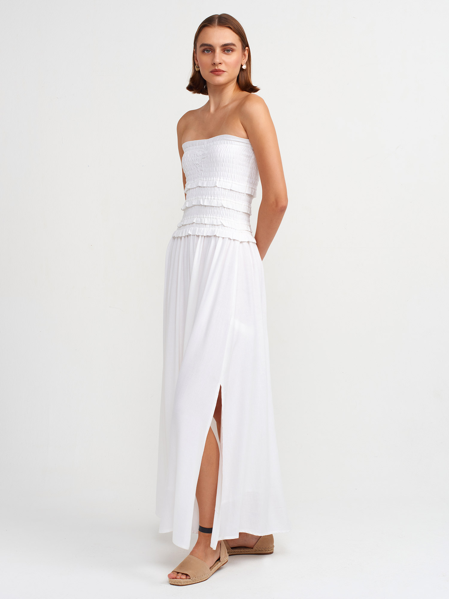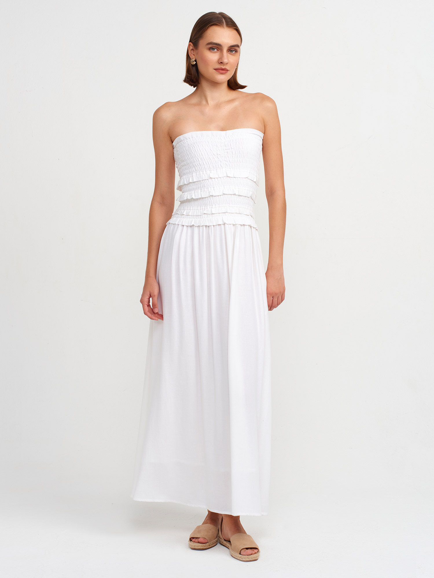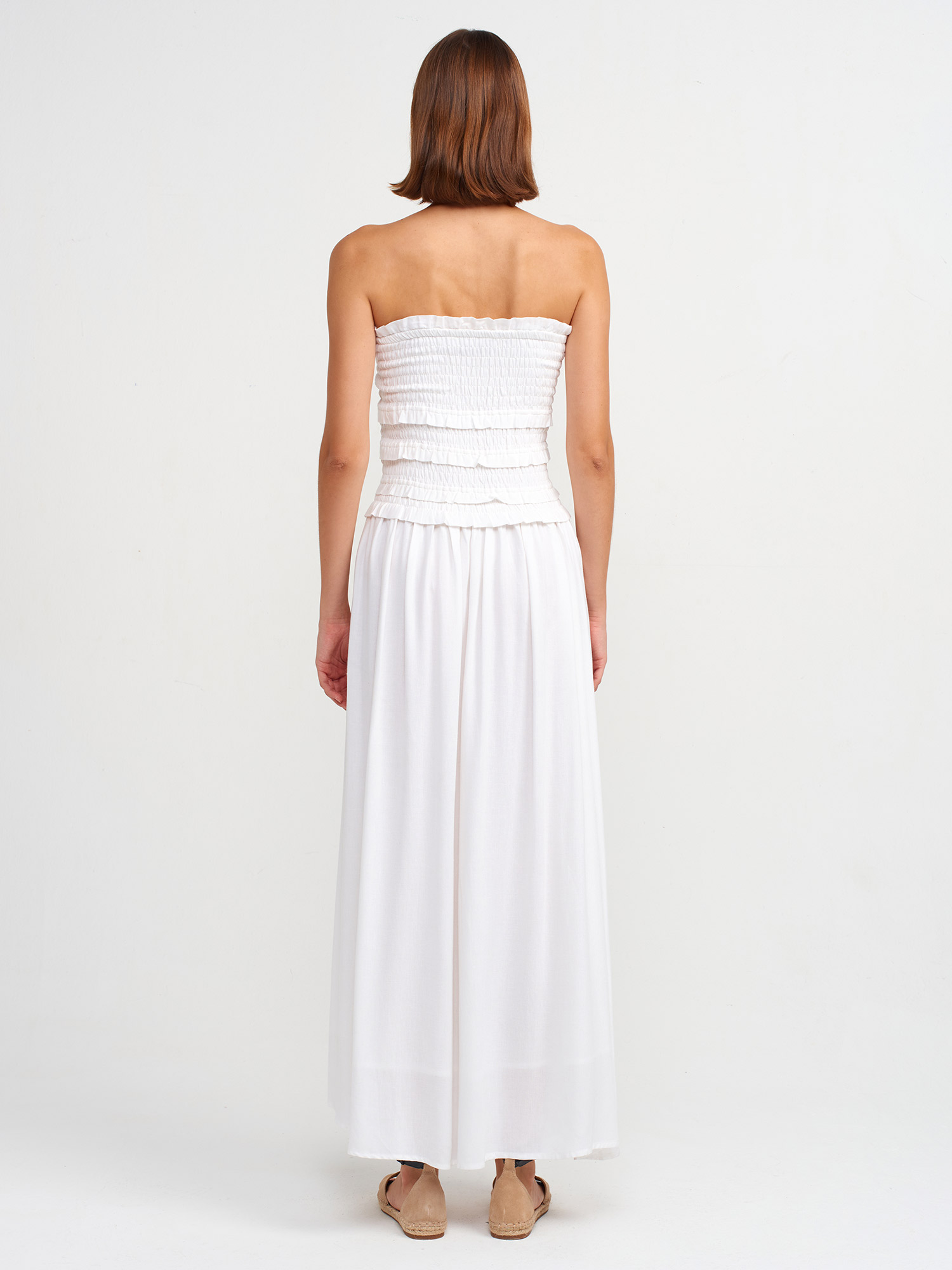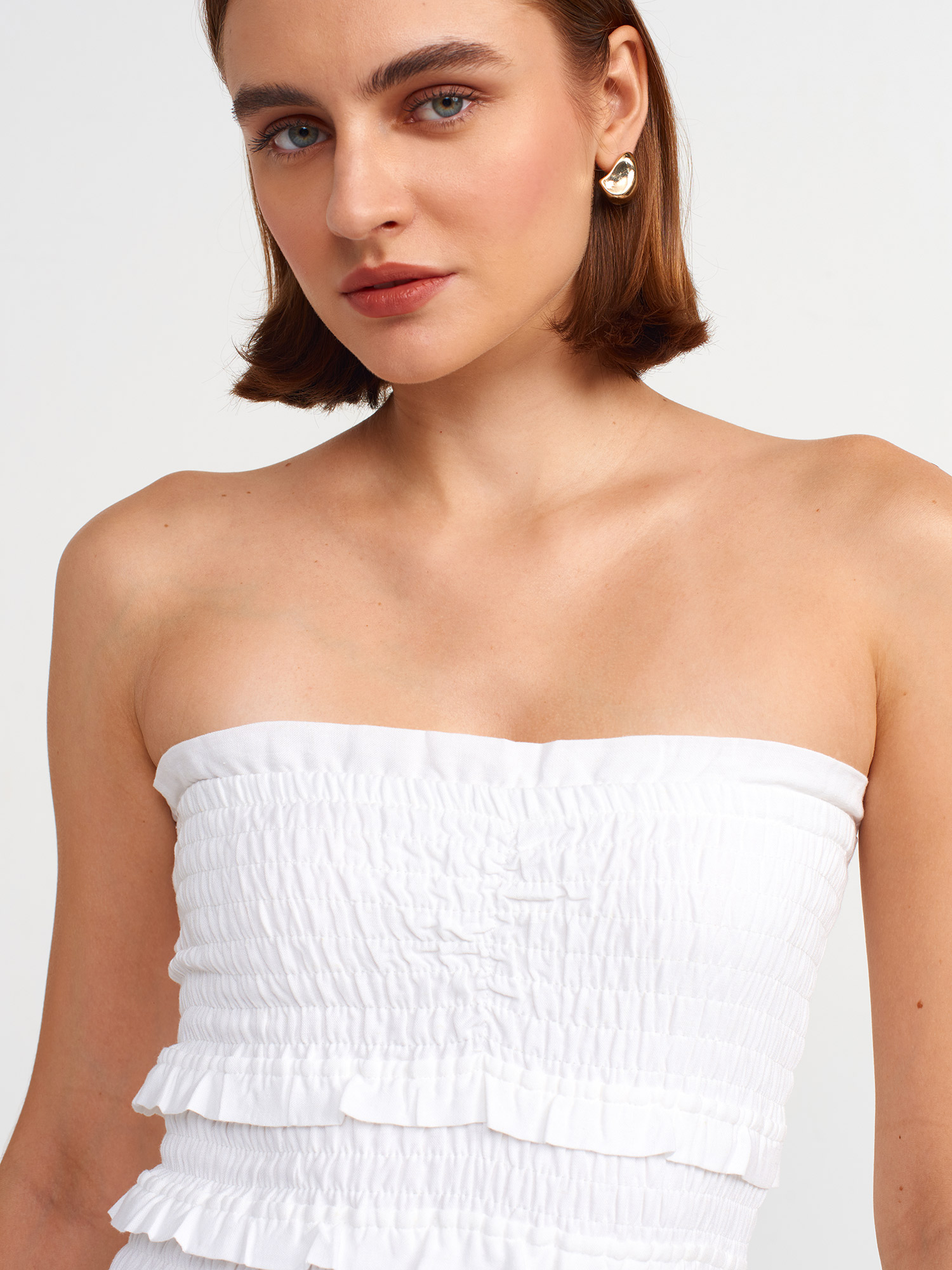 91220 Gipe Detaylı Straplez Elbise-Beyaz