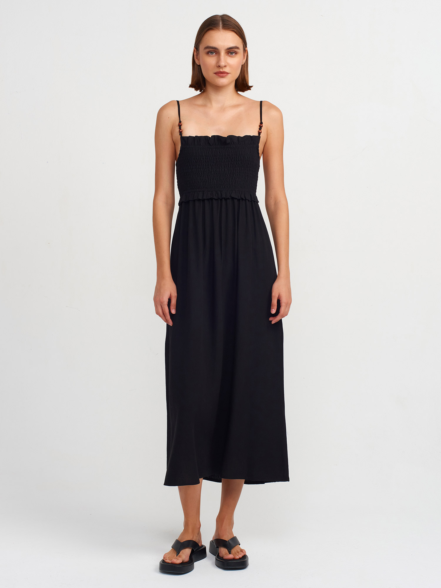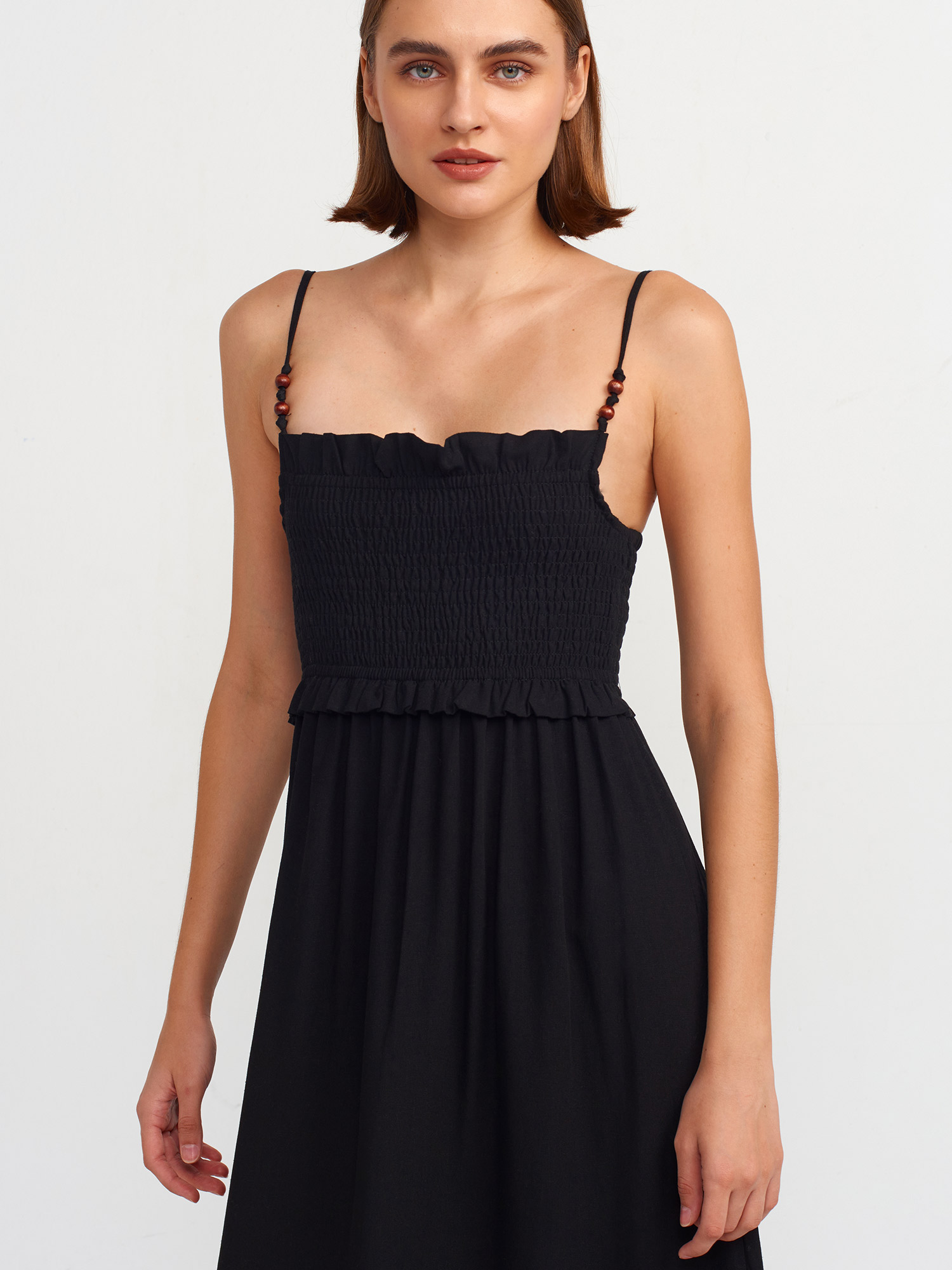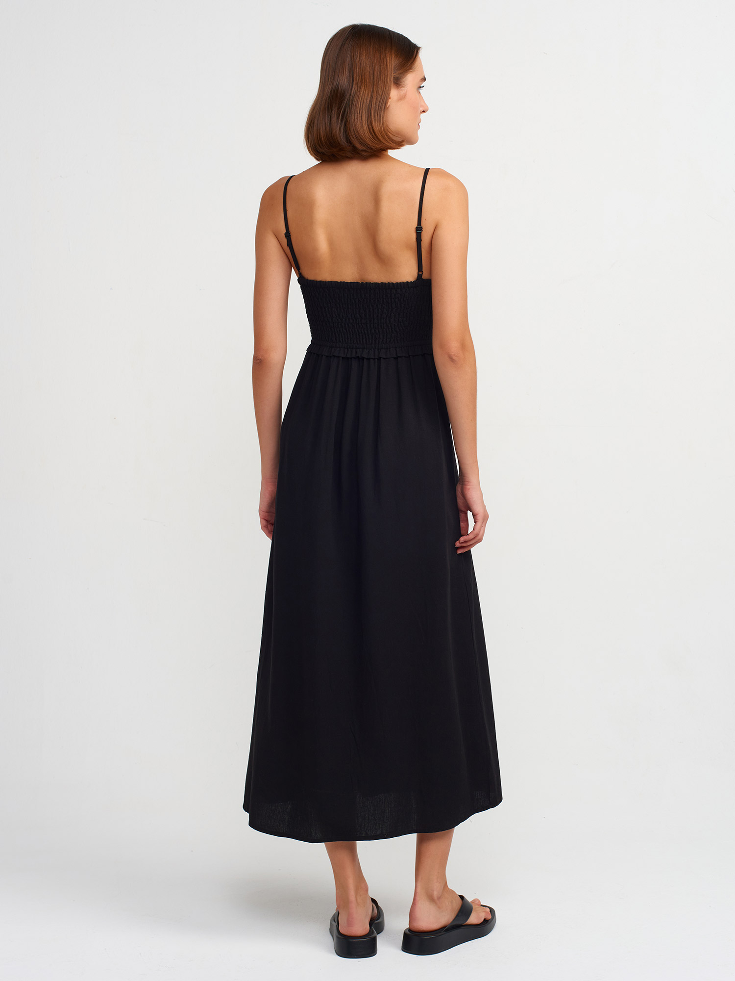 91233 Büzgü Detaylı Midi Elbise-Siyah