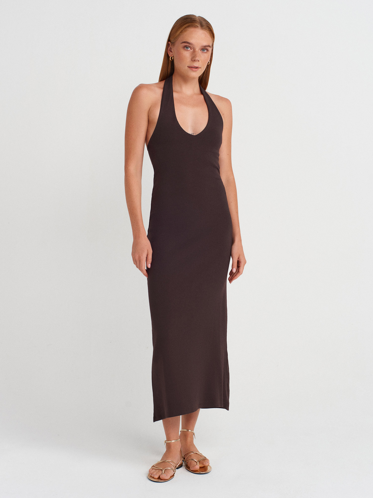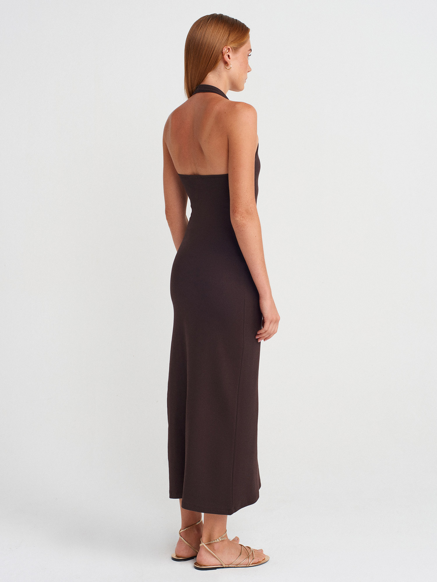91476 Halter Yaka Midi Elbise-Koyu Kahve