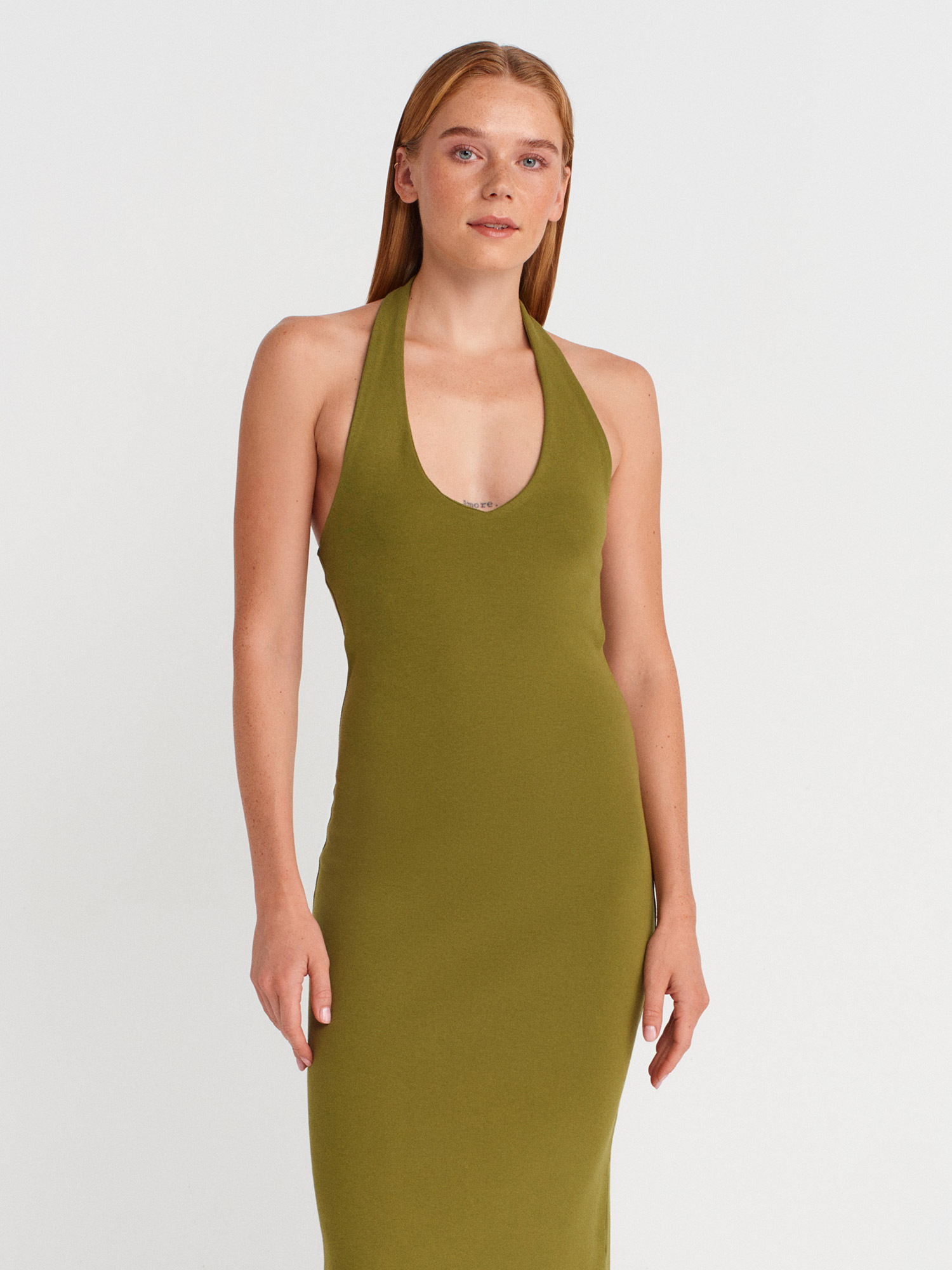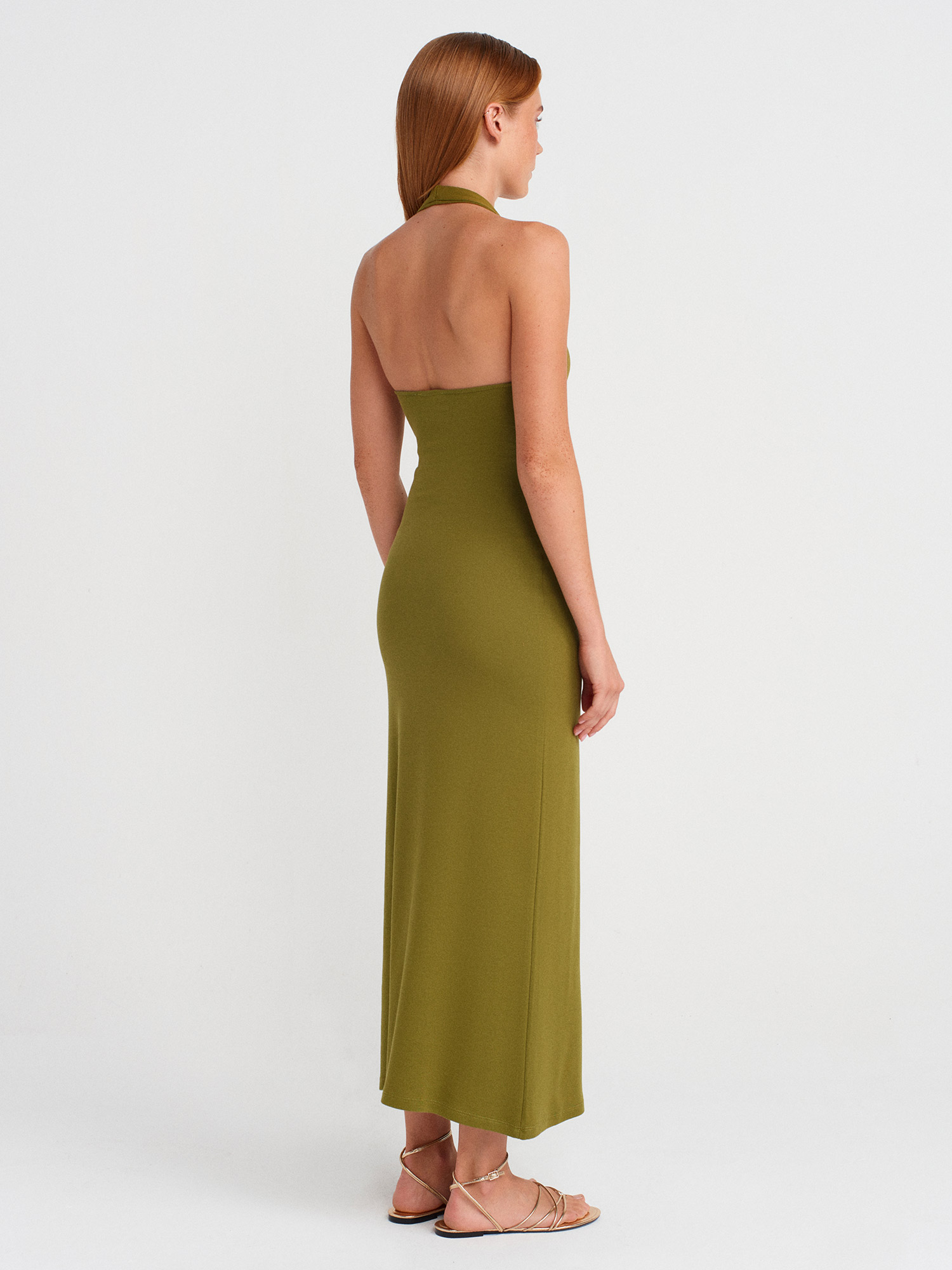 91476 Halter Yaka Midi Elbise-Yağ Yeşil