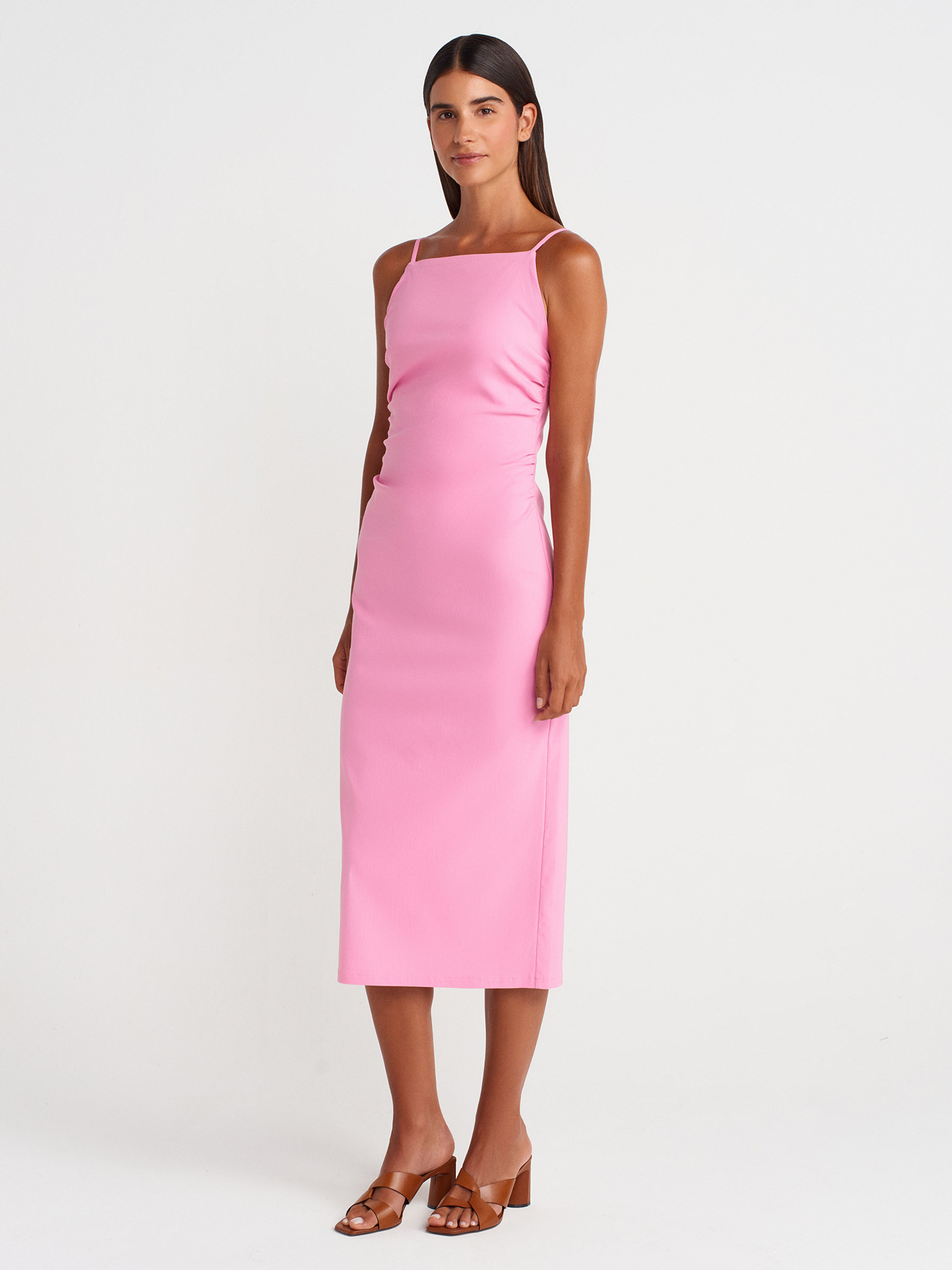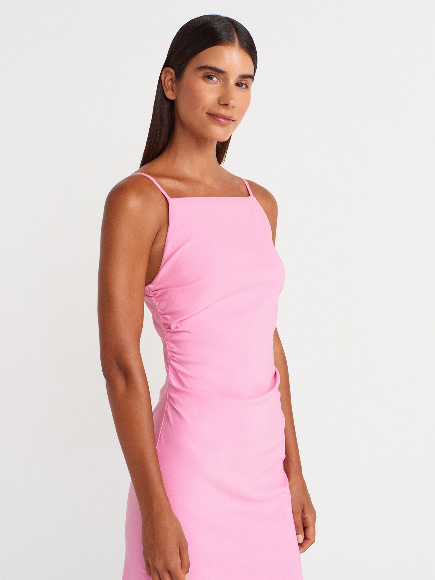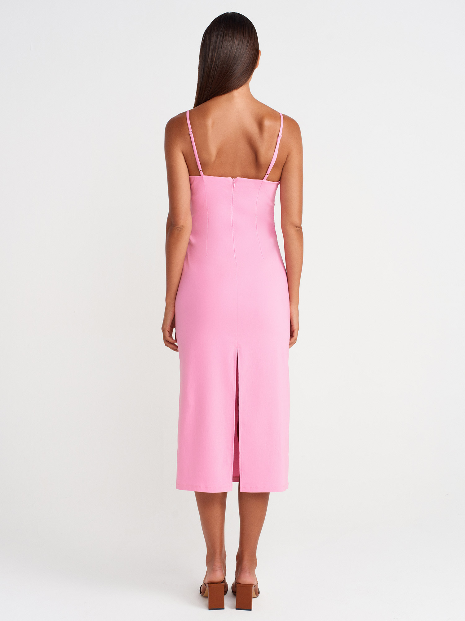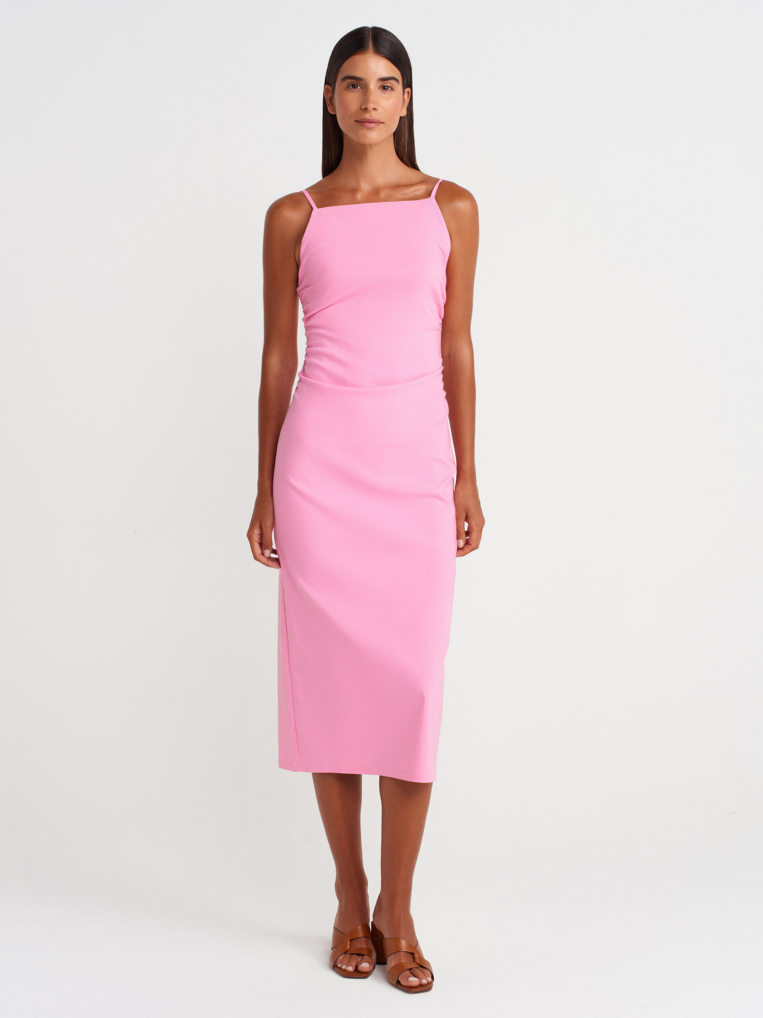 91479 Büzgülü Midi Elbise-Pembe