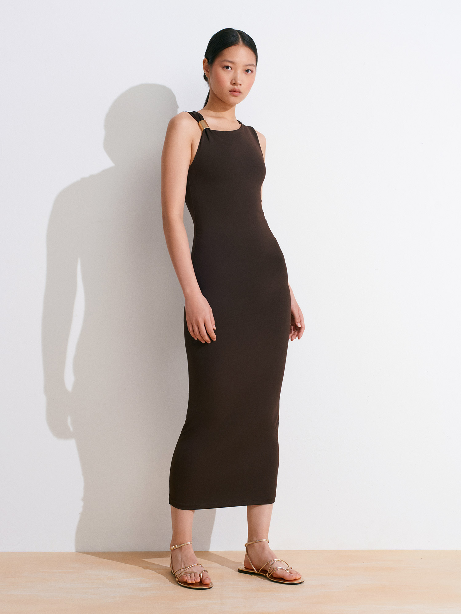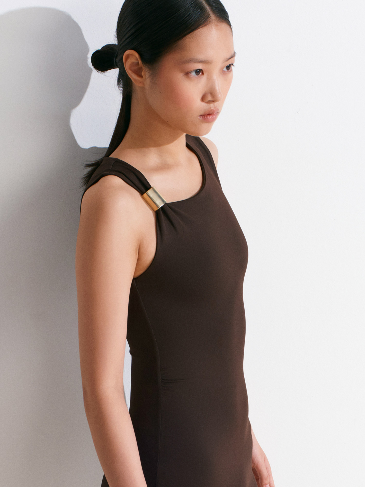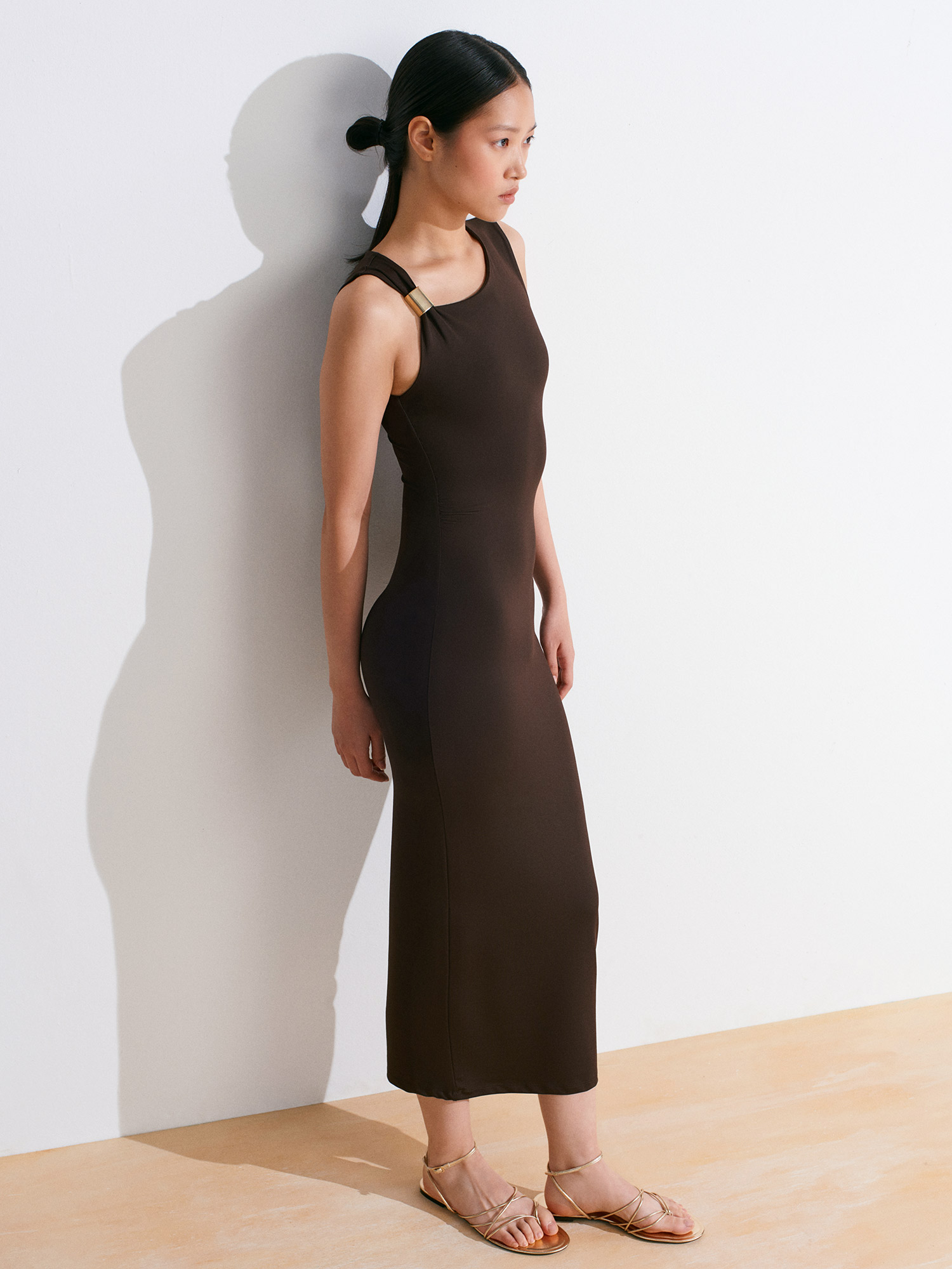 91493 Aksesuar Detaylı Asimetrik Elbise-Koyu Kahve