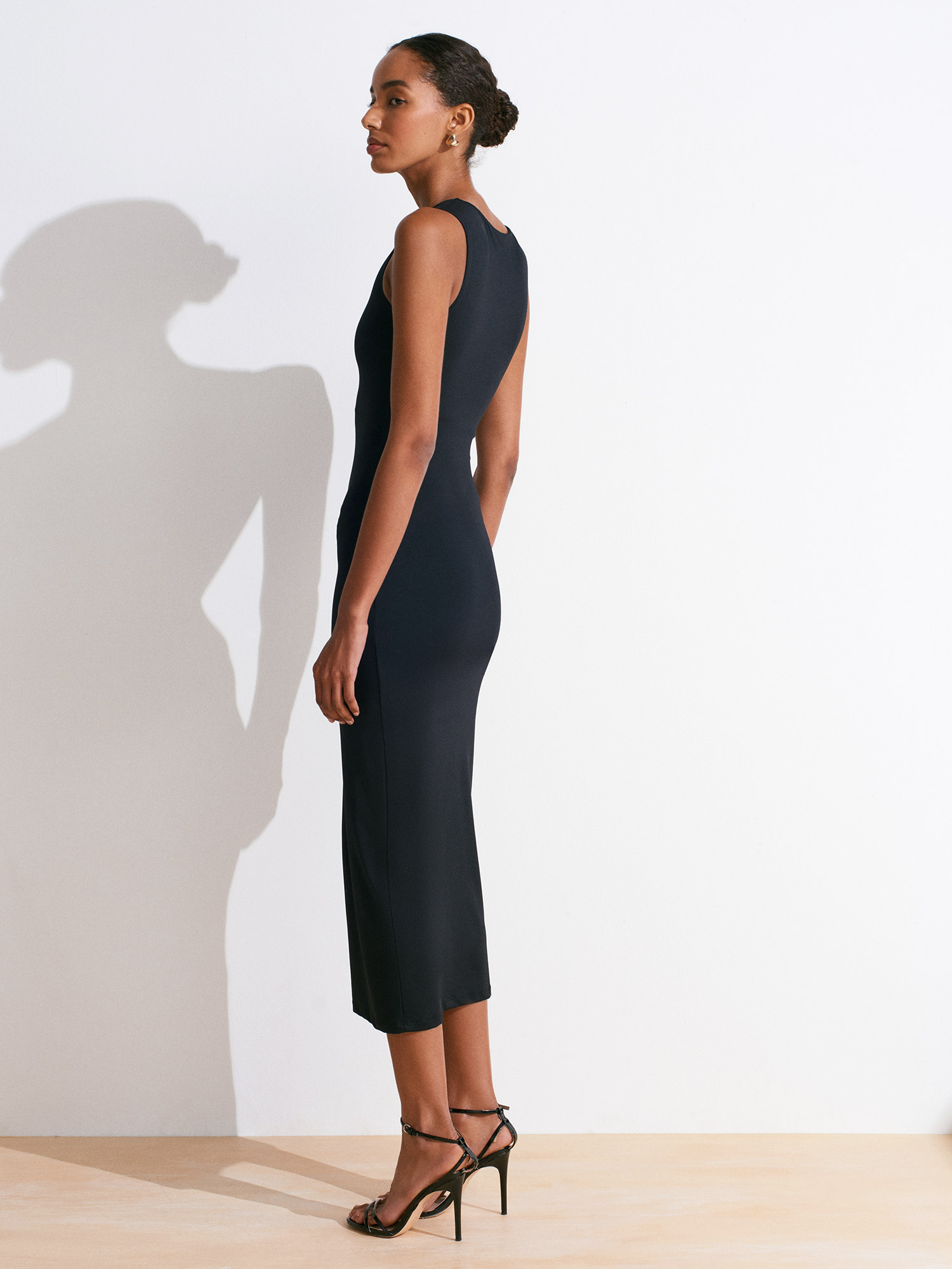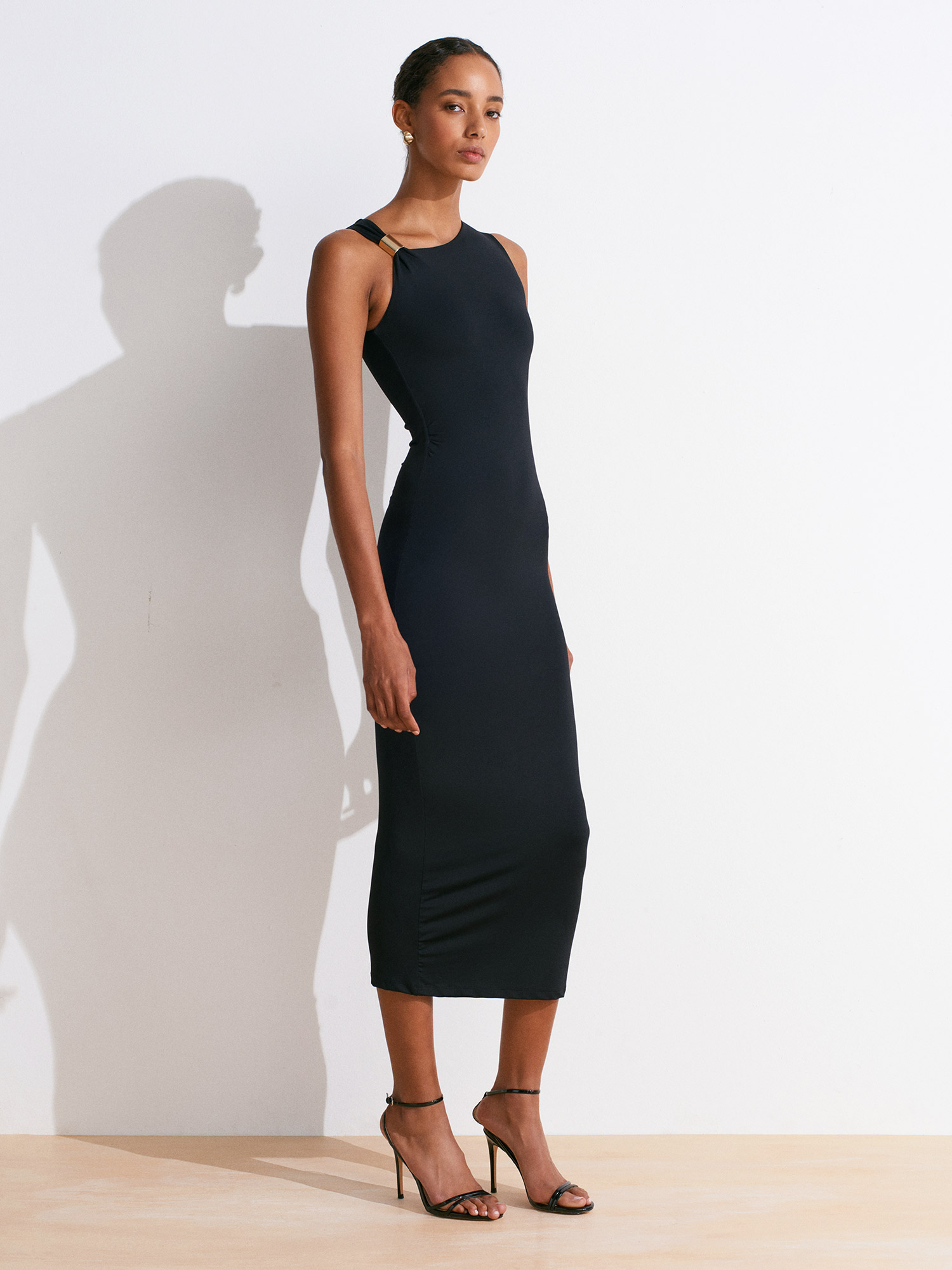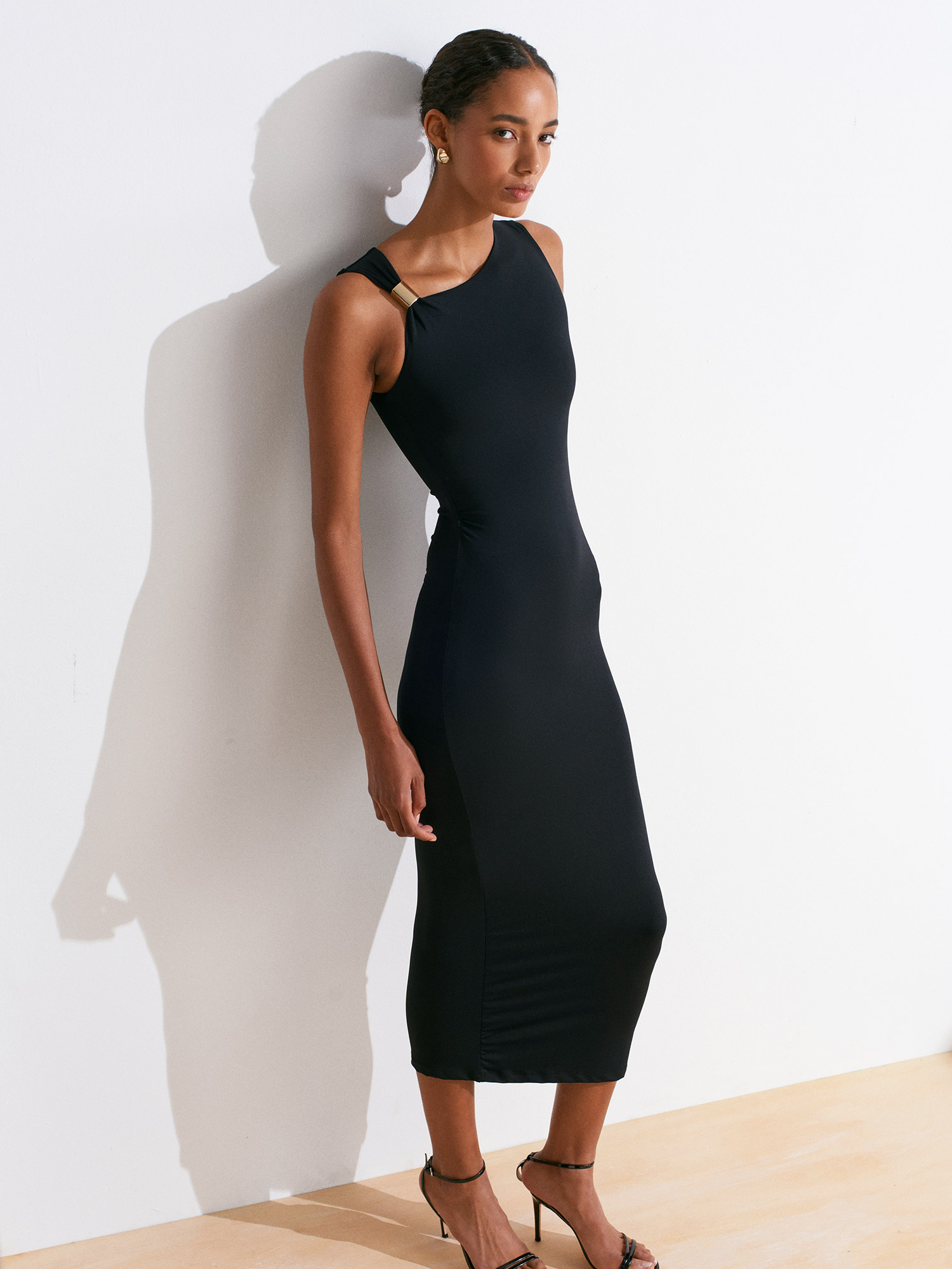 91493 Aksesuar Detaylı Asimetrik Elbise-Siyah
