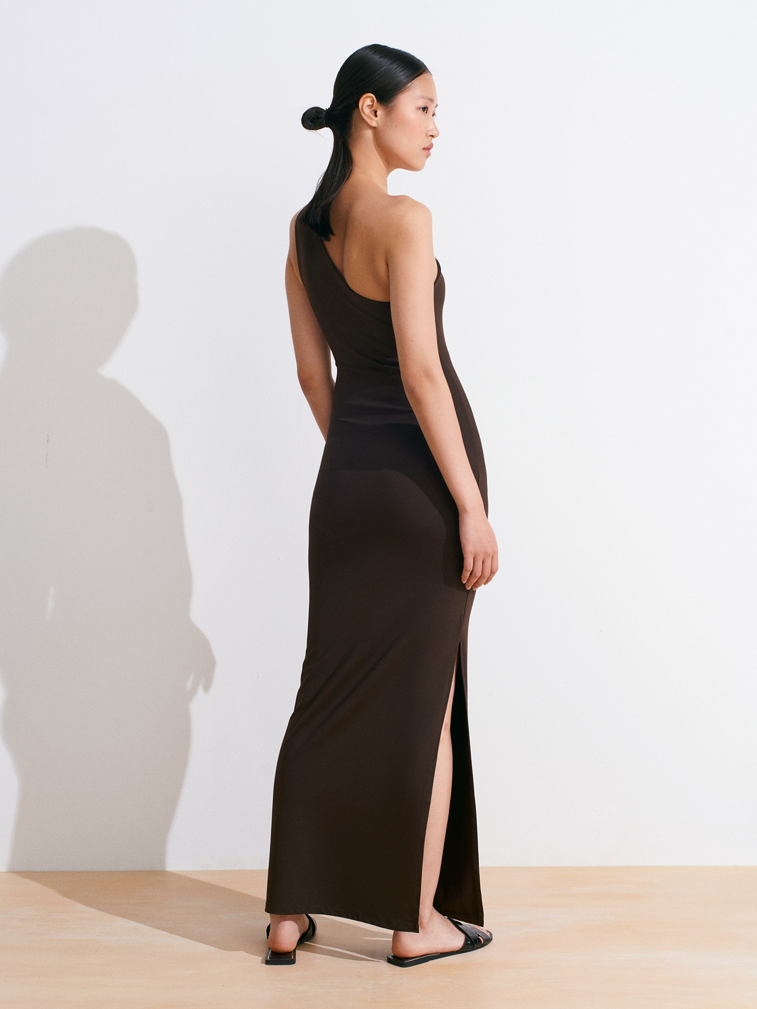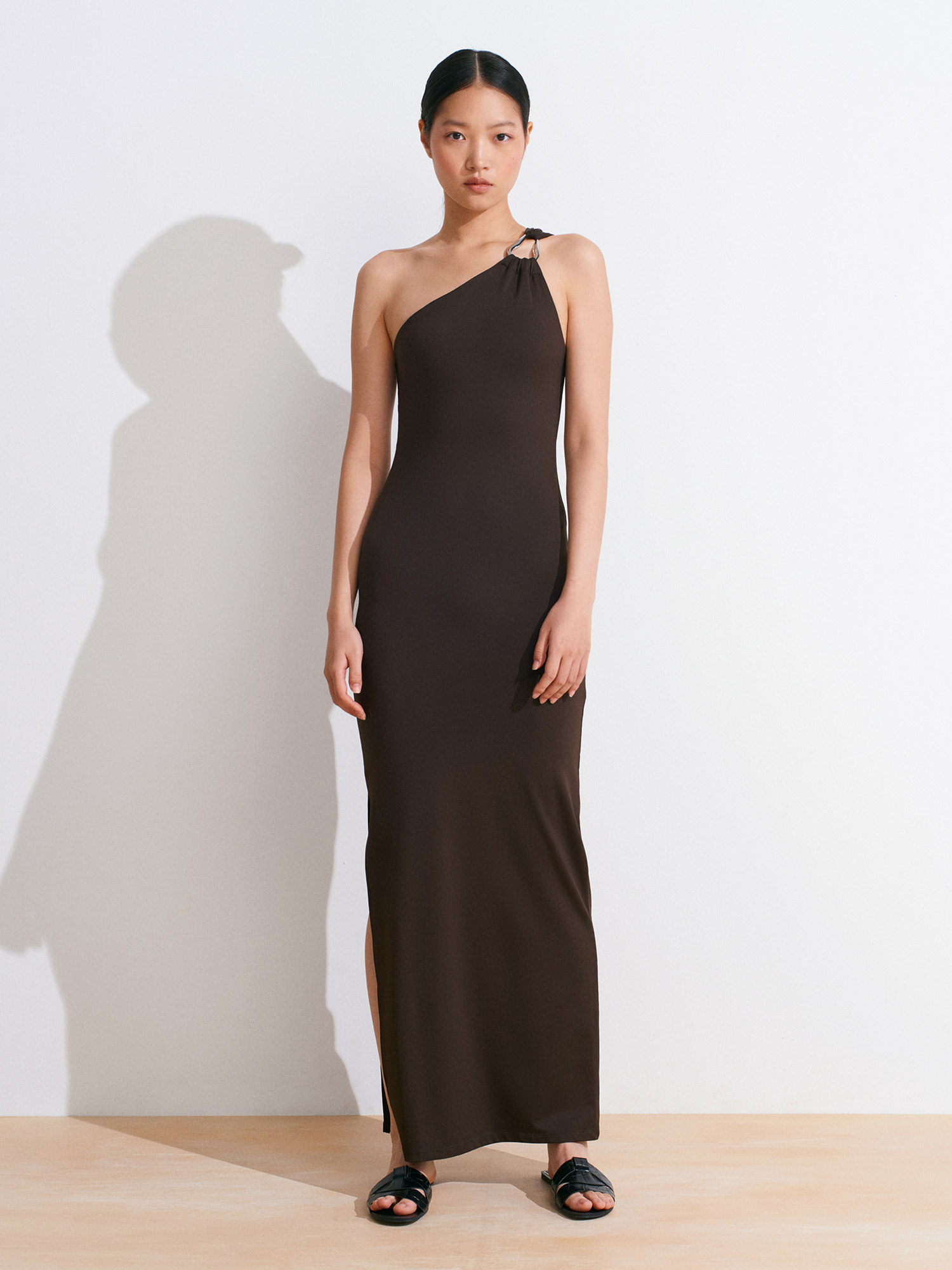 91494 Aksesuar Detaylı Uzun Elbise-Koyu Kahve