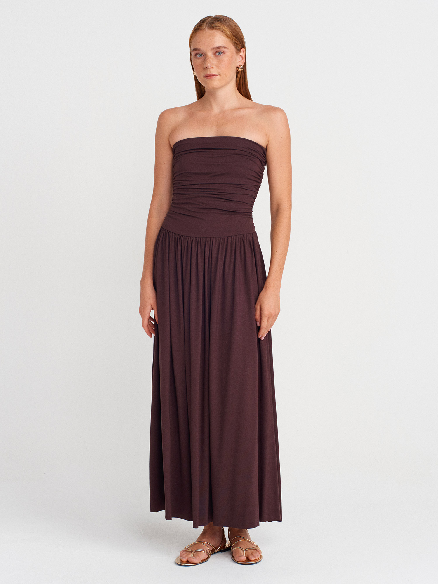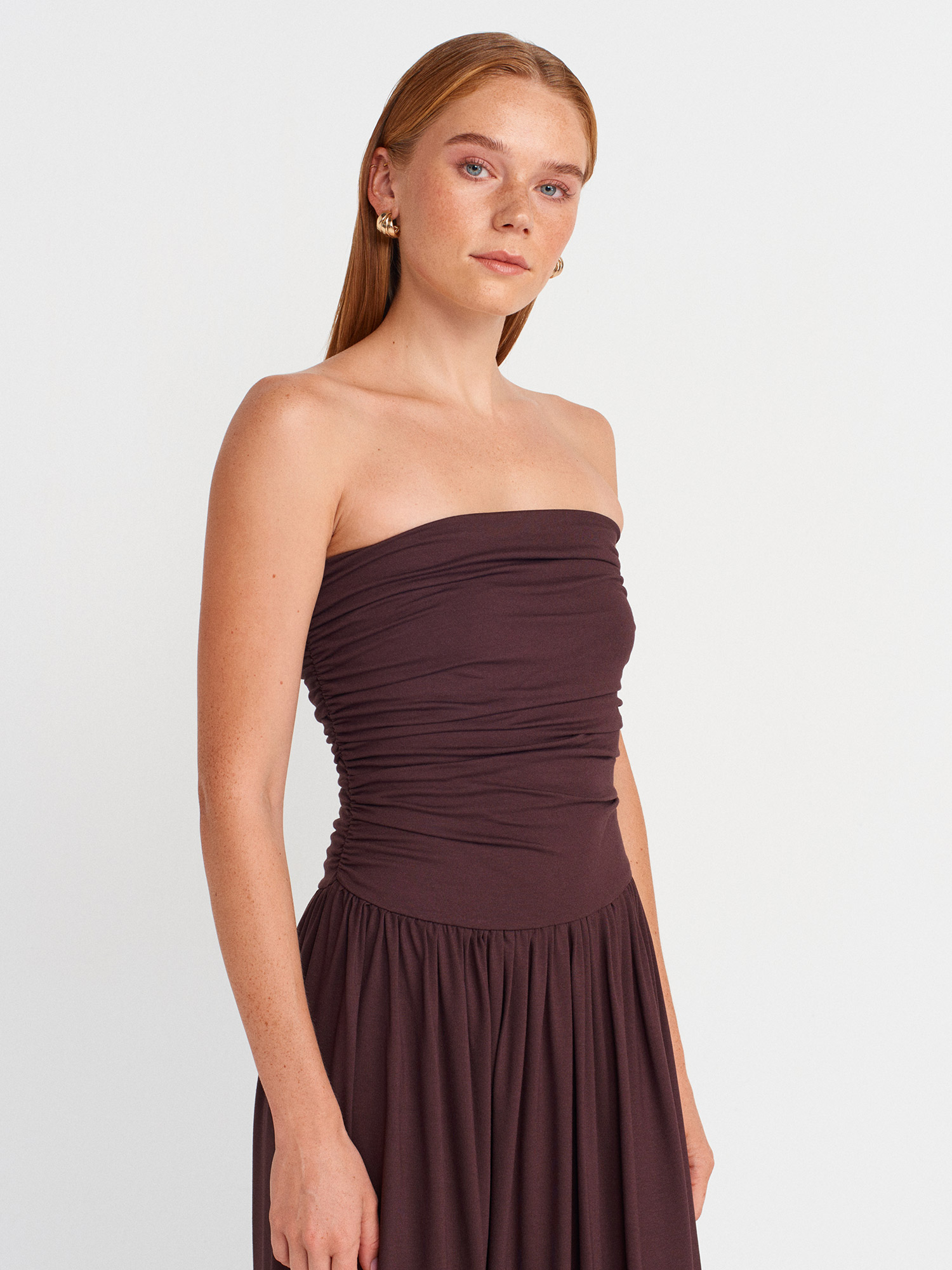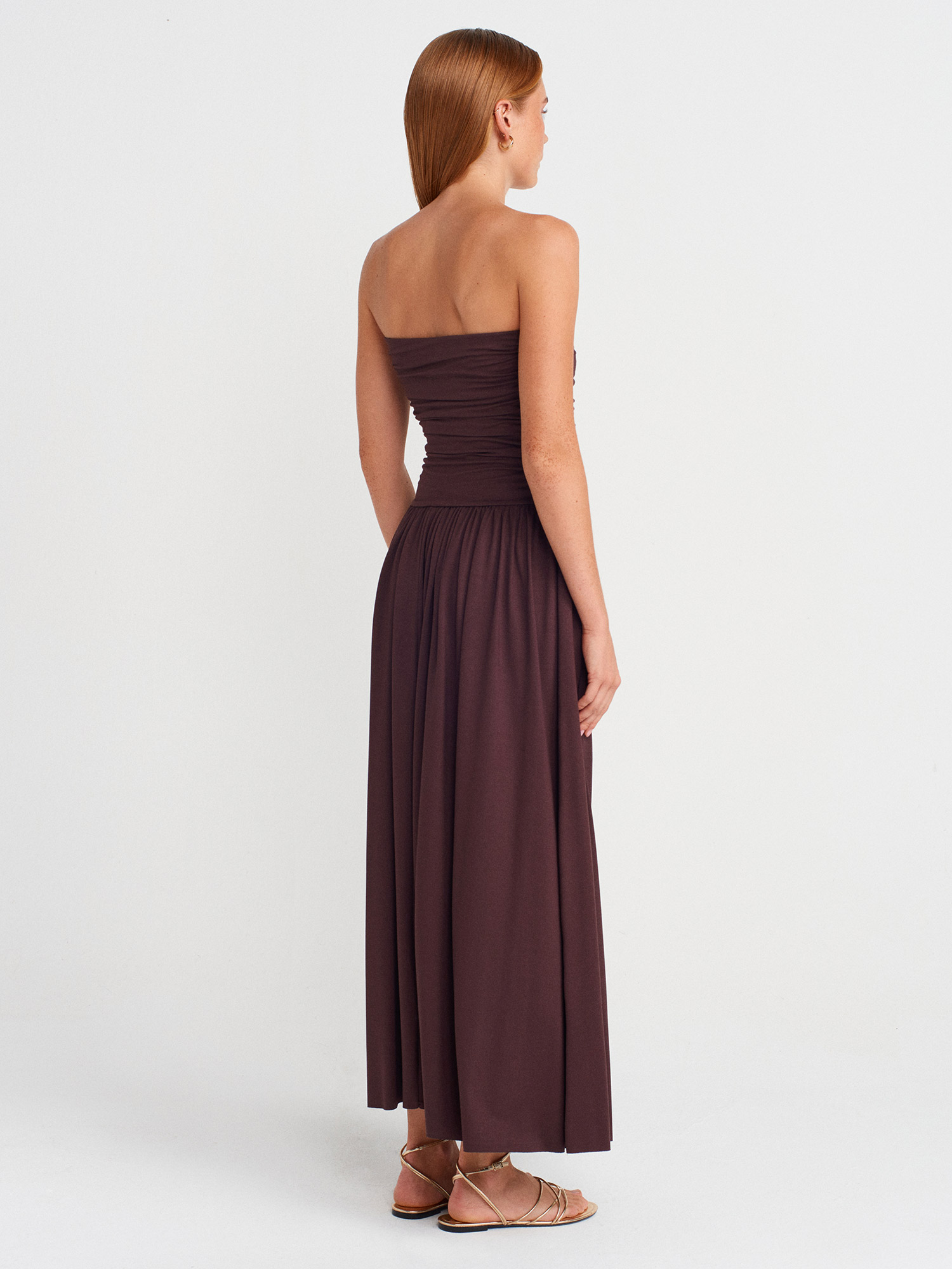 91496 Straplez Büzgülü Elbise-Kahve